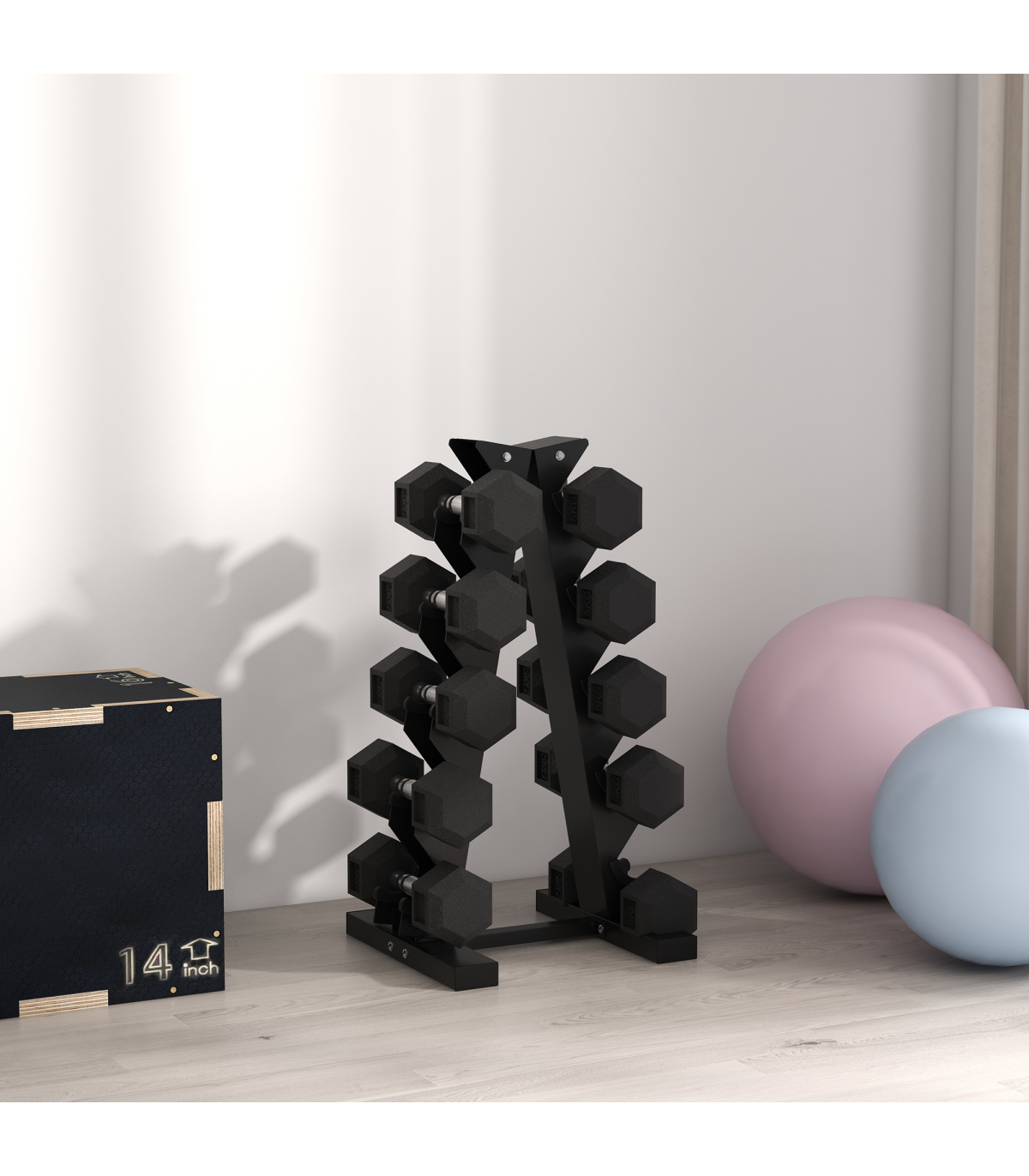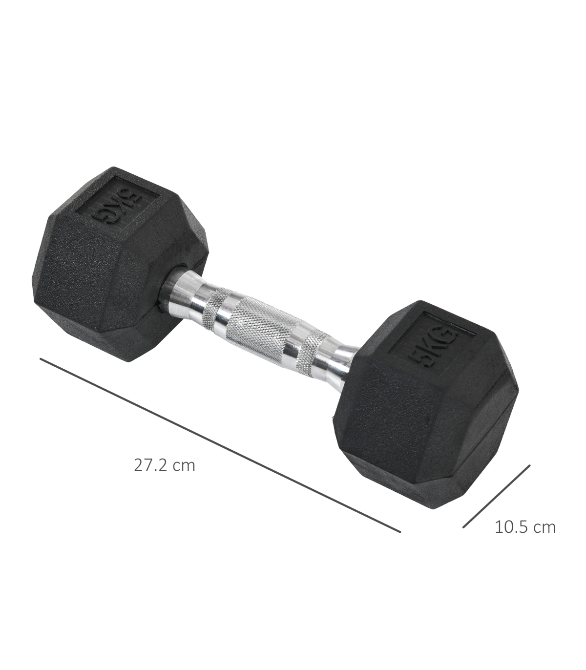 - "Hexagonal Dumbbells Kit Weight Lifting Exercise for Home Fitness 2x5kg HOMCOM" - Description: - Hexagon: The hexagonal design prevents rolling so that you can perform fitness movements in a safer condition. - Multi-Scenario: Due to its compact size, the product is easy to carry and suitable for home, gym, or office exercise. - Versatile: Dumbbells offer the ability to target specific muscle groups or achieve a full-body workout. They help burn calories faster, increase endurance and strength, leading to a healthier body. - Exquisite Design: Delicate knurling on the handles enhances essential grip and security during use. - Dimensions: - Weight of 2 dumbbells: 2 x 5kg - Length of handles: 12.8cm - Hexagon Size: 10.5cm (Diagonal) - Note: We suggest using it on a rubber mat or fitness mat to protect your floor and products from damage. - Related Products: A93-035 (ASIN B07N66L5JB)