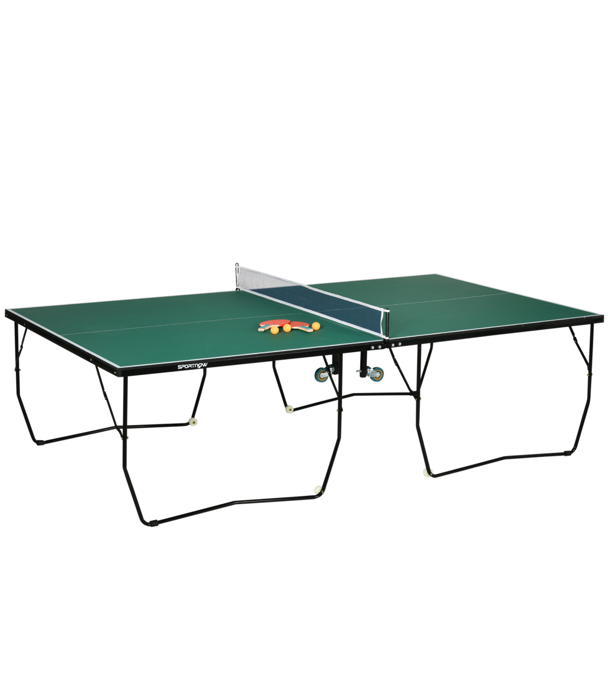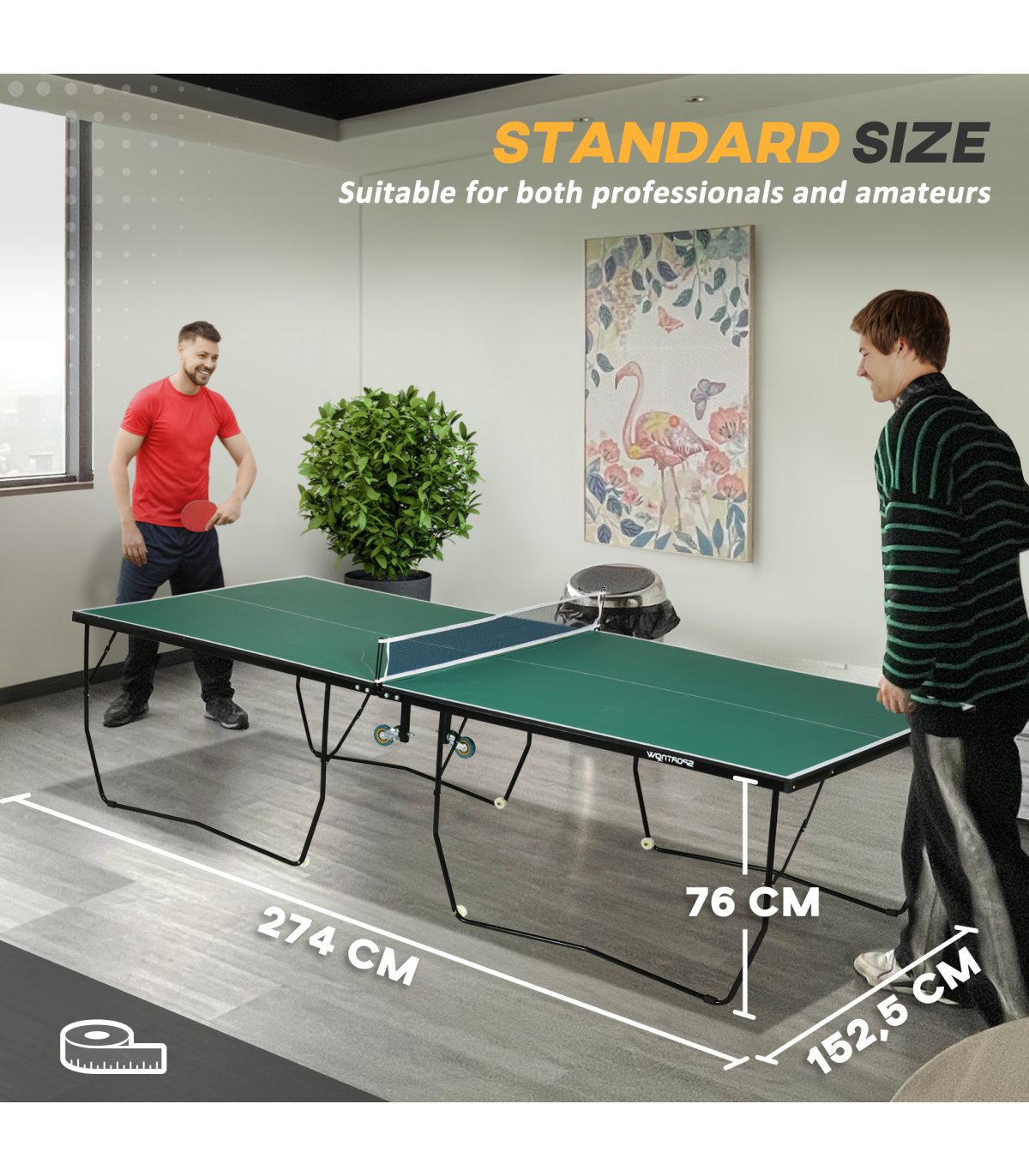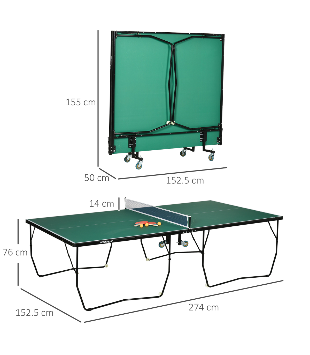 Large tennis table: Allowing up to four players at a time, it's suitable for leisure players and professionals alike.Foldable: Both halves can be folded, saving space when not in use. The portable table tennis table comes with eight wheels, making it easy to move around when folded or half open.Powder-coated steel structure: A smooth and even playing surface, providing a positive table tennis experience ? suitable for outdoor use.Multifunctional: Remove the net and use the table for card games or any other multi-use table needs. Both halves can be detached and used separately ? ideal for smaller spaces.Complete set: Comes with a game net, two paddles and three balls ? all the accessories needed to enjoy a game of table tennis straight away. Dimensions: 76H x 274L x 152.5Wcm. Folded: 155H x 152.5W x 50Dcm.