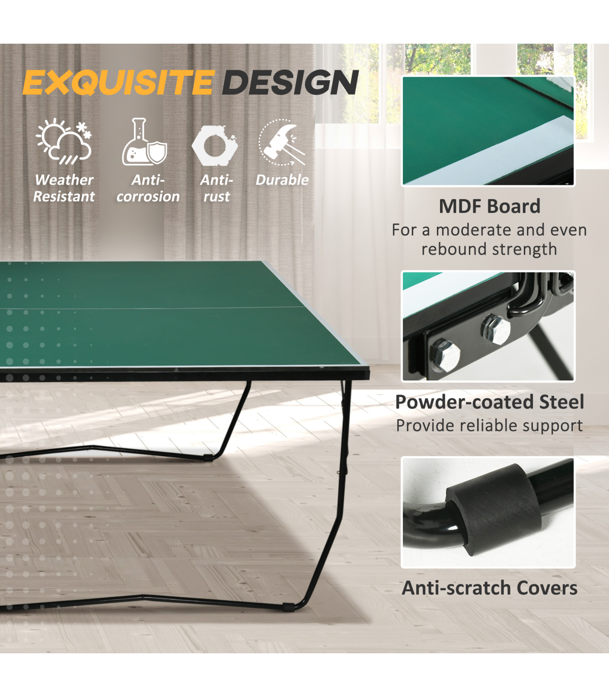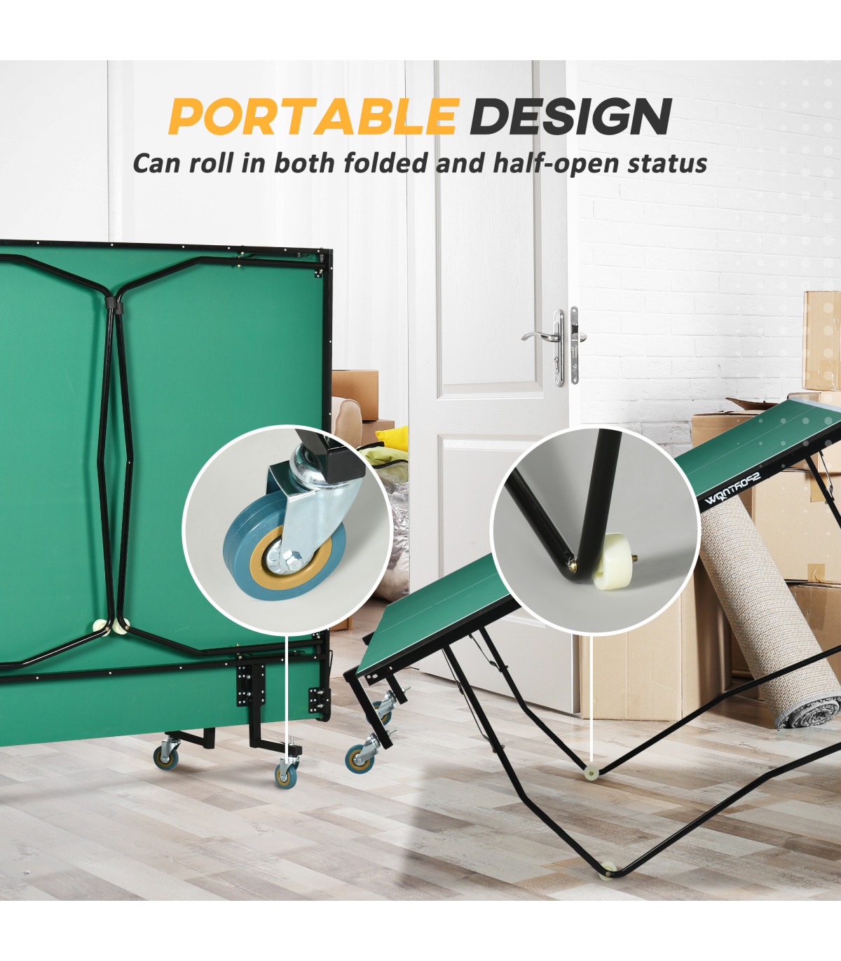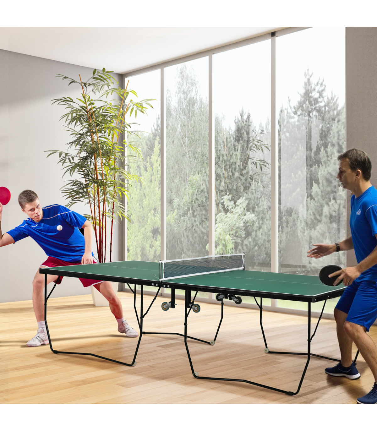 Large tennis table: Allowing up to four players at a time, it's suitable for leisure players and professionals alike.Foldable: Both halves can be folded, saving space when not in use. The portable table tennis table comes with eight wheels, making it easy to move around when folded or half open.Powder-coated steel structure: A smooth and even playing surface, providing a positive table tennis experience ? suitable for outdoor use.Multifunctional: Remove the net and use the table for card games or any other multi-use table needs. Both halves can be detached and used separately ? ideal for smaller spaces.Complete set: Comes with a game net, two paddles and three balls ? all the accessories needed to enjoy a game of table tennis straight away. Dimensions: 76H x 274L x 152.5Wcm. Folded: 155H x 152.5W x 50Dcm.