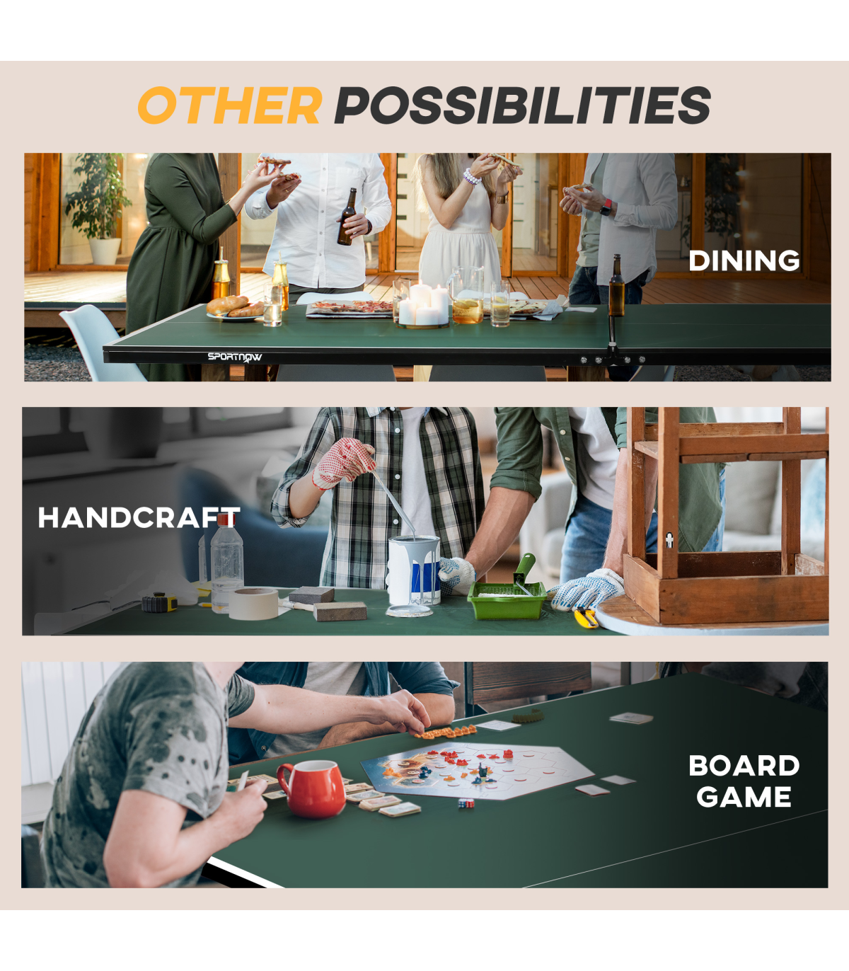 Whether you play professionally or for fun, this SPORTNOW outdoor table tennis table provides all the enjoyment the sport has to offer. It comes with a net, two paddles and three balls ? everything needed to to start playing. Made from powder-coated steel, it's suitable for outdoor use. When not playing, use the table for other needs by removing the net and detaching the table - it could be for card games, dining or other social activities. When done, fold and store it away to save space.
