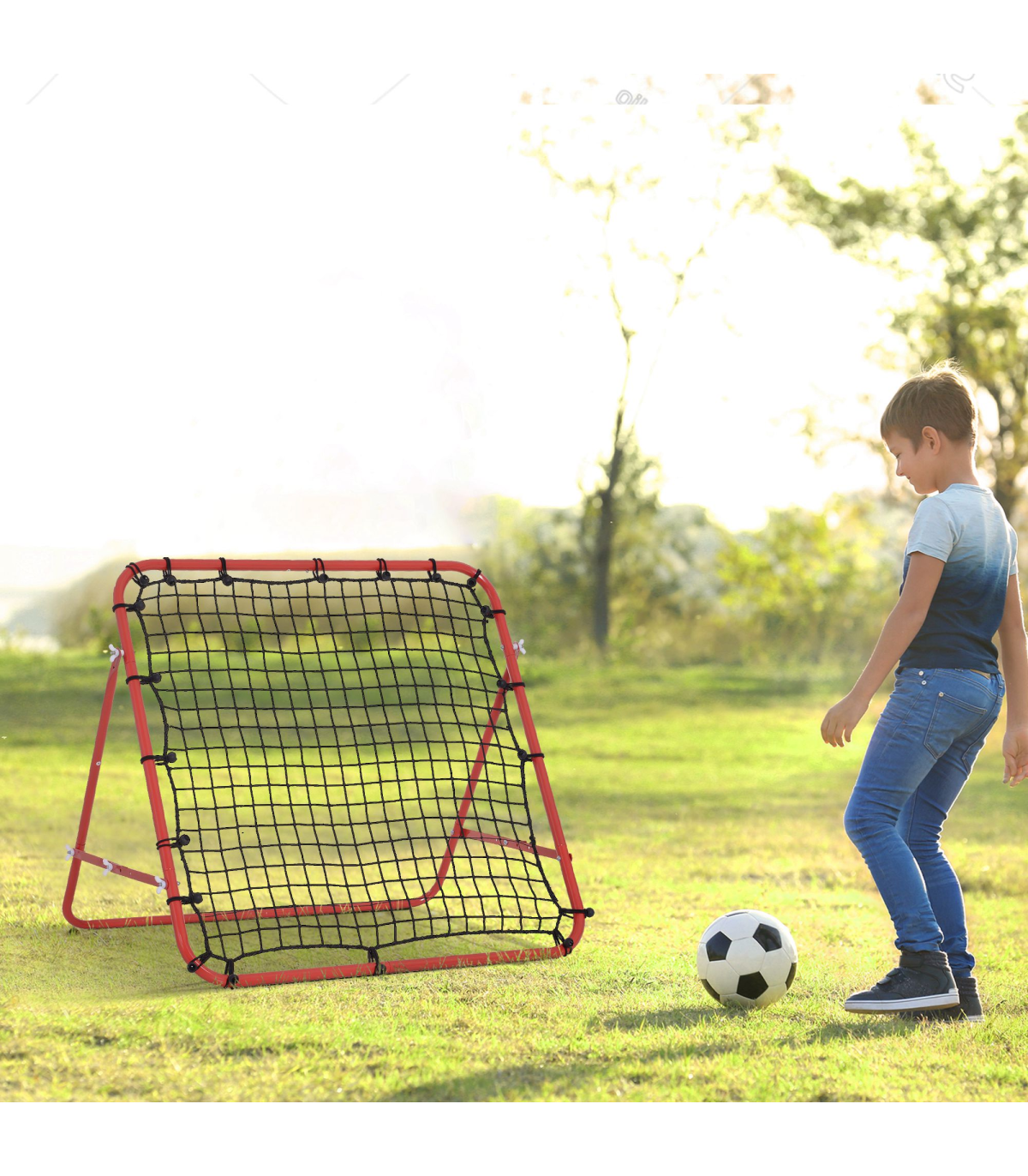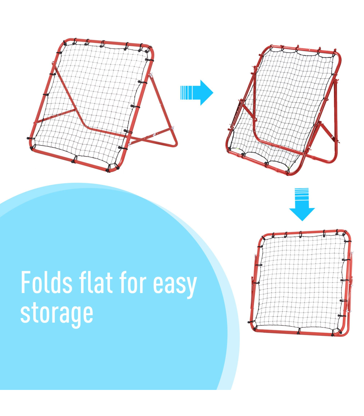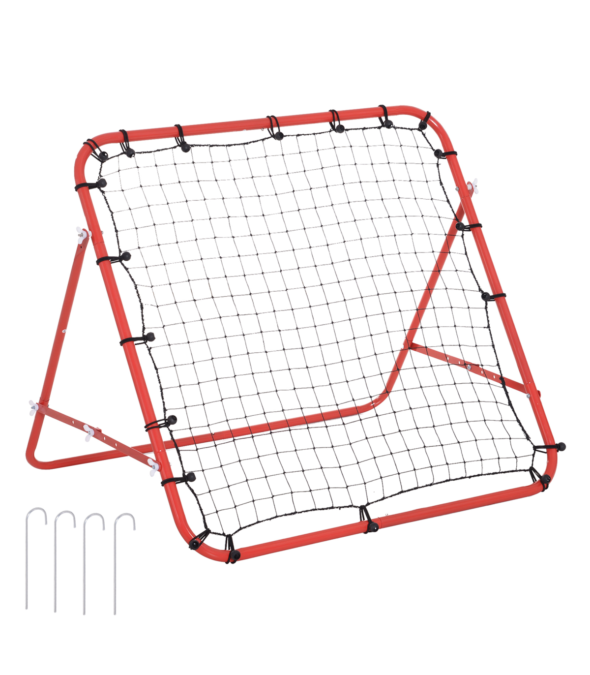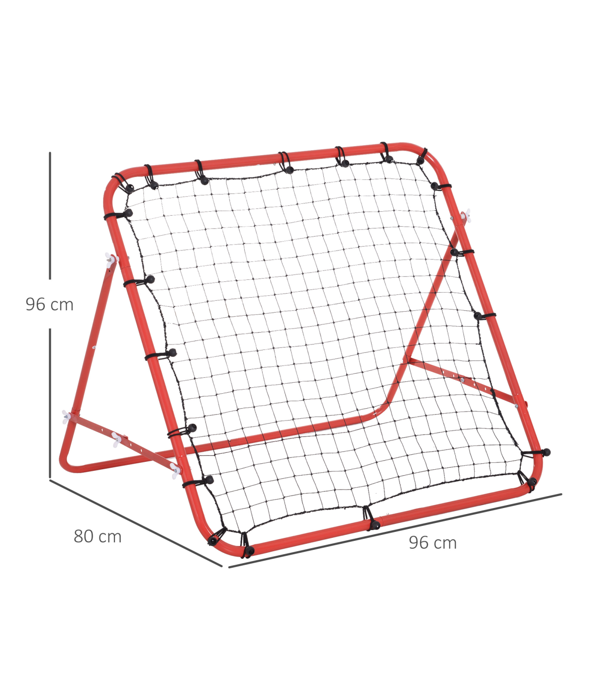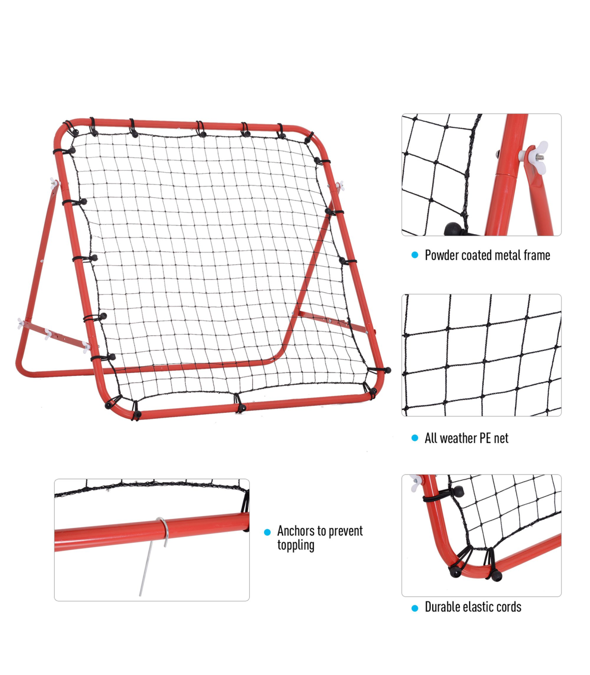 Rebounder Net - Practise Goal Play - Kids Adults Baseball Soccer Training HOMCOM" Description: - PRIVATE TRAINING NET: Great for improving confidence in football, baseball, cricket, tennis, etc. - STURDY FRAME: Made from powder-coated steel for long-lasting reliability. Stakes included for extra stability. - WEATHER RESISTANT NET: Suitable for use all-year round. - 20 ELASTIC CORDS: Supports the net against strong impact hits. - MULTI-ANGLES: Adjustable back to change angle and height, improving hitting and throwing accuracy. - LIGHTWEIGHT: Easy to move and store away. - DIMENSIONS: 96H x 96W x 80Dcm. Net Size: 84L x 84Wcm. - ASSEMBLY REQUIRED.