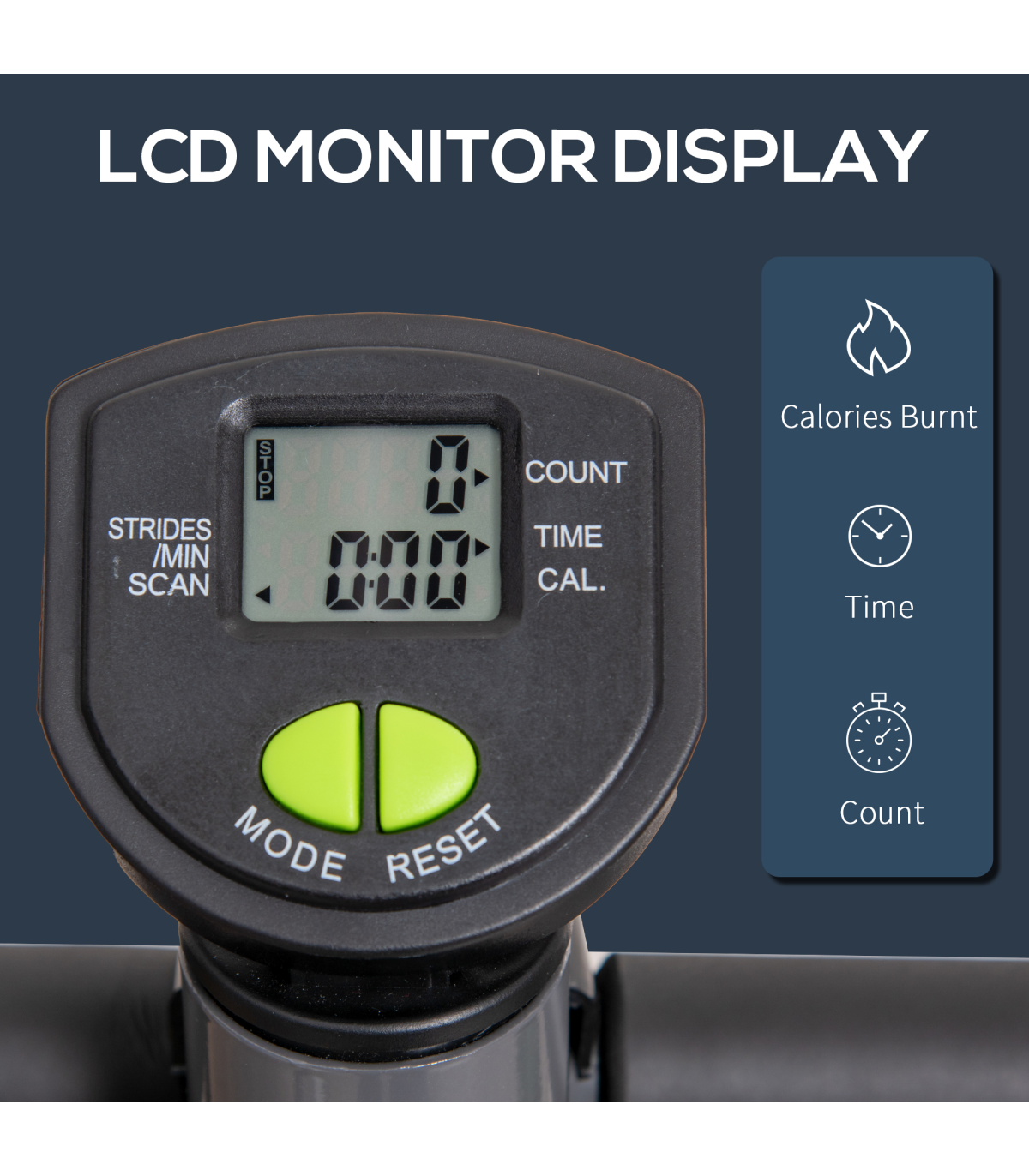 LCD MONITOR: Keeps tracks and displays time, step count, burned calories.