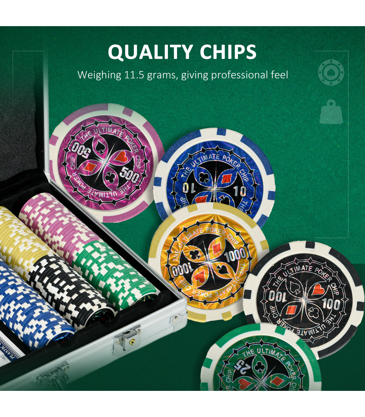 ● Chip denominations: 100 grey chips (£1 each), 50 red chips (£5 each), 50 blue chips (£10 each), 25 green chips (£25 each), 25 black chips (£100 each), 25 purple chips (£500 each) and 25 yellow chips (£1000 each)