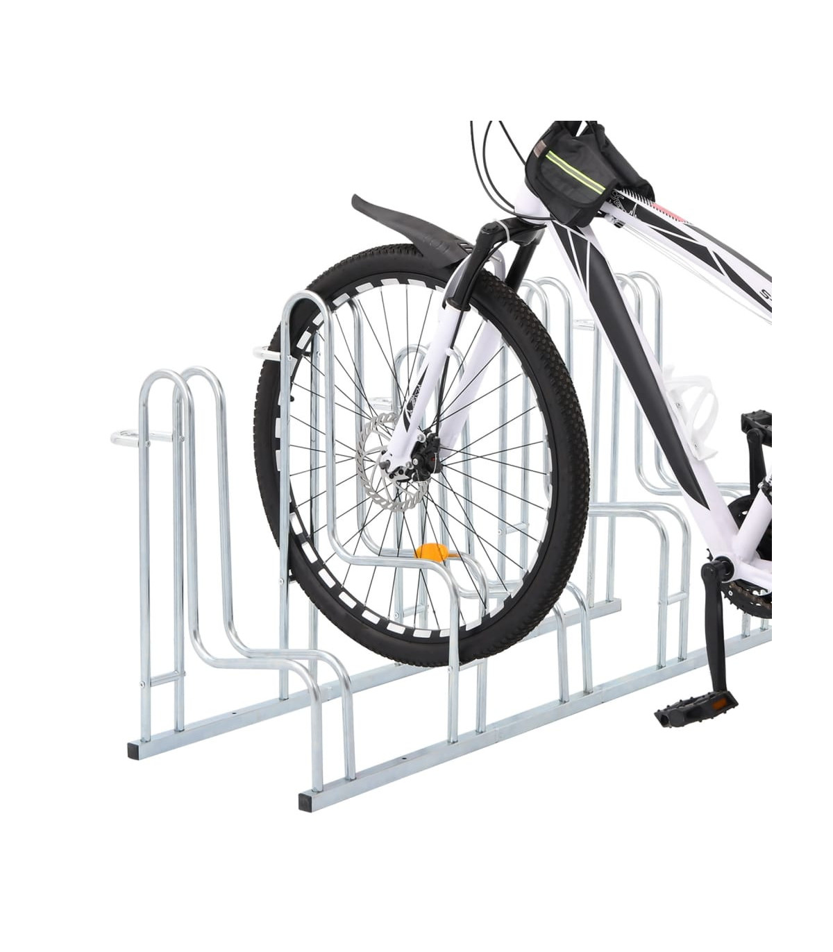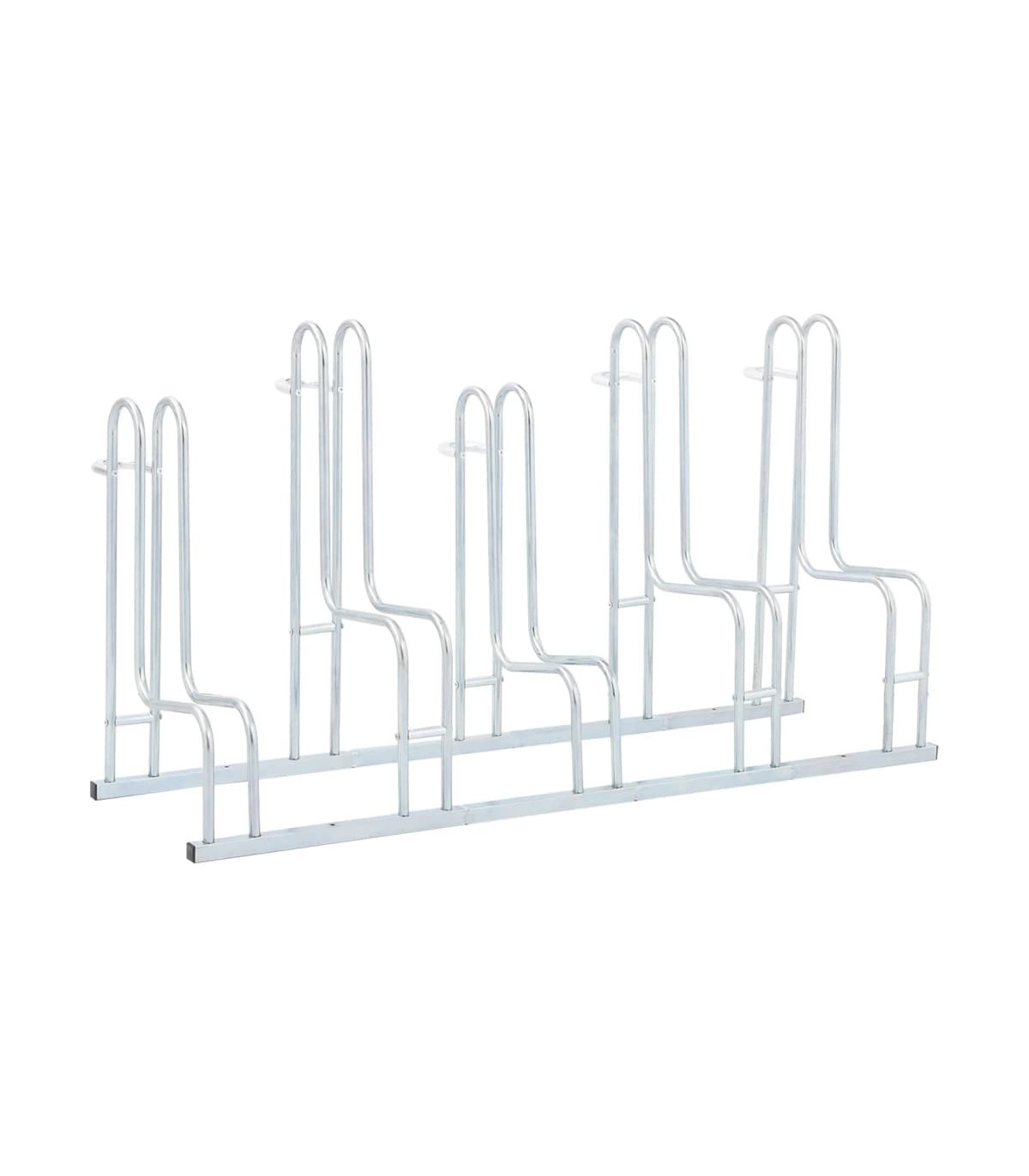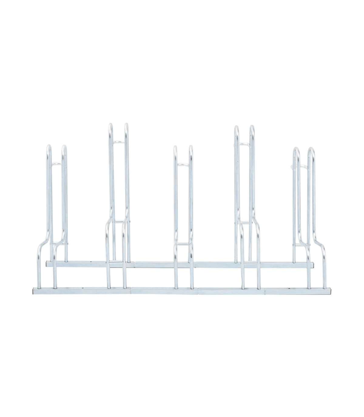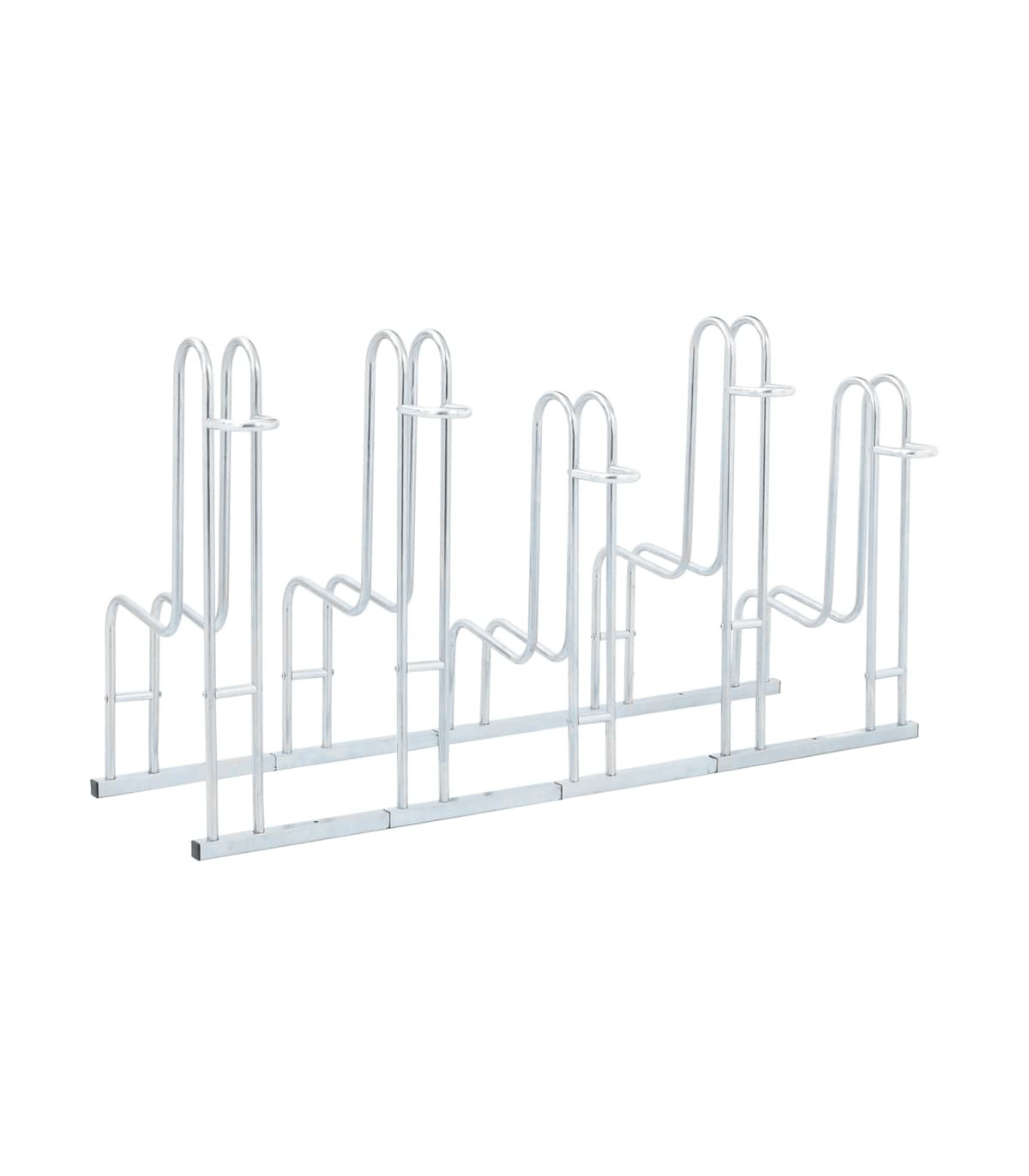 Utilise this bicycle stand to safely and efficiently park your bikes, saving valuable space.Sturdy and long-lasting: This bicycle stand is made of galvanised steel, making it sturdy, corrosion-resistant, long-lasting, and lightweight for easy movement.Space-saving: This bicycle stand has a high-low wheel design and accommodates five bikes without handlebar tangling, optimising space for efficient parking.Stable structure: You can fasten the bicycle stand securely using the provided screws to prevent your bike from tipping or falling, ensuring it remains stable. The stand’s high brackets offer optimal protection for your bike’s rims, making it ideal for various standard mountain bikes, e-bikes, and more.Wide applications: The bicycle stand is perfect for accommodating multiple bikes with tyre widths of up to 55 mm and is suitable for indoor and outdoor use in various settings, including garages, warehouses, schools, shops, and more.