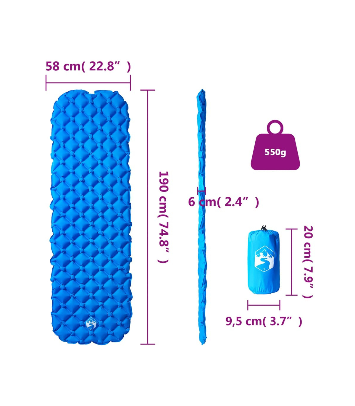 This inflating camping mattress is practical and convenient, making it perfect for your outdoor activities. Durable and water-resistant: The inflating camping mattress is composed of 40D nylon and TPU coating, making it durable, water-resistant, and weather-resistant.Comfortable: The inflating camping mat has a thickness of 6 cm to isolate you from the cold, damp, and uneven ground. It adapts ergonomically and soothingly to your body.Easy to inflate: The camping sleeping mat is fully formed by blowing 8–12 times. Open the valve layer to directly inflate the camping mat or empty it completely.Portable: The camping air mattress is lightweight and can be perfectly stored in a compact hand carry bag after rolling up. It's not taking up too much space, making it convenient for travel, picnics, hiking, and camping. Good to know:Please only hand wash the mat and keep it away from sharp things.
