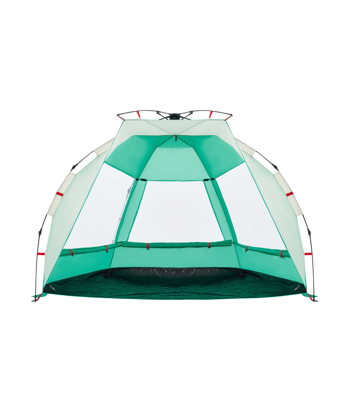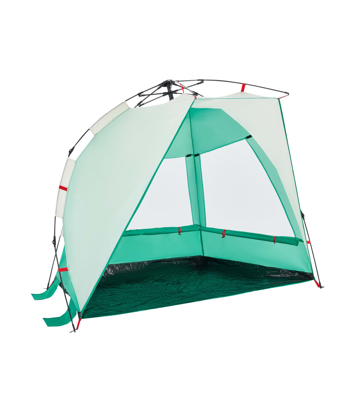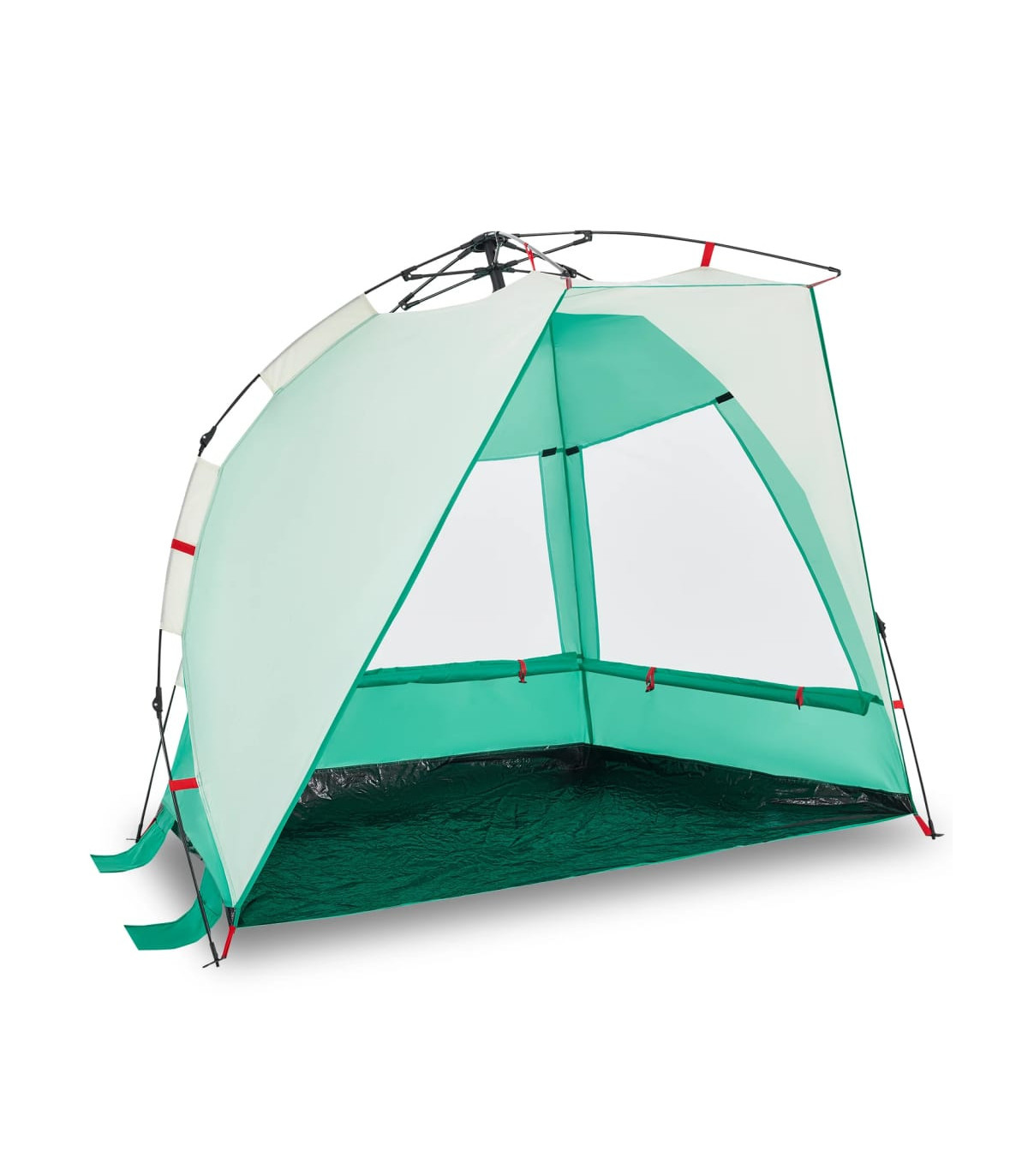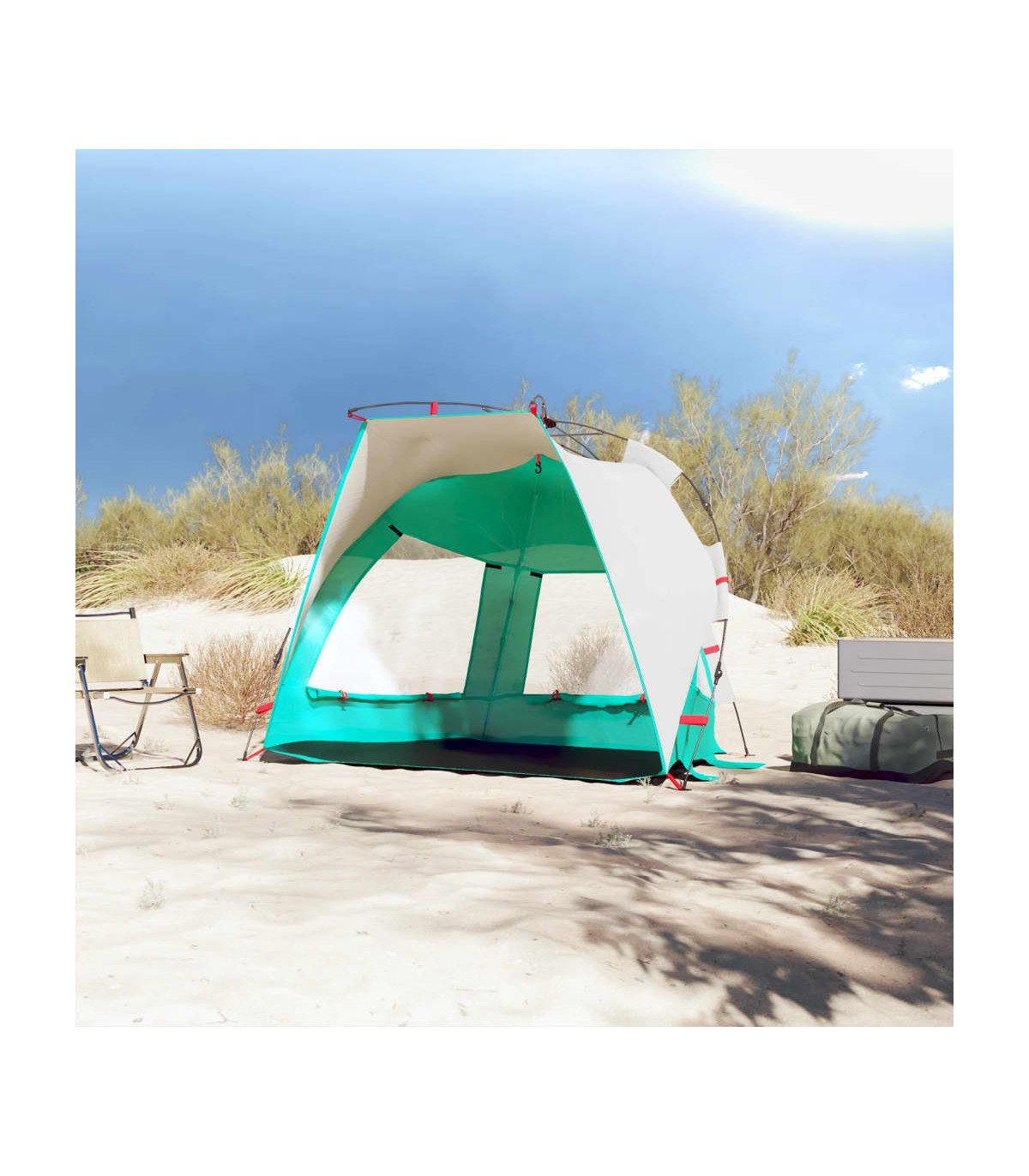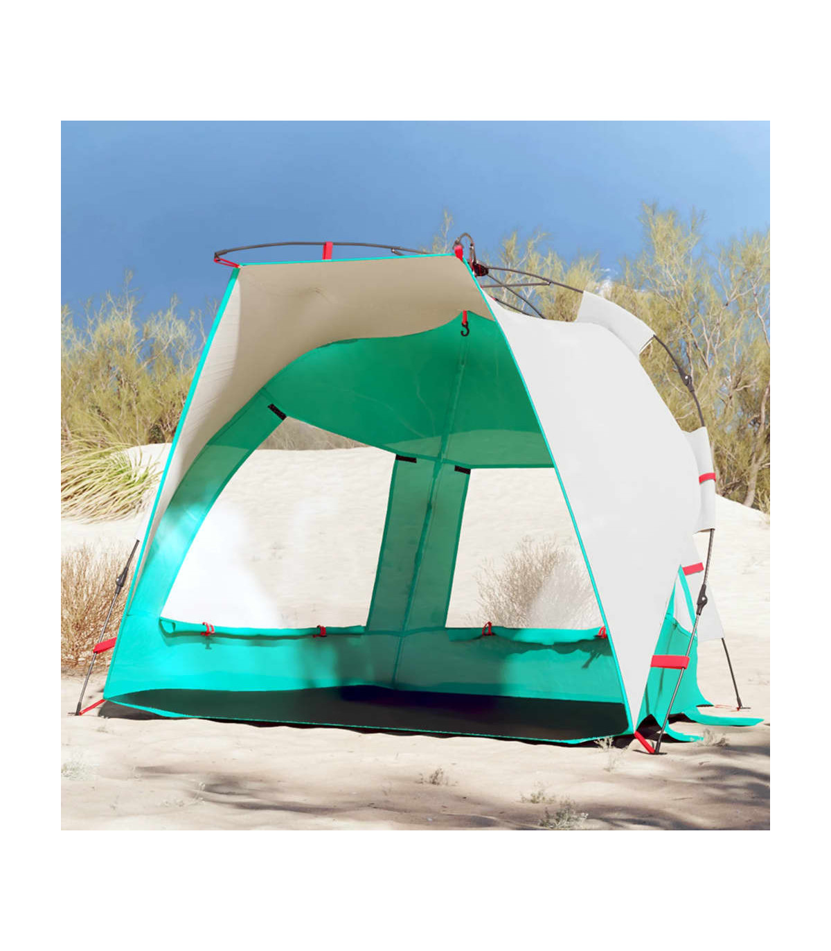 This beach tent offers you and your friends a cosy shelter in the hot summer or use it as a shade over the sandpit and paddling pool. Waterproof: This camping tent, made from polyester with a PU coating, is waterproof and wind resistant.Quick-release system: Set up the tent effortlessly with the quick-release system! Lay the tent down, extend the pre-assembled poles until they lock into place, and you're all set!Opened door: The fully open door allows you to enjoy the beautiful beach scenery with your family or entertain the children freely on a delightful summer afternoon.Lightweight and portable: The foldable and lightweight design allows you to easily pack the tent and store it in the included carry bag for easy transport.Stable and safe: Secure your tent firmly to the ground with the stakes and guy ropes provided to ensure stability and safety. Warning:Keep all flame and heat sources away from this product fabric.