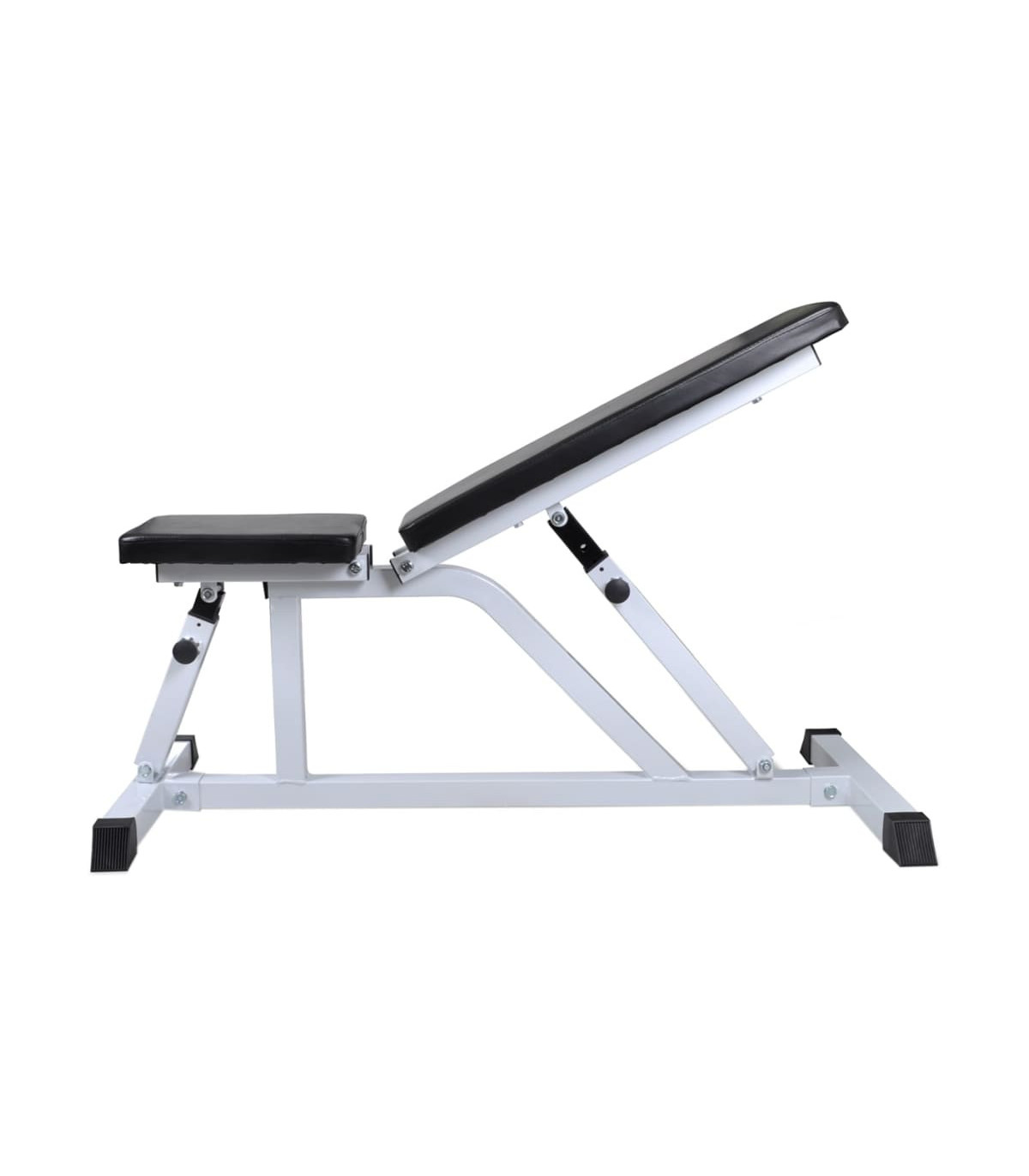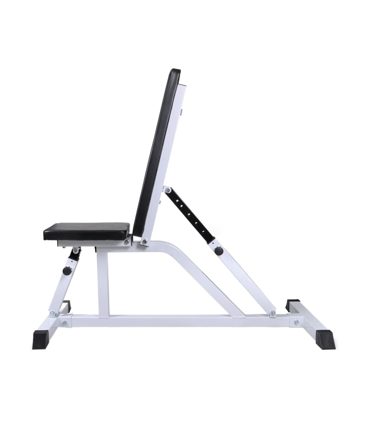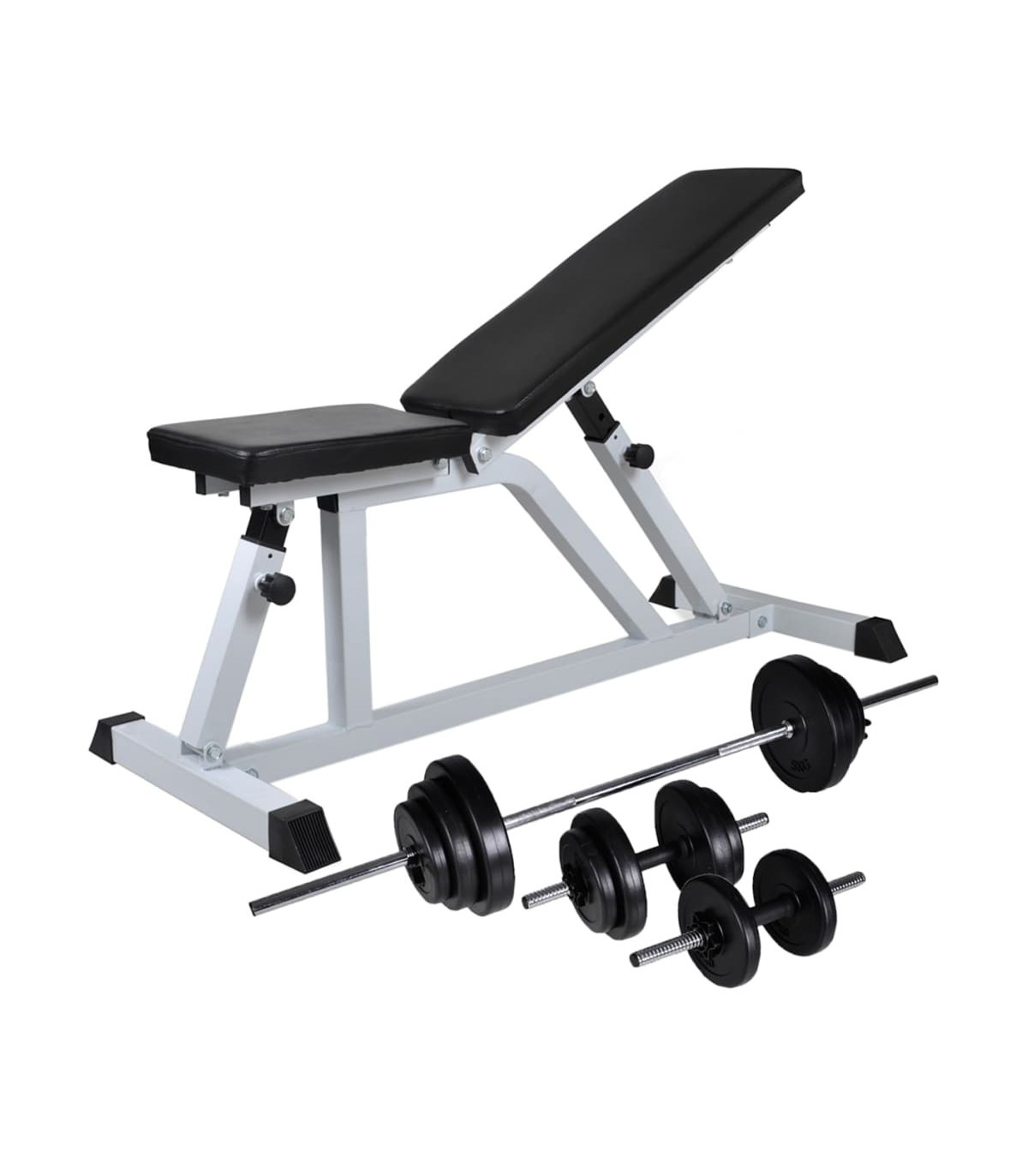 This high-quality, multifunctional workout bench with an adjustable seat and backrest will be a great choice for working out in the comfort of your own home, and saves you the hassle and expense of going to a gym. The weight bench is delivered with a barbell and dumbbell set. The adjustable seat and backrest with adjusting knobs allow you to easily set the most comfortable position. Our weight bench is constructed from top-quality steel, and the durable cotton-padded cushion will offer you the utmost comfort. The barbell and dumbbell set features solid chrome-plated bars with quick-action spring collars (for barbell bar), non-slip grips, and fluted star-screw caps (for dumbbell bars) for secure attachment of the weight plates. You can work out without worrying about safety issues. The weight plates are made with a robust polyethylene casing. They can be combined in various ways for different training purposes. Delivery includes a workout bench, a barbell bar, two dumbbell bars, six 1.25 kg weight plates, four 2.5 kg weight plates, two 5 kg weight plates, four caps and two spring collars.