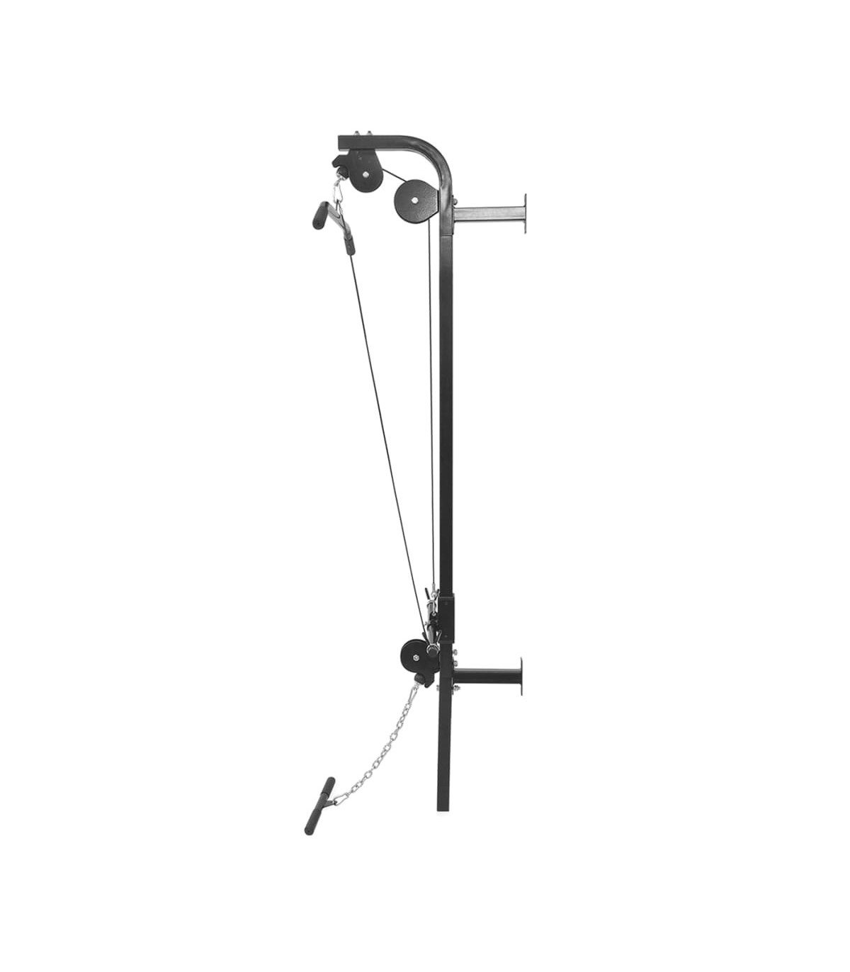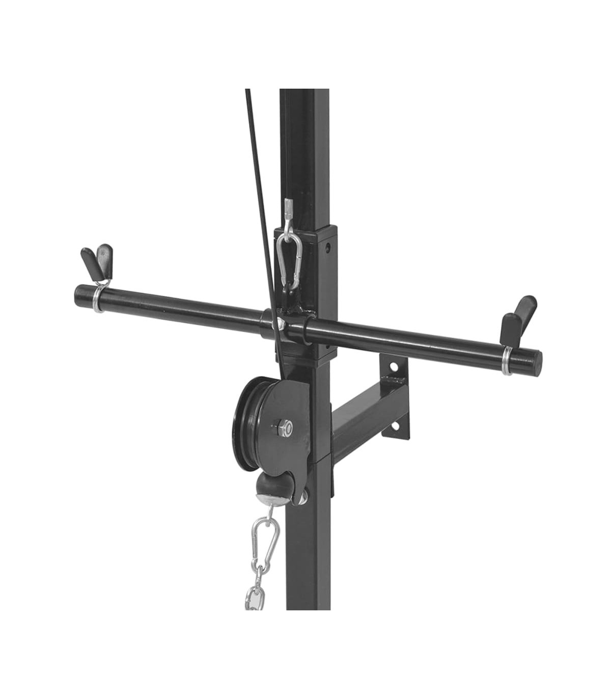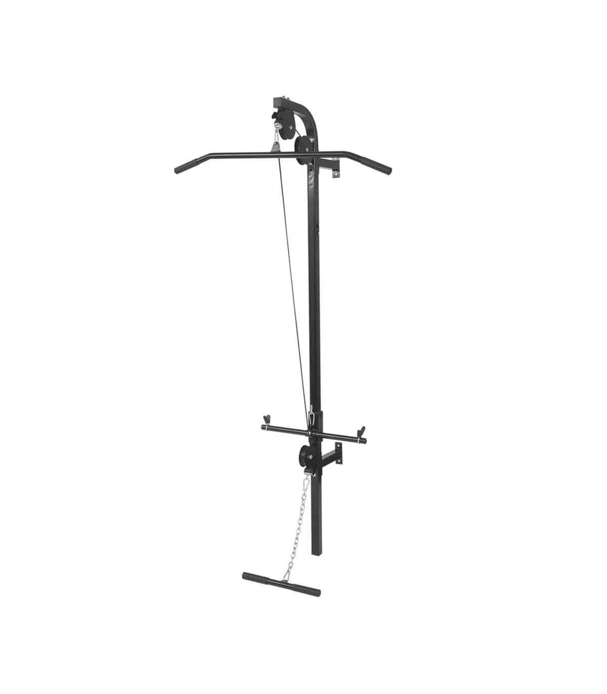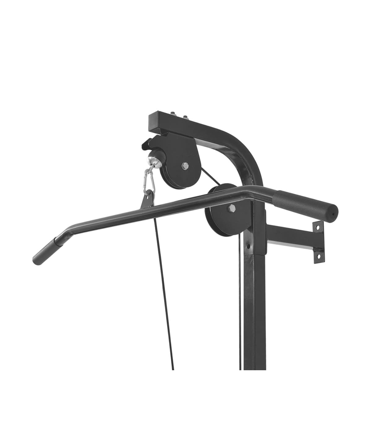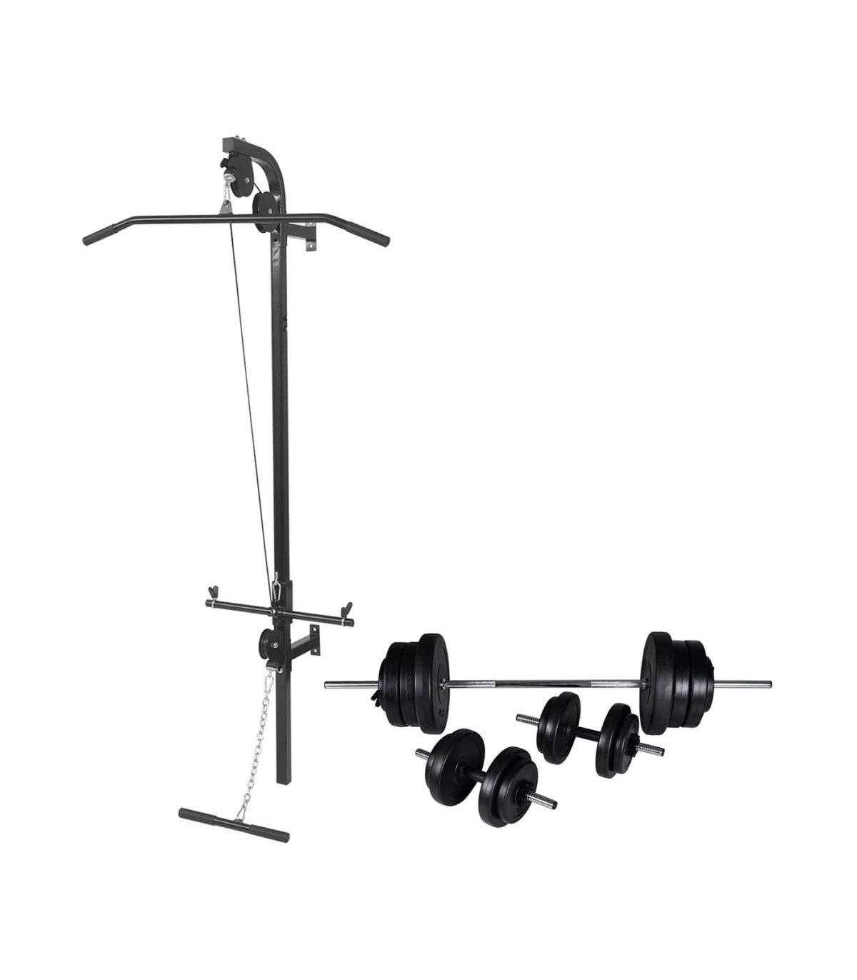 This wall-mounted power tower with two pulleys is equipped with a lat pull-down bar and a low cable pull-up bar and will allow you to train all major muscle groups of the body. This power tower is made of strong steel for durability and stability and can support up to 120 kg in weight plates. Its handles are made of soft material for an improved grip. The pull-up station can be easily mounted to a wall with the included mounting accessories. Assembly is easy. The barbell and dumbbell set features solid chrome-plated bars with quick-action spring collars (for barbell bar), non-slip knurled grips, and fluted star-screw caps (for dumbbell bars) for secure attachment of the weight plates. You can work out without worrying about safety issues. The weight plates are made with a robust polyethylene casing. They can be combined in various ways for different training purposes. Delivery includes a power tower, a barbell bar, two dumbbell bars, six 1.25 kg weight plates, four 2.5 kg weight plates, four 5 kg weight plates, two 10 kg weight plates, four caps and two spring collars.