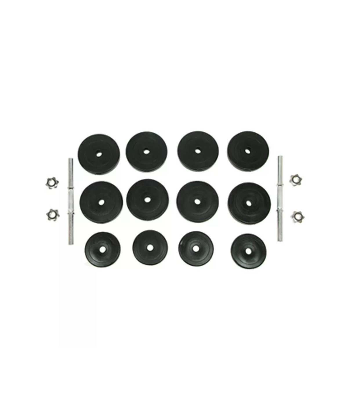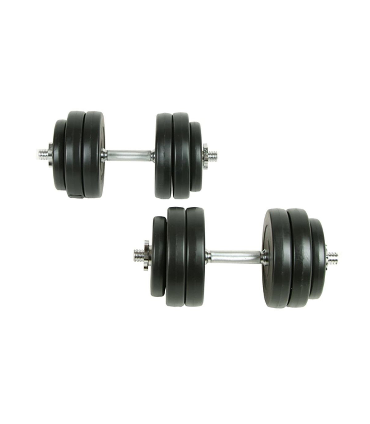 This versatile dumbbell set is perfect for targeting chest, biceps, arms, triceps and back muscles. It includes eight 2.5 kg weight plates, four 1.25 kg weight plates and two 2.5 kg dumbbell bars with screw collars and has a total weight of about 30 kg. This set allows the users to variably select the weights they want to lift for different exercises. The structure of the handles provides maximum grip so the dumbbell bar lies firmly in your hands. This dumbbell has star-shaped screw collars in order to keep the weights in place. This set can be easily combined with our weight benches or other dumbbell sets.