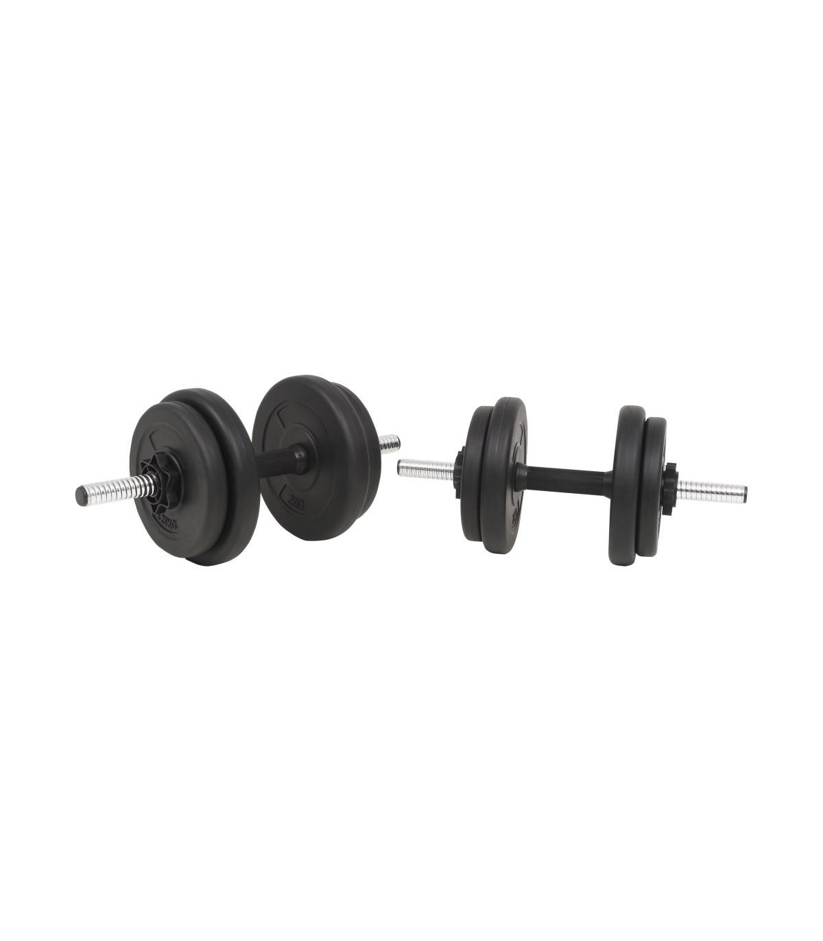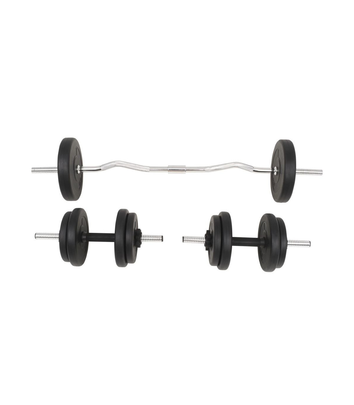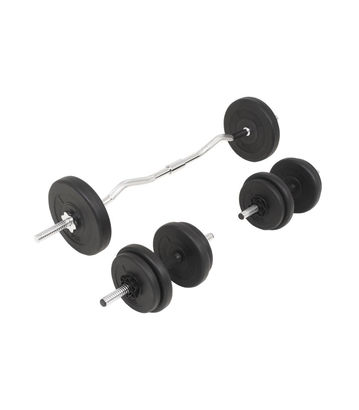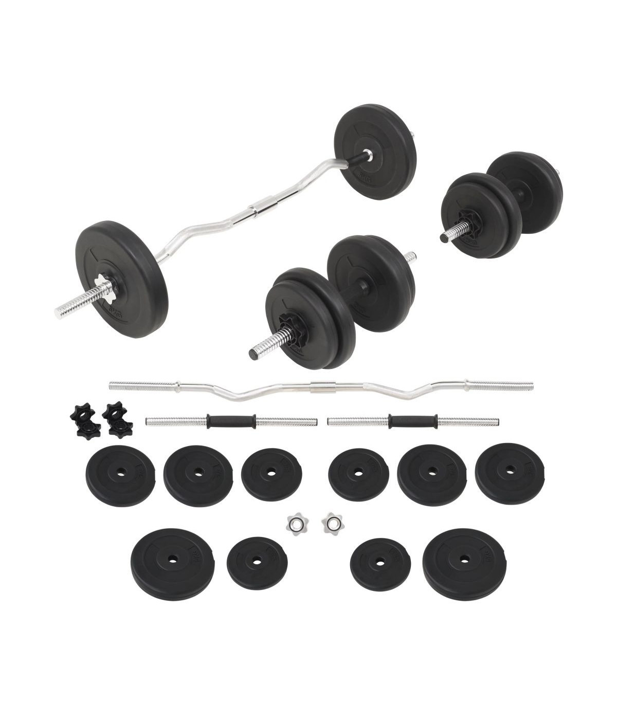 This set of ergonomically designed barbell/dumbbell set will allow you to perform a large range of exercises more easily and safely at home or in the gym. The set includes 1 barbell, 2 dumbbells, and 16 weight discs. The barbell/dumbbell set features solid chrome-plated bars with quick-action spring collars (barbell bar), non-slip grips, and fluted star-screw caps (dumb bell bar) for secure attachment of the weight discs. You can work out without worrying about safety issues. The weight discs are made with a robust PE casing. They can be combined in various ways for different training purposes. Delivery includes 1x barbell bar, 2x dumbbell bars, 6x 1.25 kg weight discs, 4x 2.5 kg weight discs, 4x 5 kg weight discs, 2x 10 kg weight discs, and 6x caps.