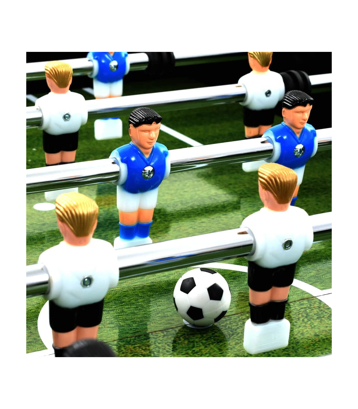 Host a professional table football game in the comfort of your own home with this football table. It is suitable for one-on-one competition or group play. The table is made of MDF and has stable legs, which make it convenient to use and it has a great price-performance ratio. The dimensions of the printed pitch conform to the official tournament standard, which gives you a realistic playing experience. The table is equipped with flexible sliding player rods with non-slip handles for easy and comfortable playing. The legs are adjustable in height for more flexibility. A complete table football game will be delivered, including 2 goals, 2 footballs, 2 scoreboards, 8 player rods and 22 players.