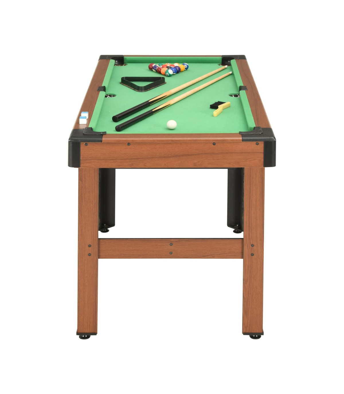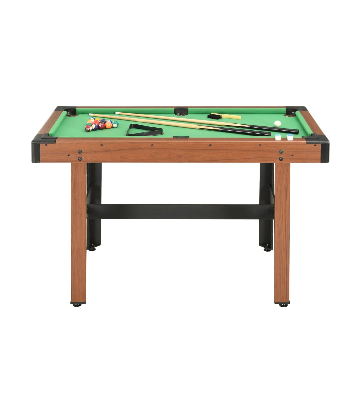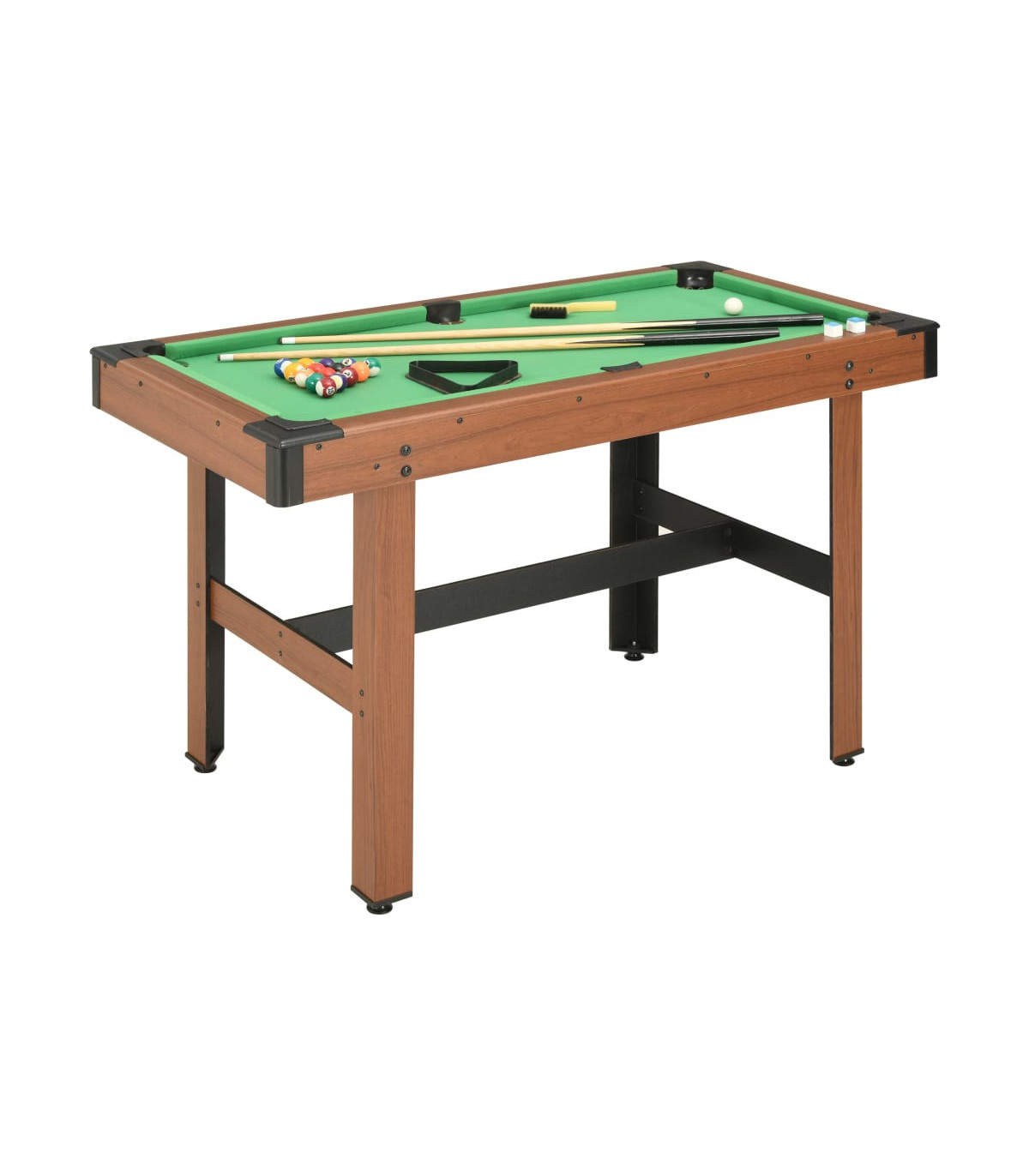 Enjoy a game of pool on our billiard table that is professionally made and designed to perfection! Characterized by sleek and clean lines, our 4 ft billiard table will be a great centrepiece to any game room, family room, office or gym! This billiard table is crafted from MDF with PVC veneer finish, ensuring long-lasting quality. Integrated leg levellers are included to well fit uneven playing field. Playing surface is covered by wear resistant green cloth and is engineered to resist warping over time. This table not only looks awesome, but also plays great and will make an excellent gathering spot to create lasting memories with friends and family! Delivery includes 2 cue sticks, 2 chalks, 1 triangle rack, 15 numbered billiard balls, 1 cue ball and 1 brush.
