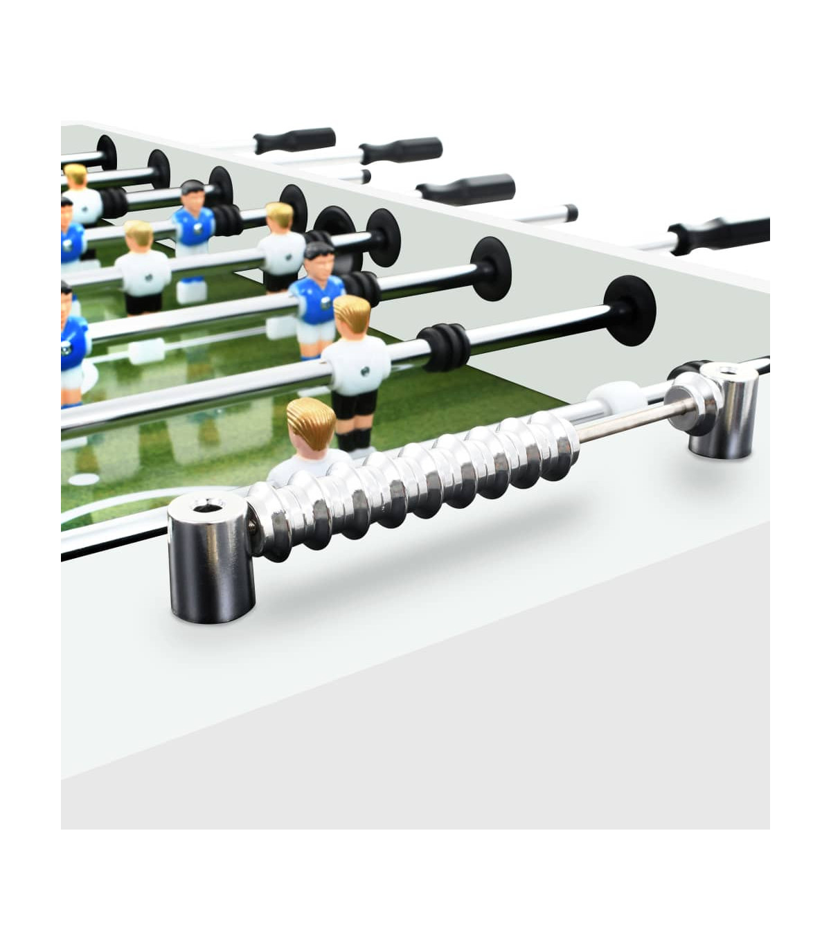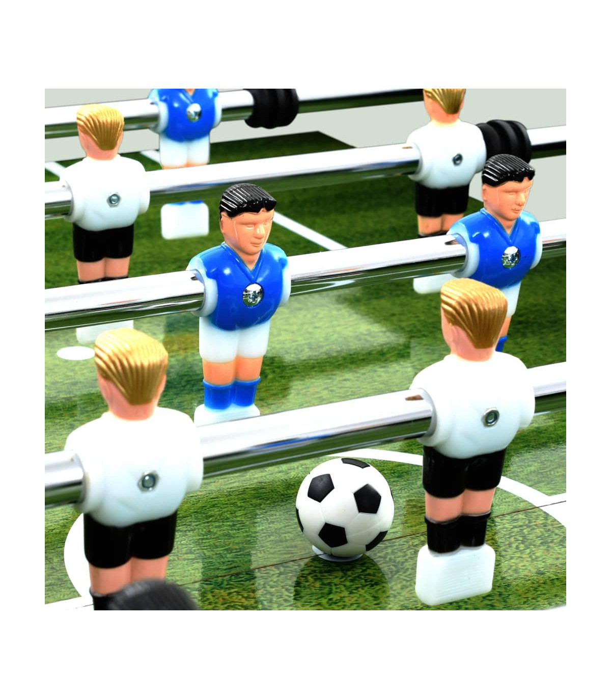 Host a professional table football game in the comfort of your own home with this football table. It is suitable for one-on-one competition or group play. The table is made of MDF and has stable legs, which make it convenient to use and it has a great price-performance ratio. The dimensions of the printed pitch conform to the official tournament standard, which gives you a realistic playing experience. The table is equipped with flexible sliding player rods with non-slip handles for easy and comfortable playing. The legs are adjustable in height for more flexibility. A complete table football game will be delivered, including 2 goals, 2 footballs, 2 scoreboards, 8 player rods and 22 players.