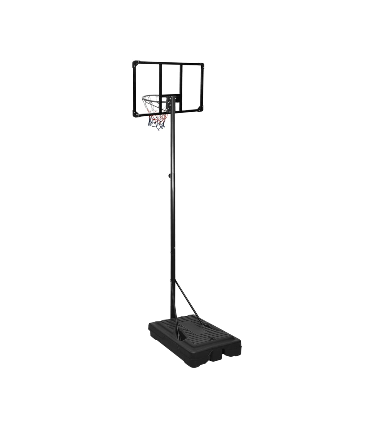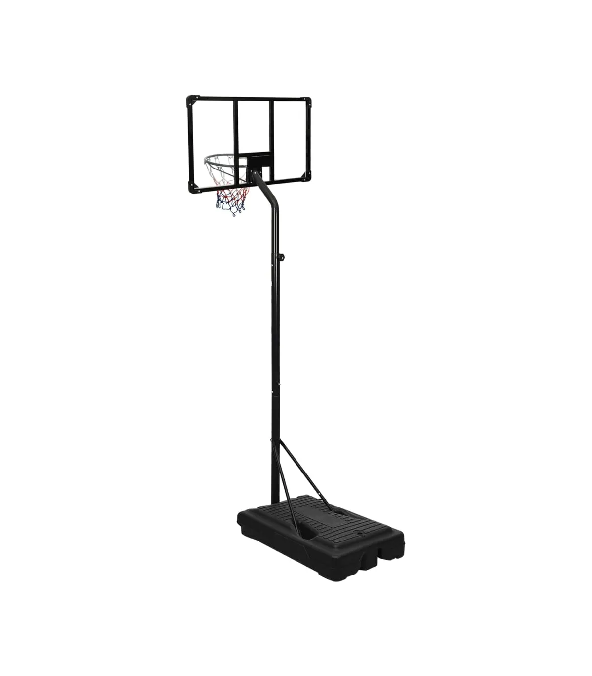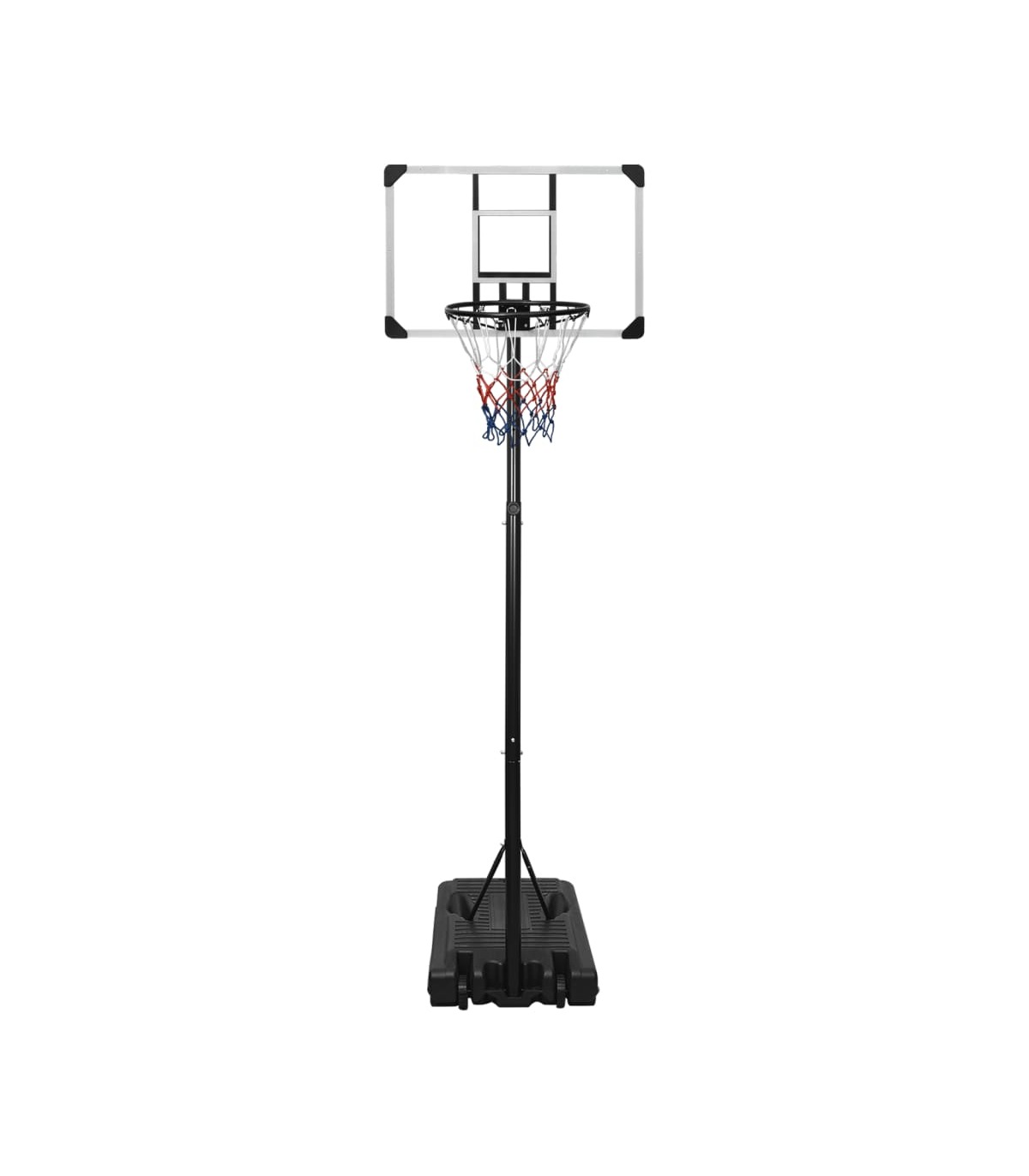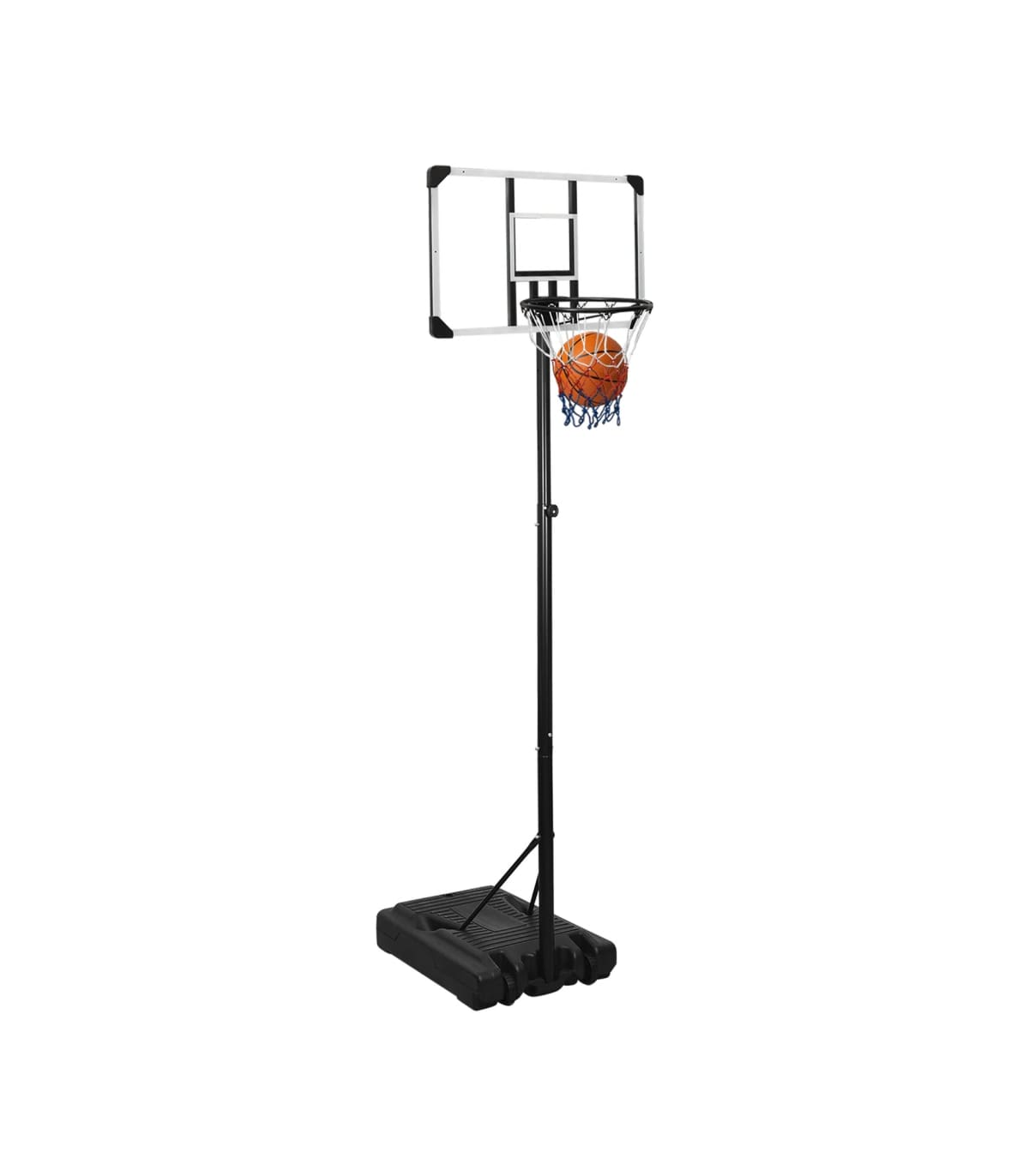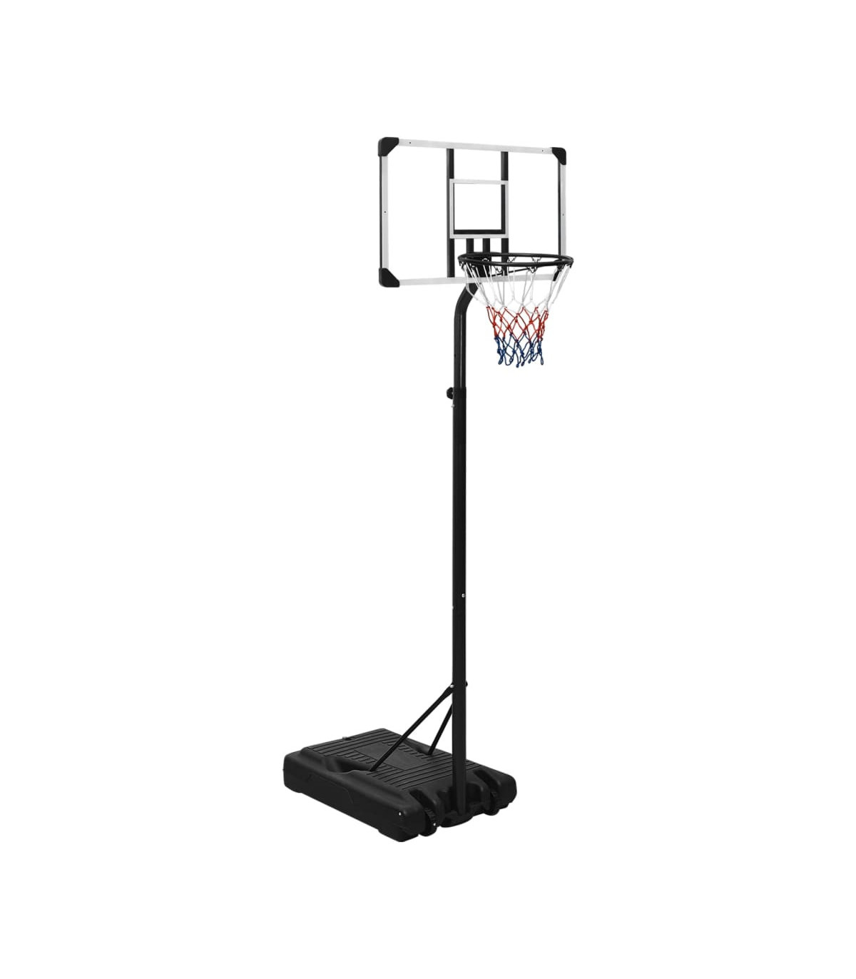 Do you want to enjoy a game of basketball with your friends anywhere, anytime? Then this adjustable basketball stand is a perfect choice! Durable material: The basketball stand is made of polycarbonate, enabling it highly durable and strong, as well as weather resistant and easy to clean. Classic steel-made basketball rim with an all-weather nylon net also makes the basketball stand last long.Adjustable height: The basketball hoop stand has an adjustable height and can stretch to fit different players. This basketball stand can be adjusted from 235 cm to 305 cm in height.Easy to move: The basketball hoop post features portable built-in wheels and can be easily moved.Stable base: The basketball portable stand adopts a triangular stable design. The base can be filled with water or sand, which makes the basketball post more stable.Wide application: This basketball post can be set up in a gym for indoor practice or in the backyard to enjoy friendly outdoor game competitions. Note:Each product comes with an assembly manual in the box for easy assembly.