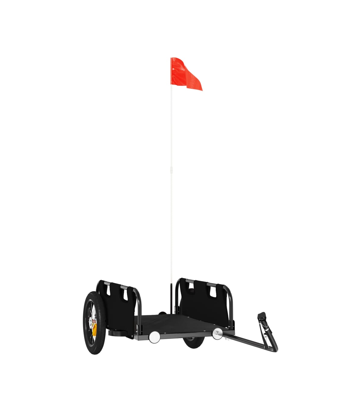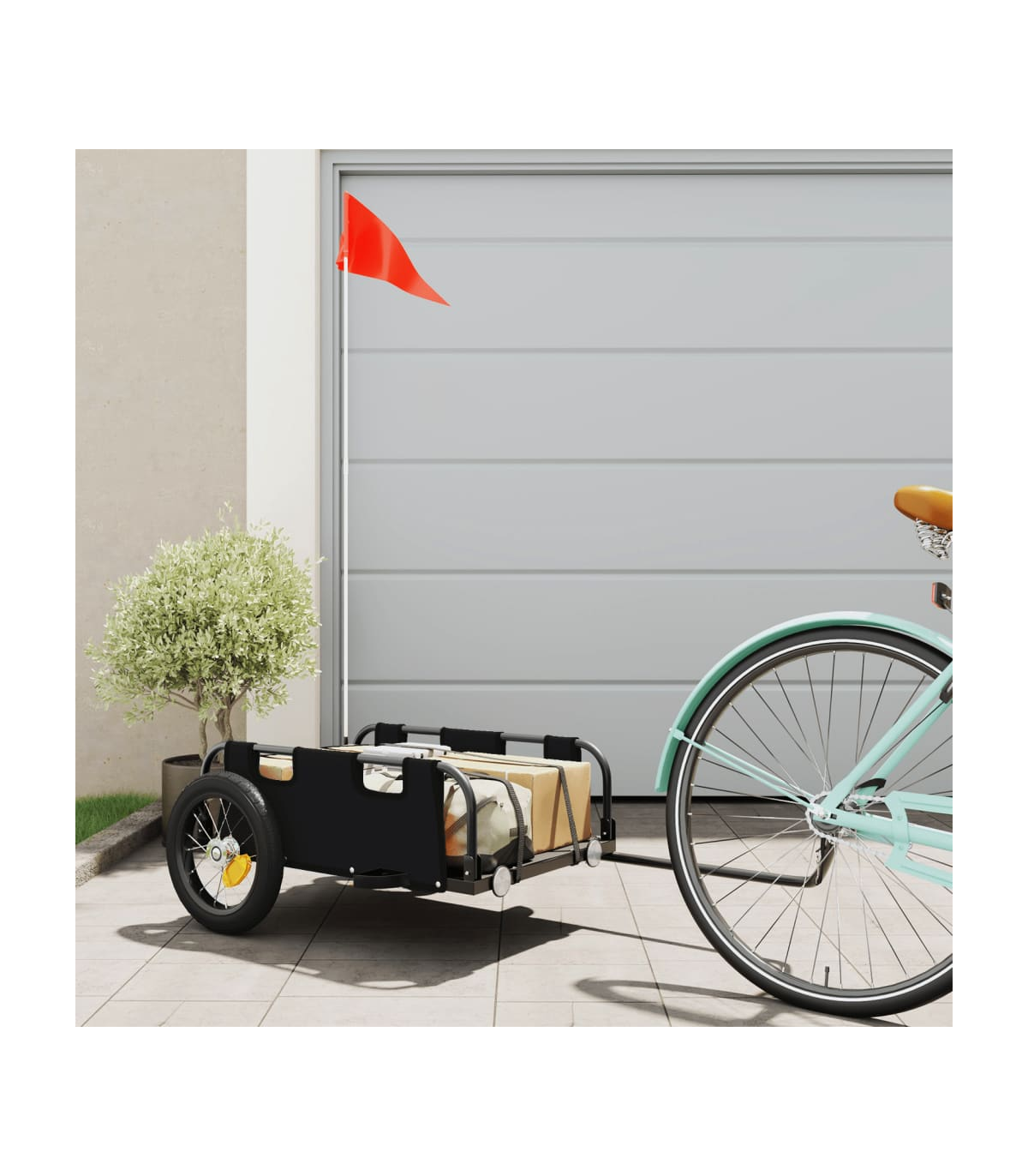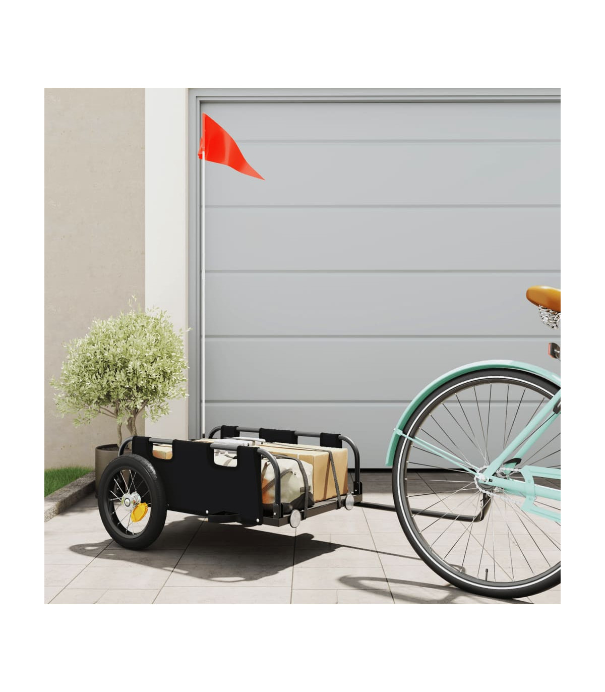 This cargo bike trailer is perfectly suited for all transport purposes by connecting it to your bicycle. Robust construction: This bike trailer has a sturdy construction that is made of powder-coated iron. Iron is a strong and hard material. It's a solid favourite in industrial and furniture construction. The powder coating on the surface of iron creates a protective layer against rust, corrosion, and wear.Durable material: This bicycle trailer is made from oxford fabric which is lightweight, water-resistant, and also resistant to damage and dirt. The yarn used for weaving makes the fabric durable and breathable. It is also naturally resistant to wrinkles. Safe riding: The bicycle cargo trailer has two large wheels that allow for smooth and superior tracking on various grounds, and the reflectors on the rear provide visibility in the dark, plus the flag can increase traffic safety.Wide applications: Easy to be attached to your bicycle, this bike cart can carry whatever you need to take with you, such as luggage, plants, tools, or groceries.