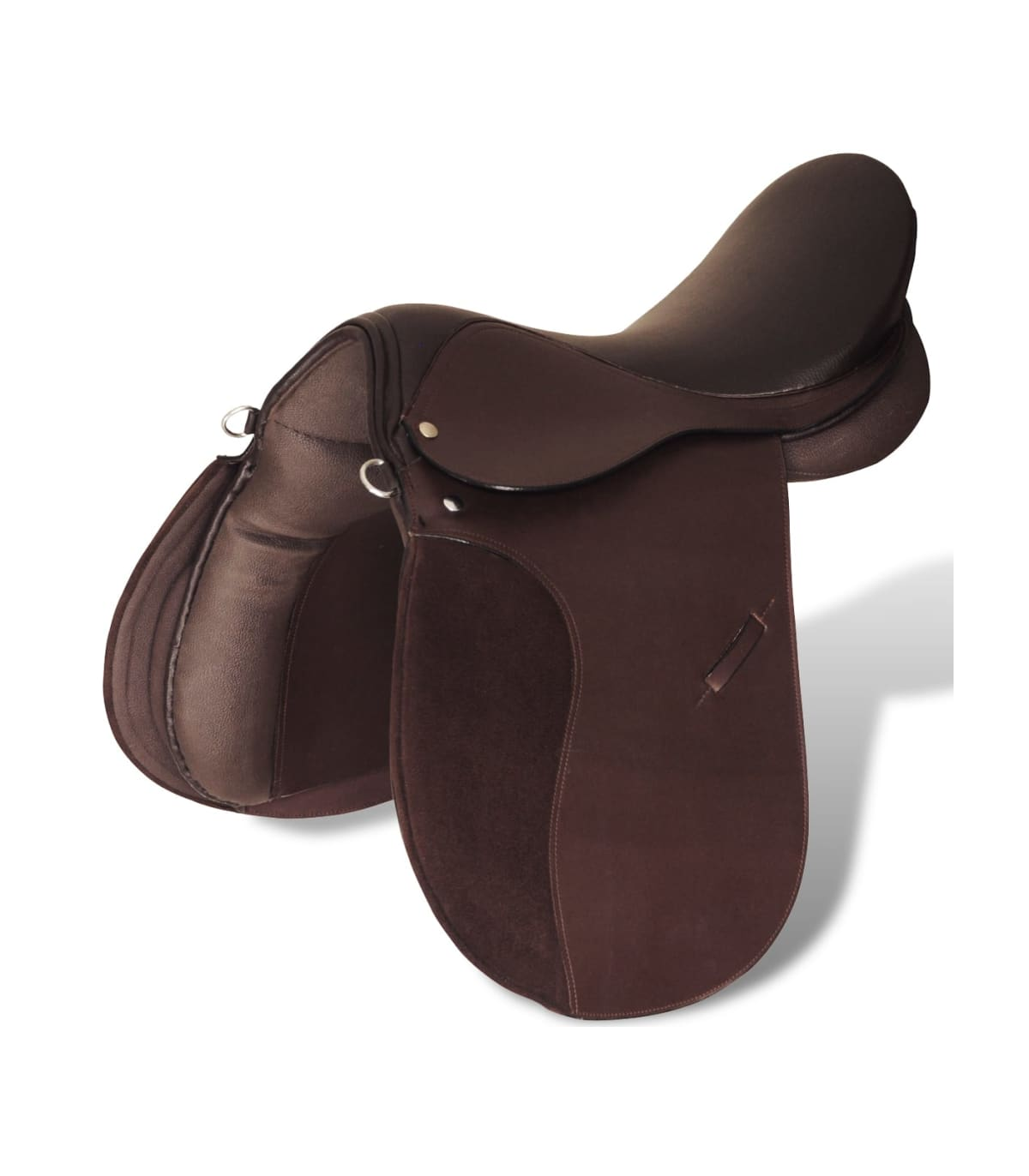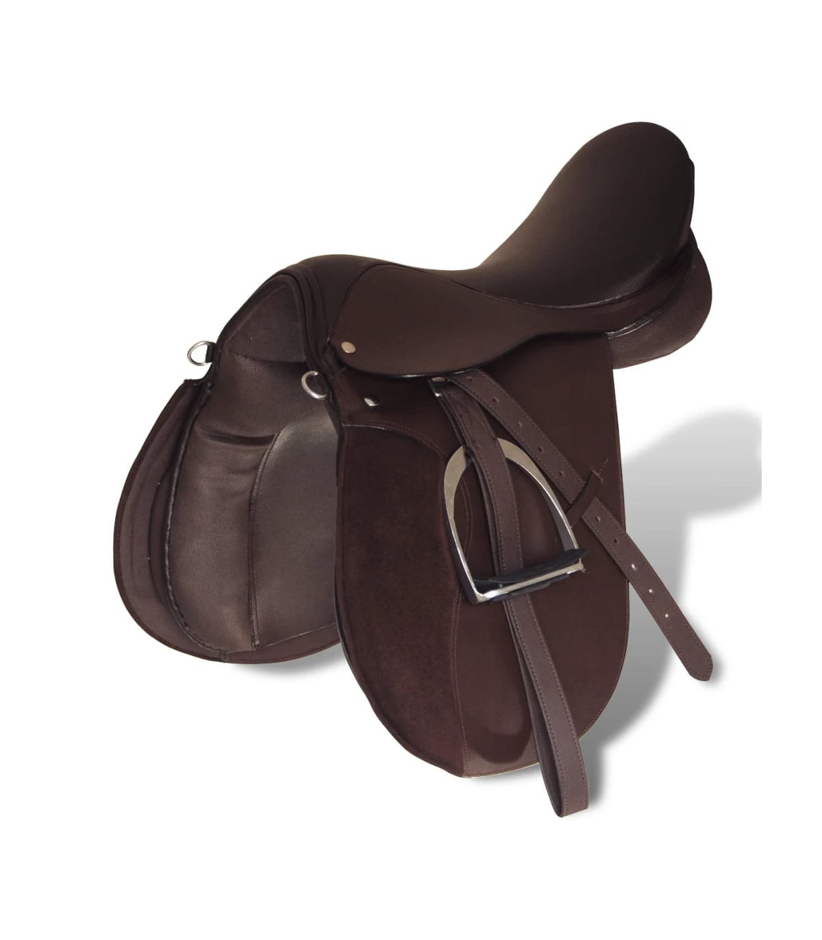 • A 5-in-1 set: Real leather saddle, saddle blanket, stirrups, stirrup belts, girth
