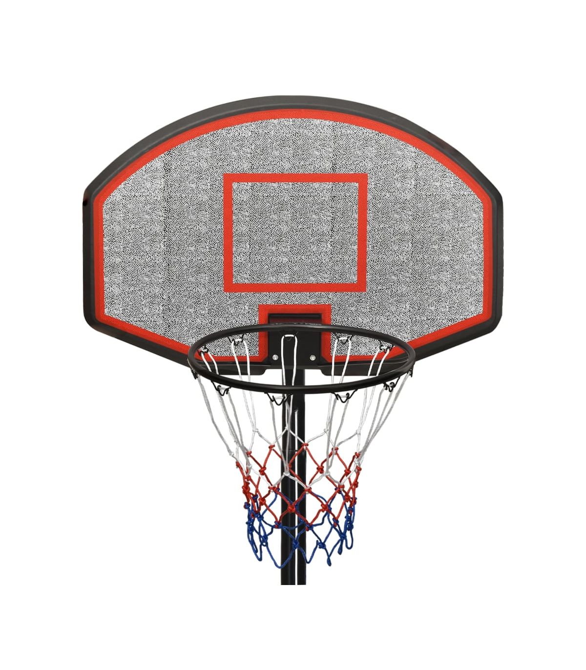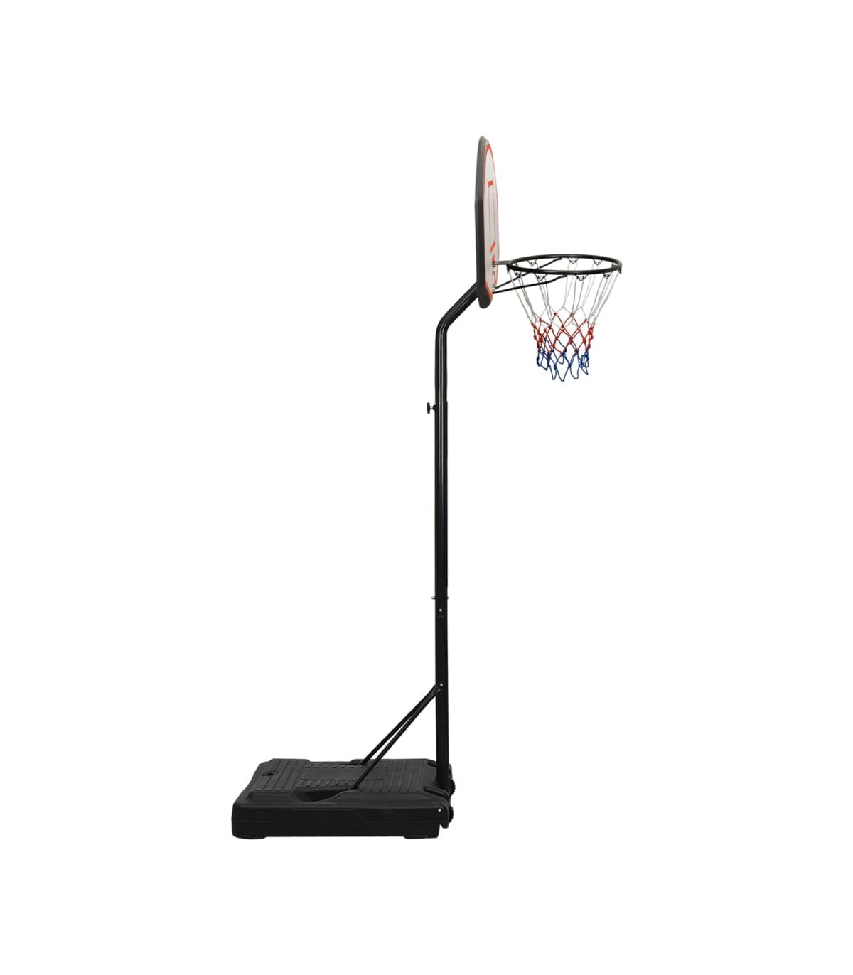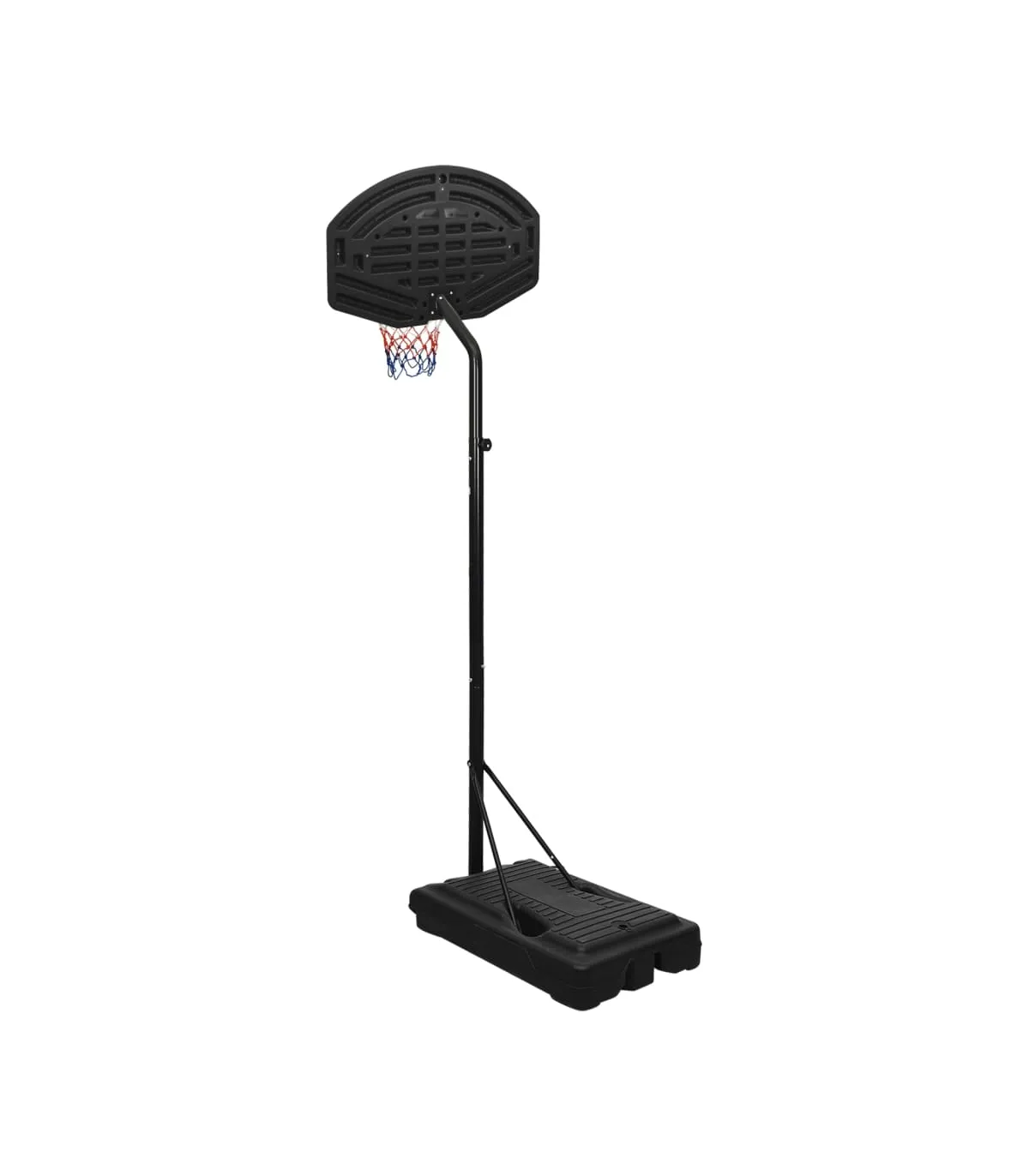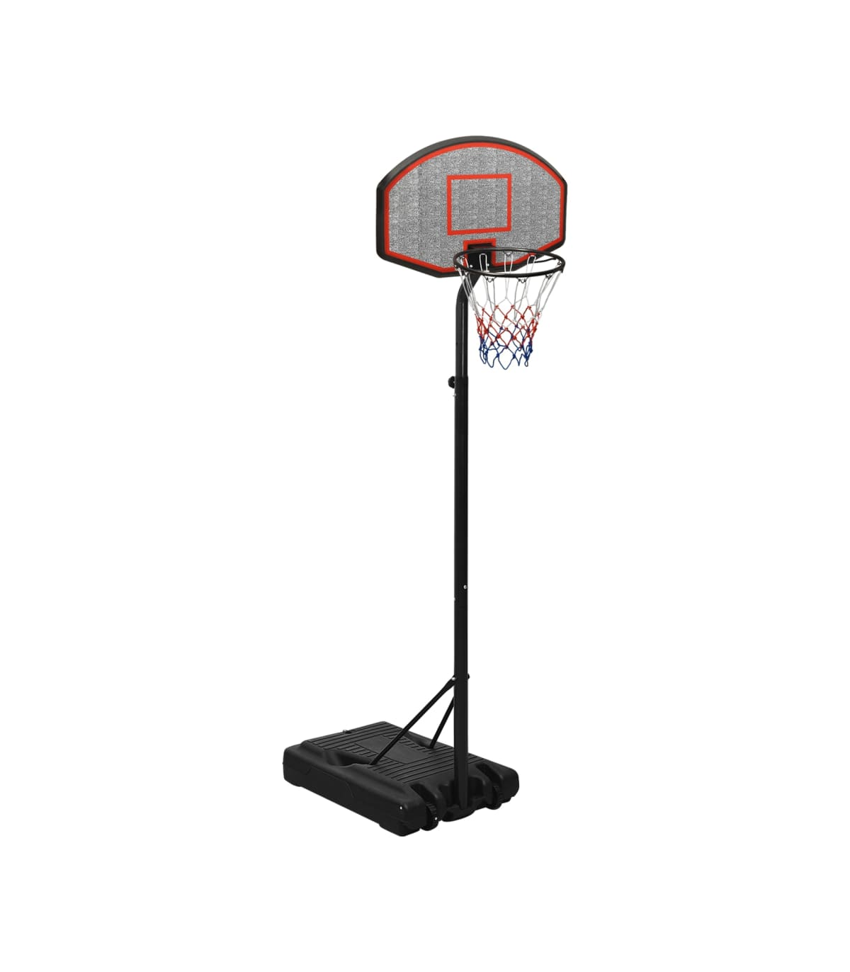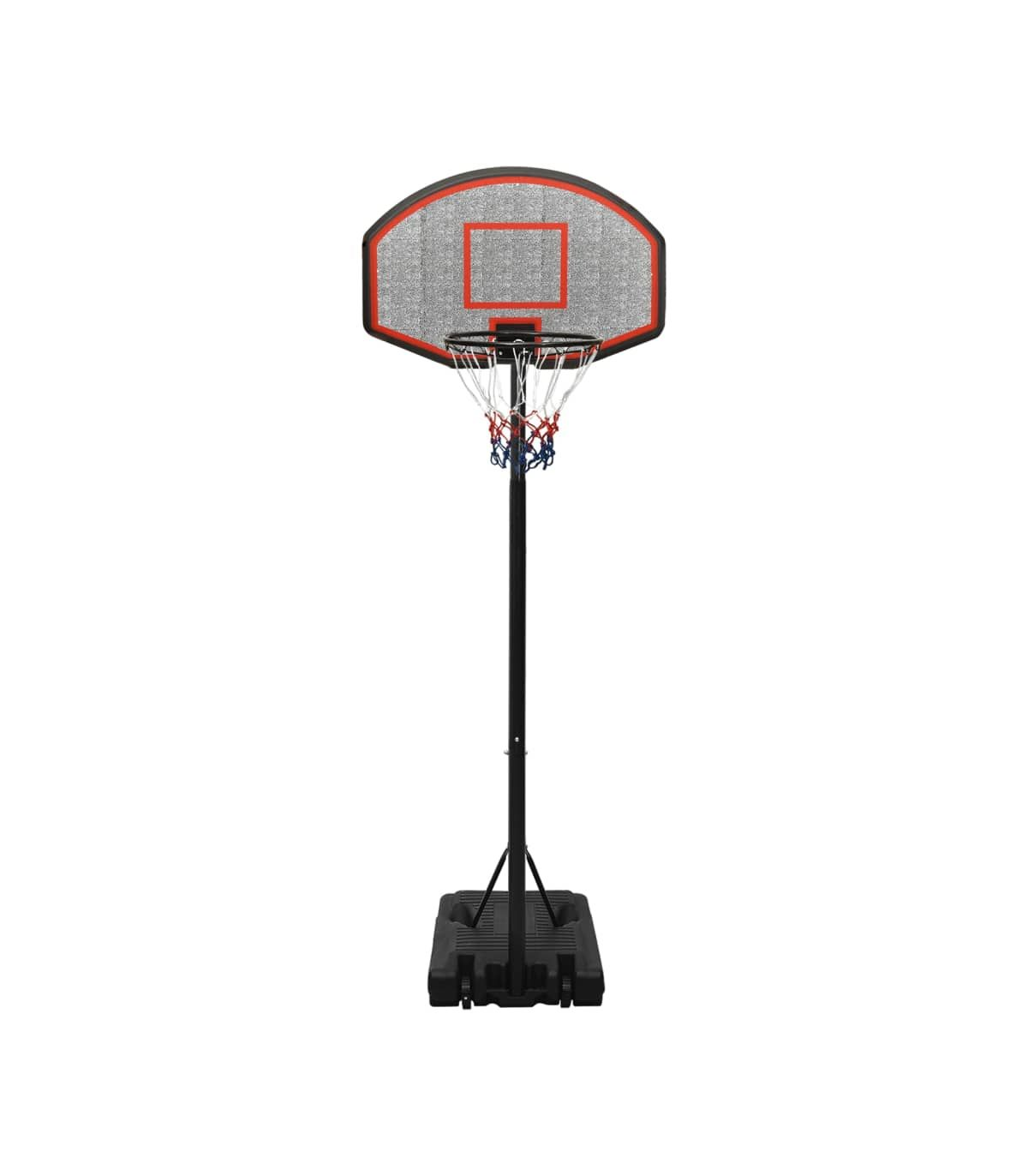 Do you want to enjoy a game of basketball with your friends anywhere, anytime? Then this adjustable basketball stand is a perfect choice! Durable material: The basketball stand is made of polyethene. Polyethene is the most widely used plastic material. It offers practicality as it is UV-resistant, lightweight and easy to maintain. Classic steel-made basketball rim with an all-weather nylon net also makes the basketball stand last long.Adjustable height: The basketball hoop stand has an adjustable height and can stretch to fit different players. This basketball stand can be adjusted from 237 cm to 307 cm in height.Easy to move: The basketball hoop post features portable built-in wheels and can be easily moved.Stable base: The basketball portable stand adopts a triangular stable design. The base can be filled with water or sand, which makes the basketball post more stable.Wide application: This basketball post can be set up in a gym for indoor practice or in the backyard to enjoy friendly outdoor game competitions. Note:Each product comes with an assembly manual in the box for easy assembly.