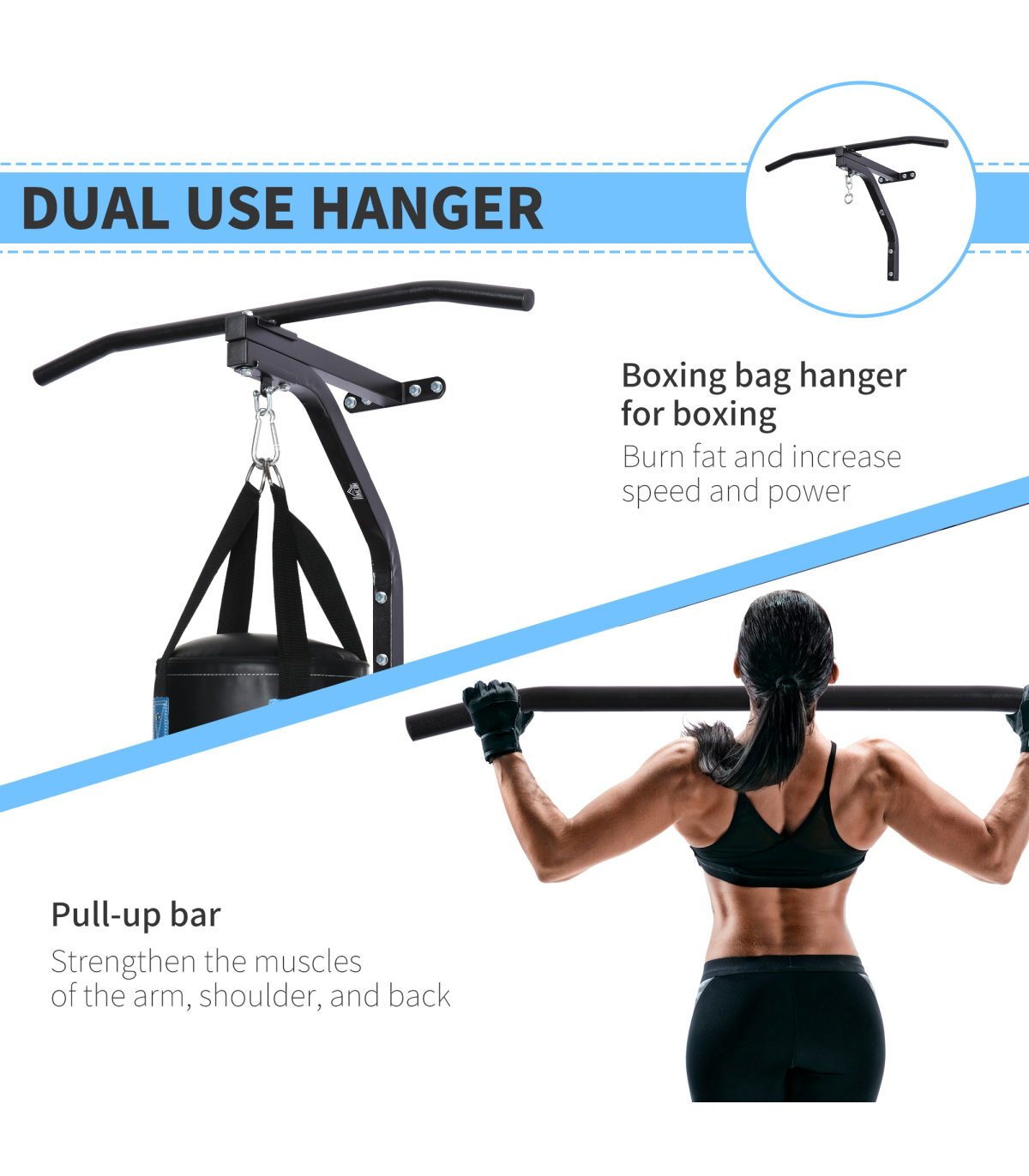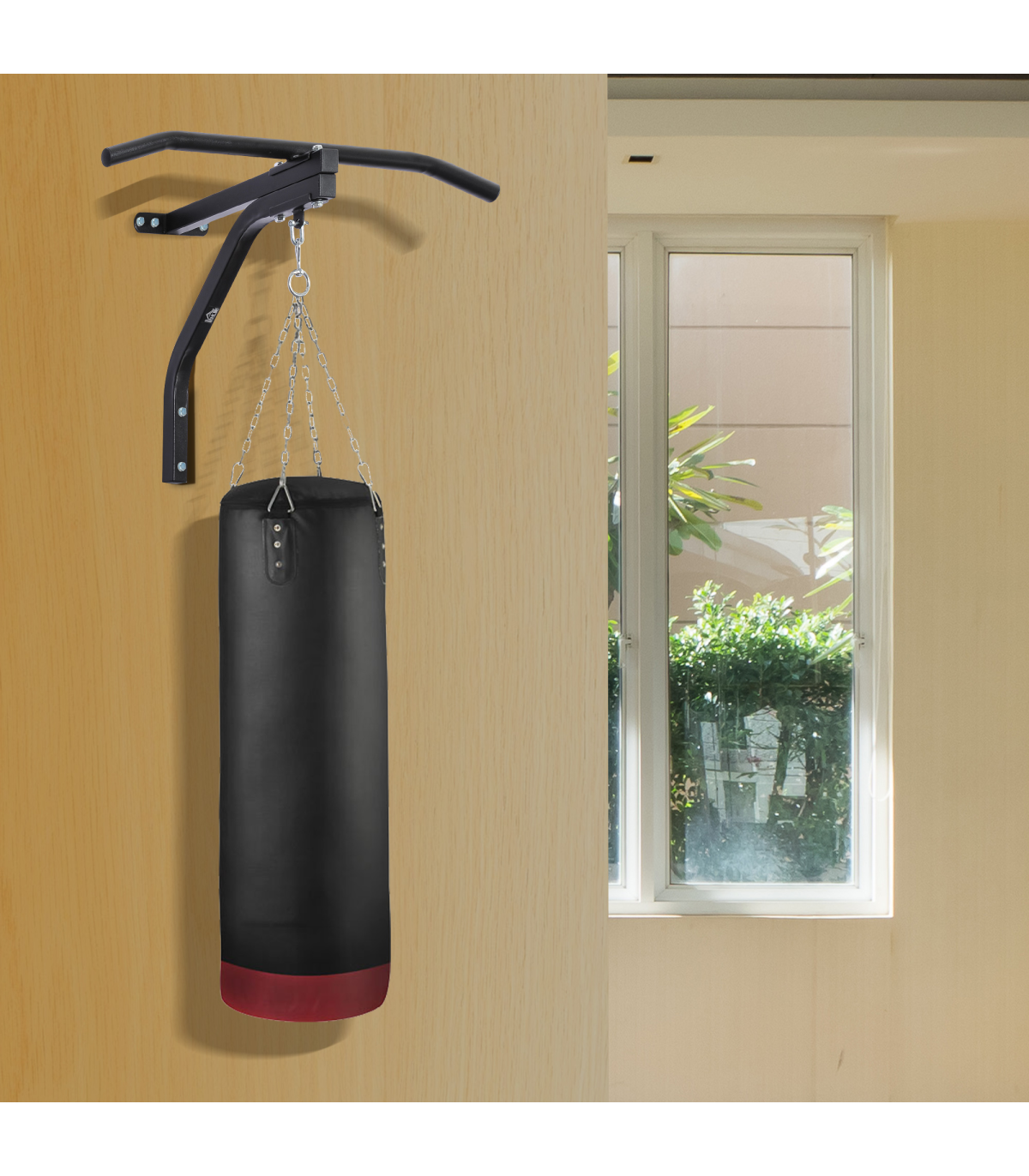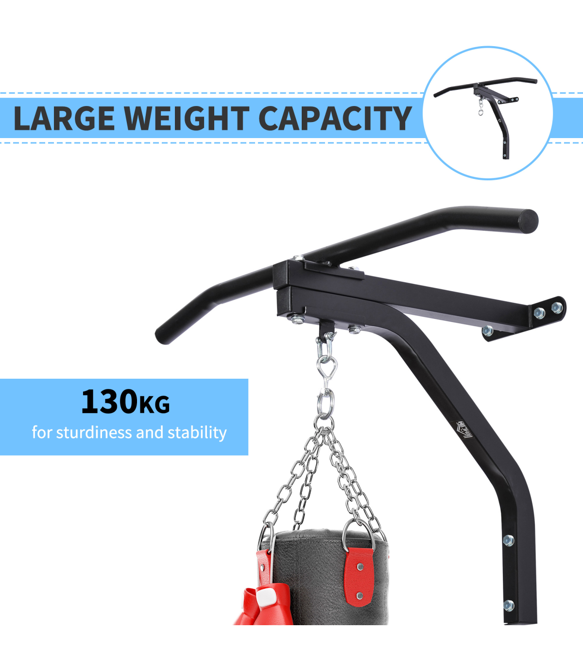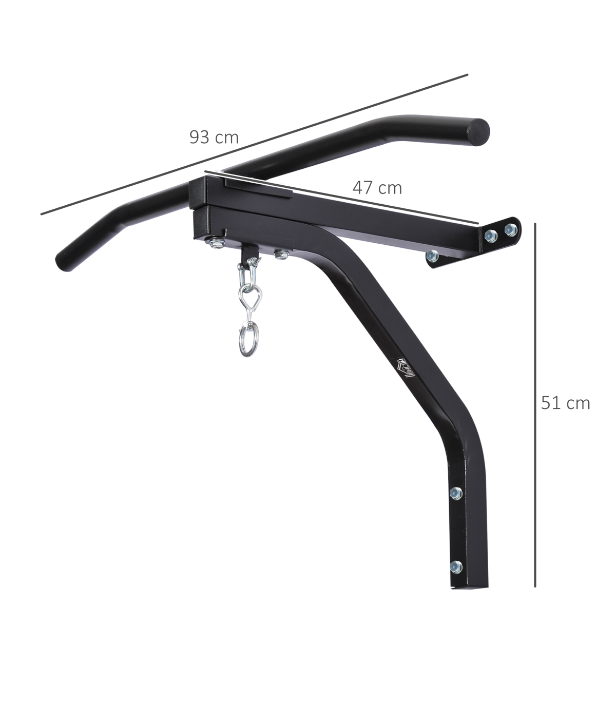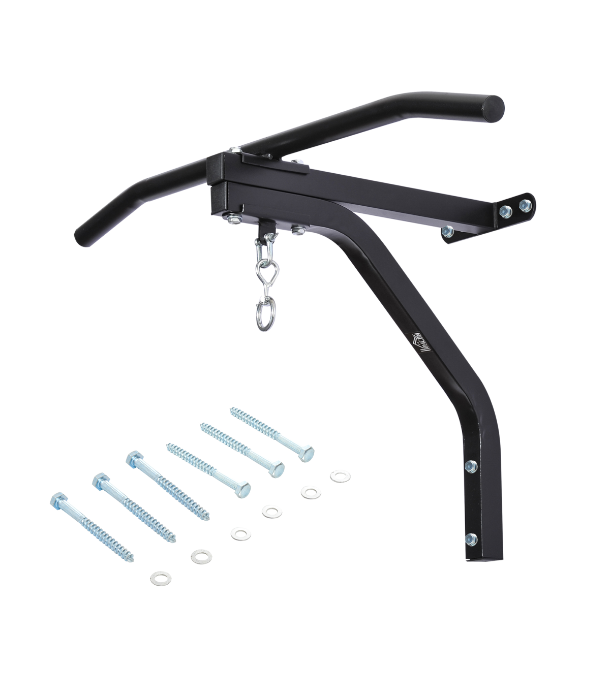 2 in 1 Pull-up and boxing bag hanger for boxing, kickboxing, and MMA heavy bags up to 130kg.Constructed of heavy-gauge solid steel for worry-free usage and superior durability and stability.Comes with heavy bag swivel chain hanger and all necessary hardware. HEAVY BAG NOT INCLUDED.Wall mount system allows for easy attachment to any standard wall.Overall Size: 93L x 47D x 51H cm