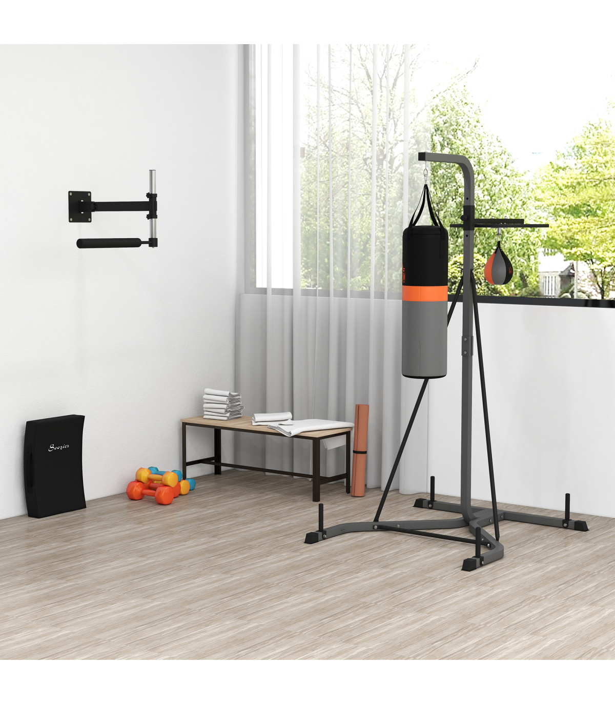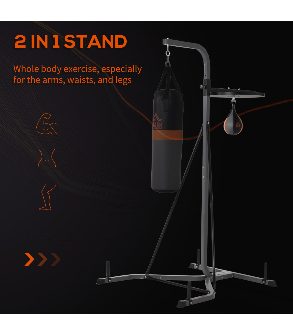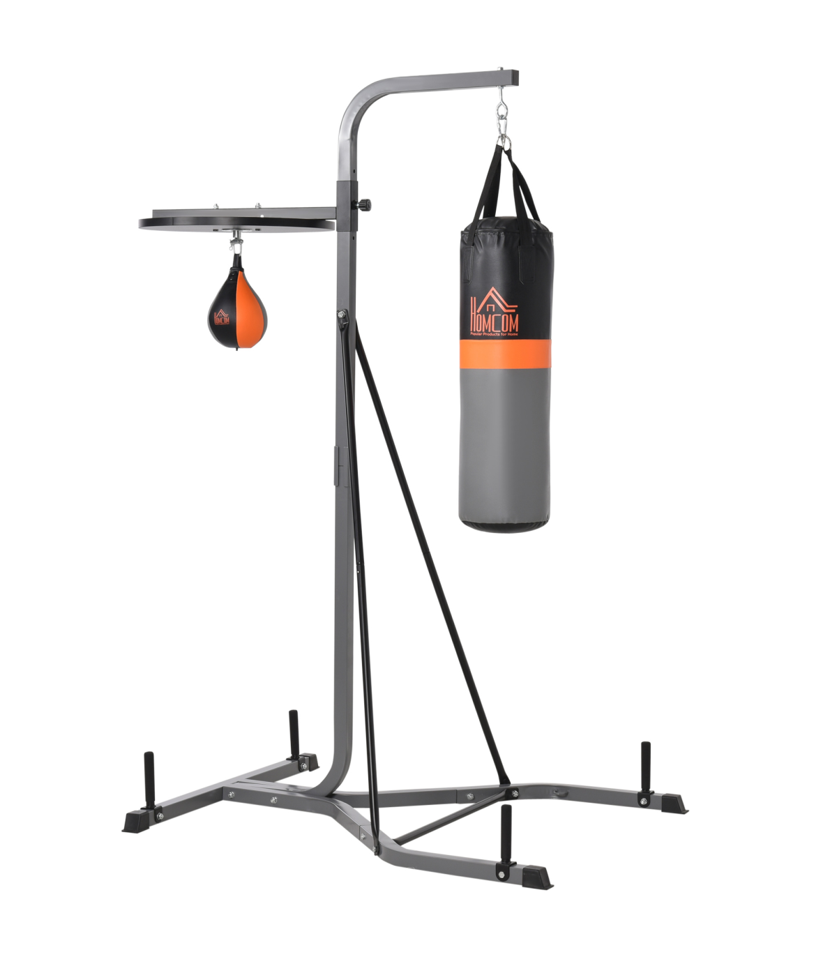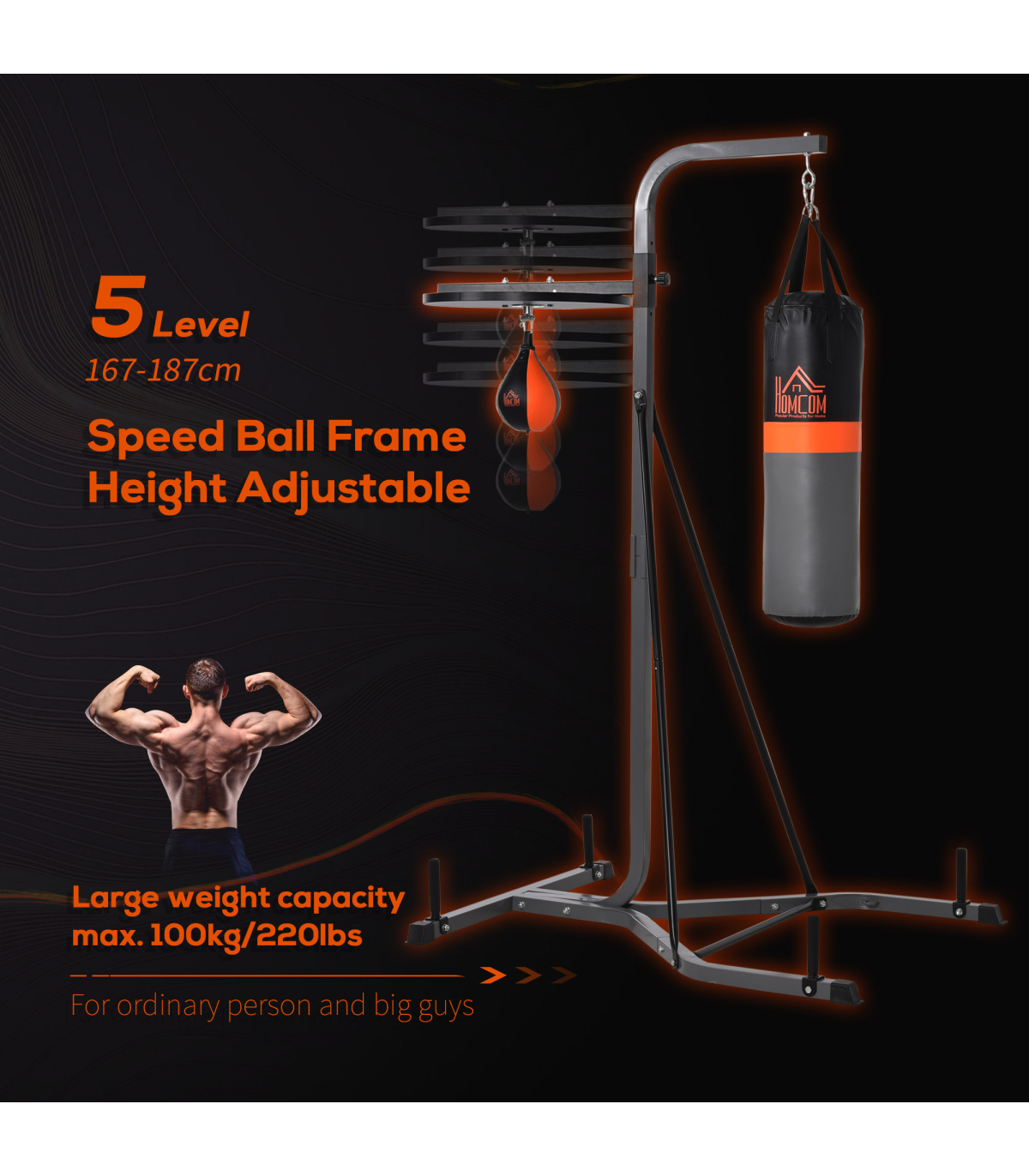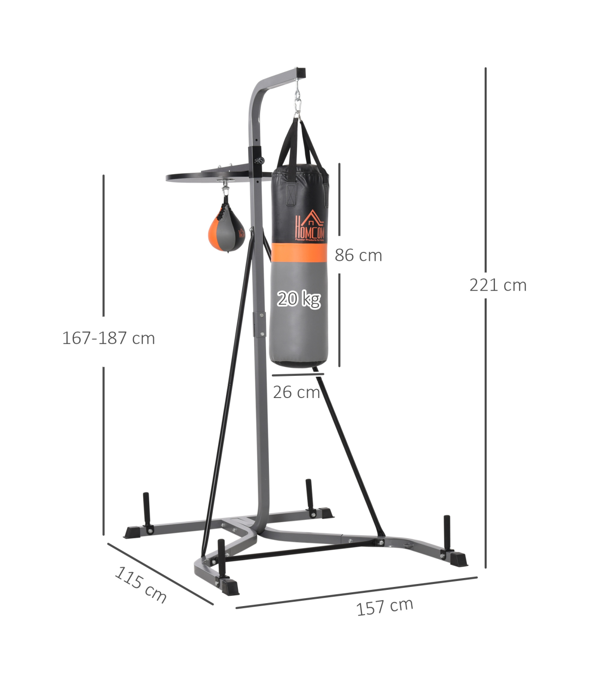 - "Punchbag & Speedball Boxing Station Frame Freestanding Training Home HOMCOM" - Description: - DUO DESIGN: Features a large punch bag and small sand bag, allowing you to work on a variety of exercises and techniques and improve your skills, confidence, and agility. - FREESTANDING: Allows you to set it up anywhere that's convenient for you, whether it's in your bedroom, attic, or garage, etc. - SAFE PADDING: Filled with EPE and cloth for safety when punching, it regains shape quickly for better retaliation and shock absorbency. - SOLID STEEL FRAME: Keeps the unit stable and steady on the floor while using it. - ADJUSTABLE SANDBAG HEIGHT: Offers 5 different height levels of the punching ball from 167cm to 187cm, ensuring the correct position to avoid any strains and injuries, as well as helping you get the best from your workout. - DIMENSIONS: 221H x 157W x 115L cm - MAXIMUM WEIGHT CAPACITY: 100KG. - ASSEMBLY REQUIRED.