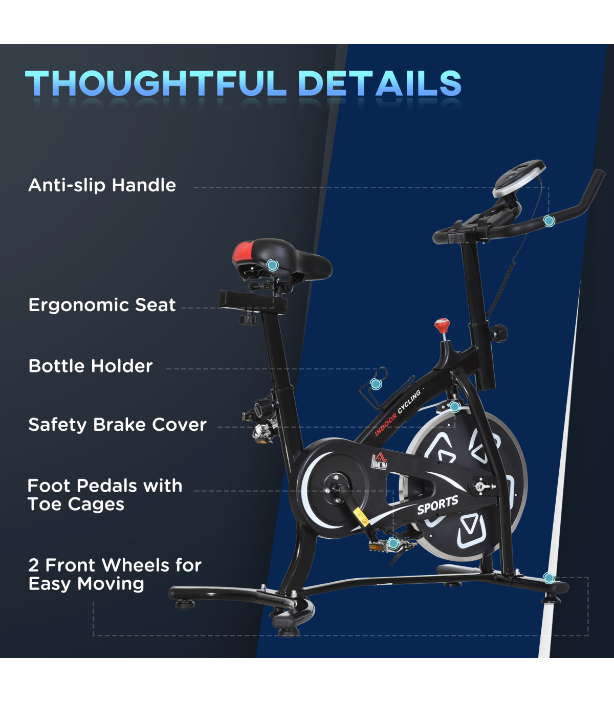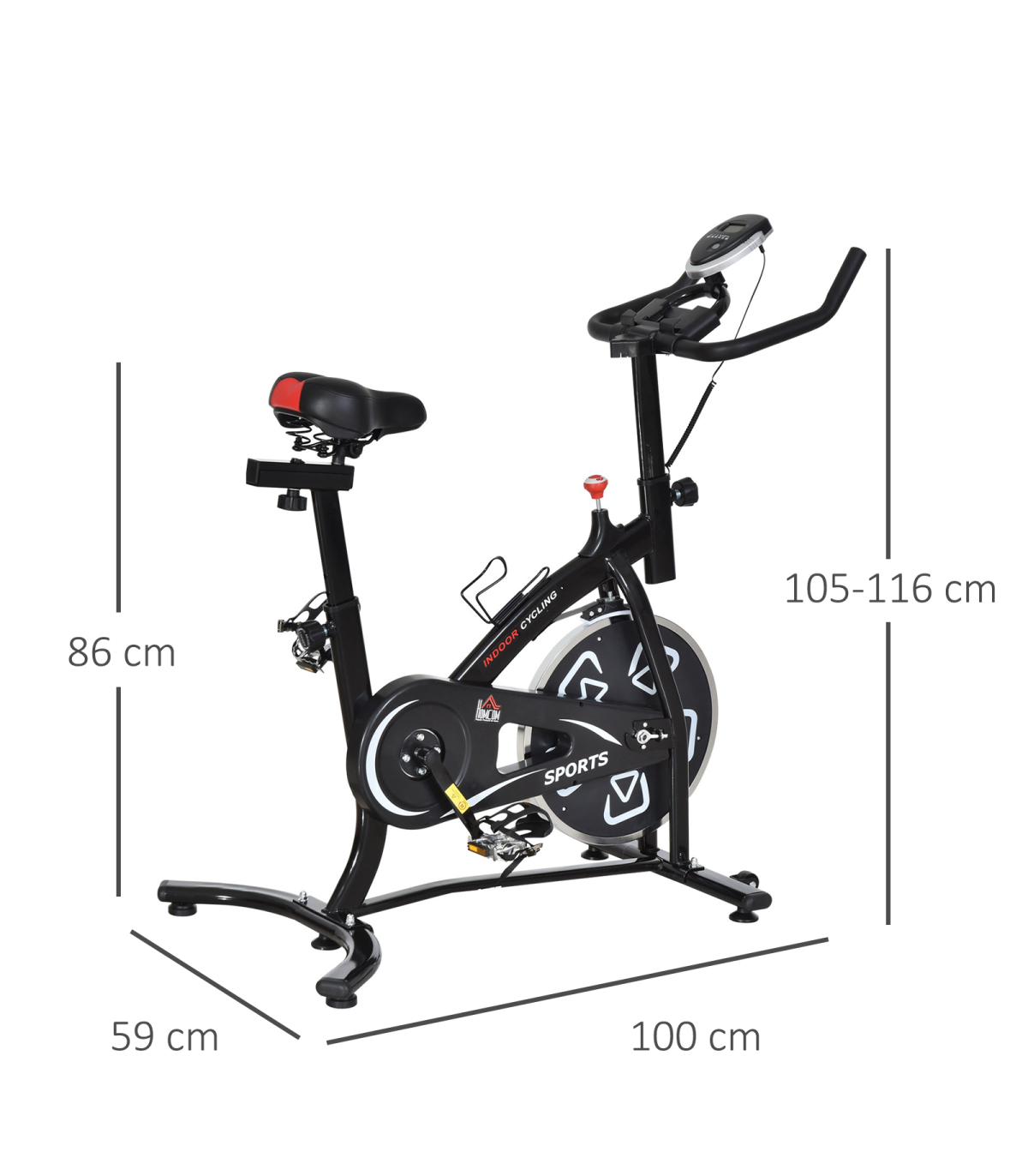 Belt Driven & Heavy Duty Flywheel: Belt driven mechanism ensures smooth workouts. Heavy duty flywheel guarantees stability of the exercise bike while cycling, no worry for disturbing others.Adjustable Seat & Handlebar: The fitness bike features 4 position adjustable seat height with knob control, 5 position adjustable handlebar height, padded PVC seat can adjustable forward and backward.LCD Monitor & Ipad Bracket: LCD monitor records your fitness statistics and keeps your track time, distance, speed, burned calories. The Ipad/Mobile phone mount allows you to enjoy exercising and video at the same time. Bottle holder include for your engergy drink or water.Sturdy Construction: The training bike is constructed of whole steel construction, with triangular frame stand and anti-slip footing, it stand sturdy and stable on ground, hold up to 100kg.Dimensions: General size 59 cm x 100 cm x 105-116 cm, PVC seat size: 26 cm L x 16 cm W, Shelf size: 8 cm L x 6 cm W