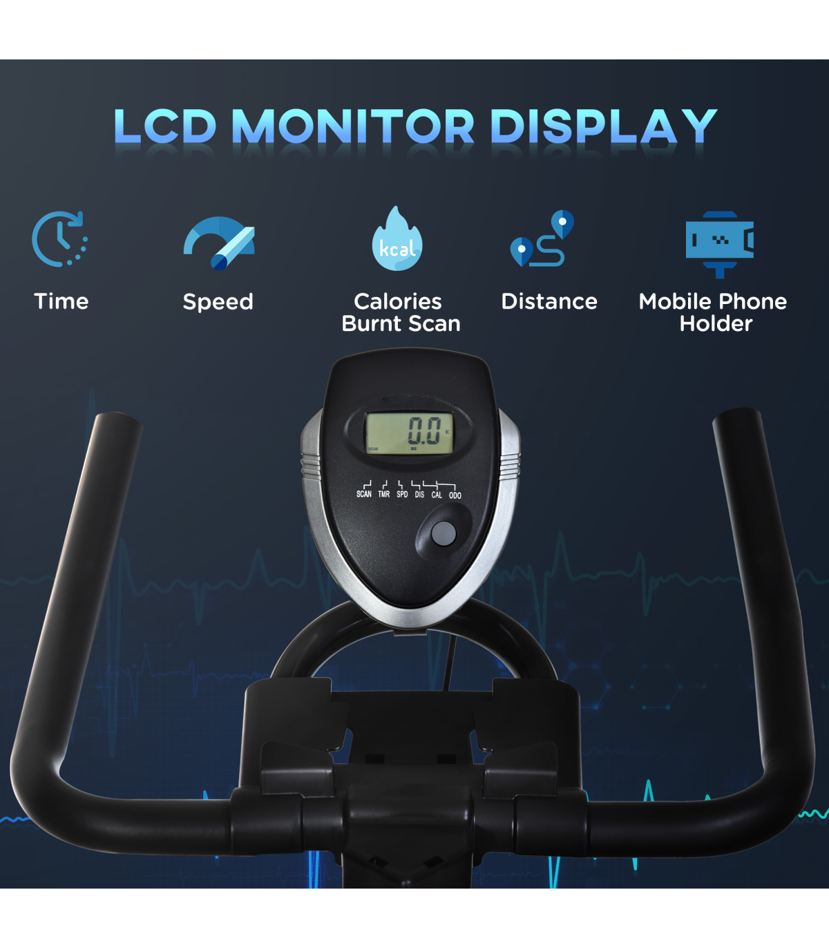 Don't want go to gym? Try out this HOMCOM Fitness Exercise Training Bike at home or office, listen to your favorite music while exercising. It is a full body exercise machine which reduces stress on joints. Its LCD display shows time, distance, speed, and calories. Adjustable seat/handlebar height and resistance allows you to modify your workout level. Triangular frame and anti-slip footing makes it stand sturdy and stable on any indoor space. Start exercising with this new style cycling machine!