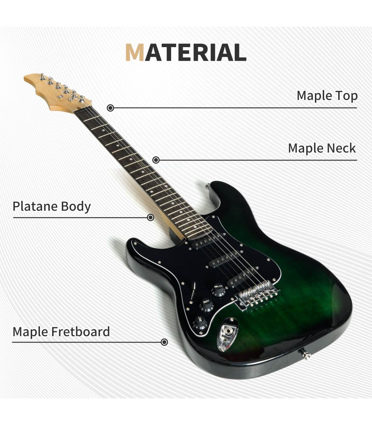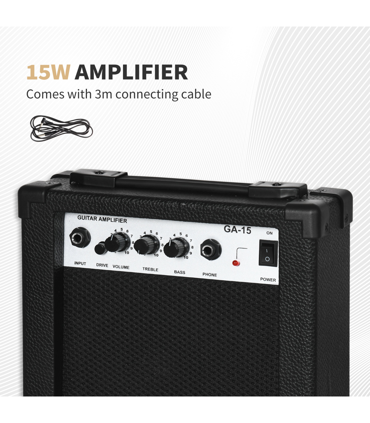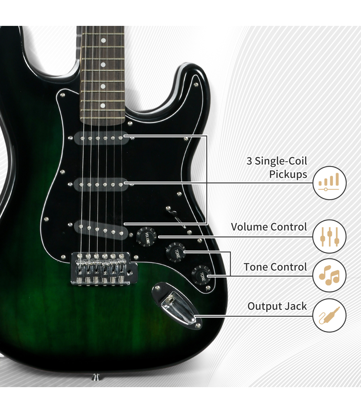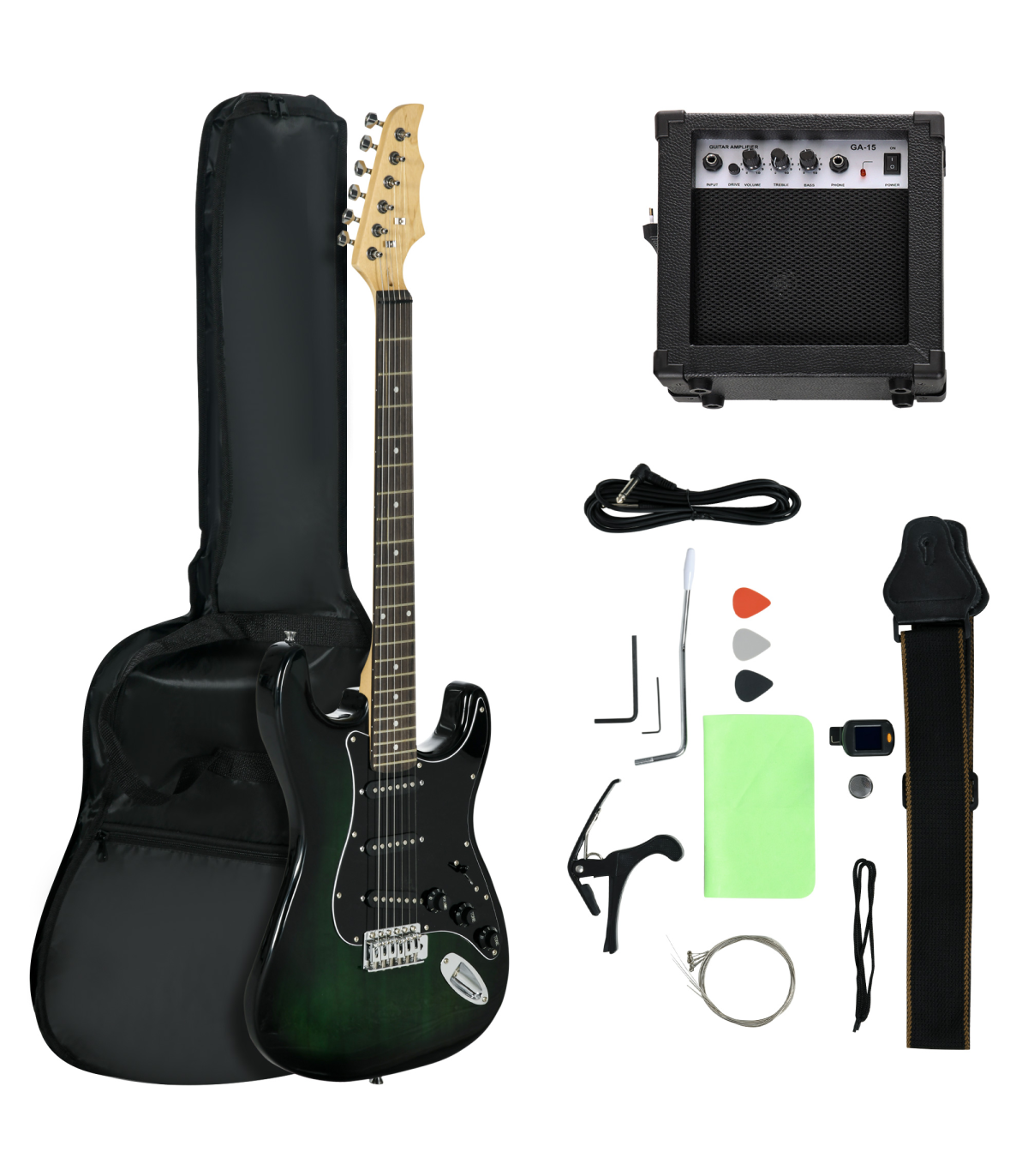 - Three single-coil pickups, a volume control knob and a tone control knob on the body - Comes with amplifier, carry bag, shoulder strap, three picks, digital tuner, capo, spare strings, wrench, cleaning cloth and 3 metre connecting cable - 15W Amplifier with built-in speaker, volume control, tone control and phone jack - The body is painted and polished to present a mysterious outlook - Tuning with the tuning pegs and the digital tuner