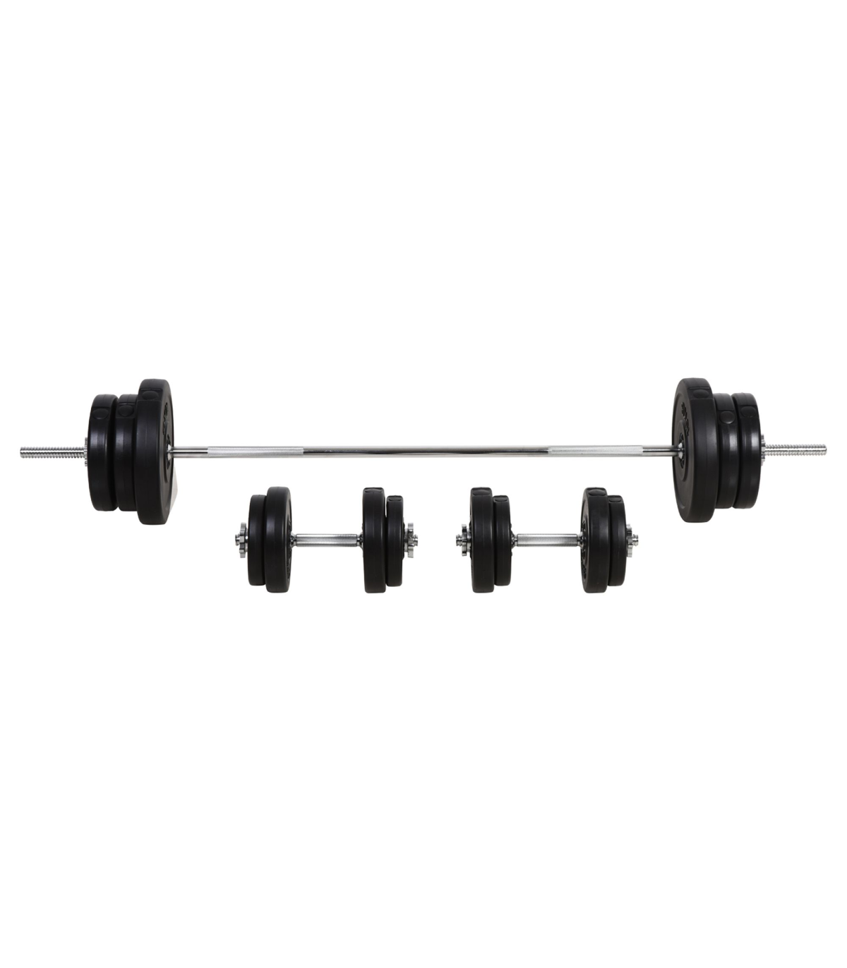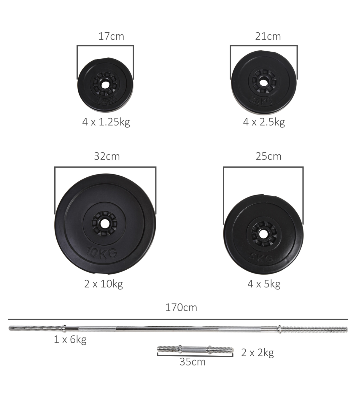● Barbell weights set: 2x 10kg/4x 5kg/4x 2.5kg/4x 1.25kg plates, 2x dumbbell bars and a barbell bar ● Quickly alternate between dumbbell and barbell ● Steel frame with plastic to avoid damaging the floor, suitable for home use ● Knurled handle is better to grip and increased safety ● Great to help condition, shape body and strengthen muscles ● Can be used in home, gym and sports area ● Just takes a few seconds to assemble it● Colour: Black ● Material: Steel, Plastic ● 10kg Plate Dimension: Ф32 x 6Tcm ● 5kg Plate Dimension: Ф25 x 5Tcm ● 2.5kg Plate Dimension: Ф21 x 4Tcm ● 1.25kg Plate Dimension: Ф17 x 3Tcm ● 2kg Dumbbell Bar Dimension: Ф2.5 x 35Lcm ● 6kg Barbell Bar Dimension: Ф2.5 x 170Lcm ● Item Label: B1-0013