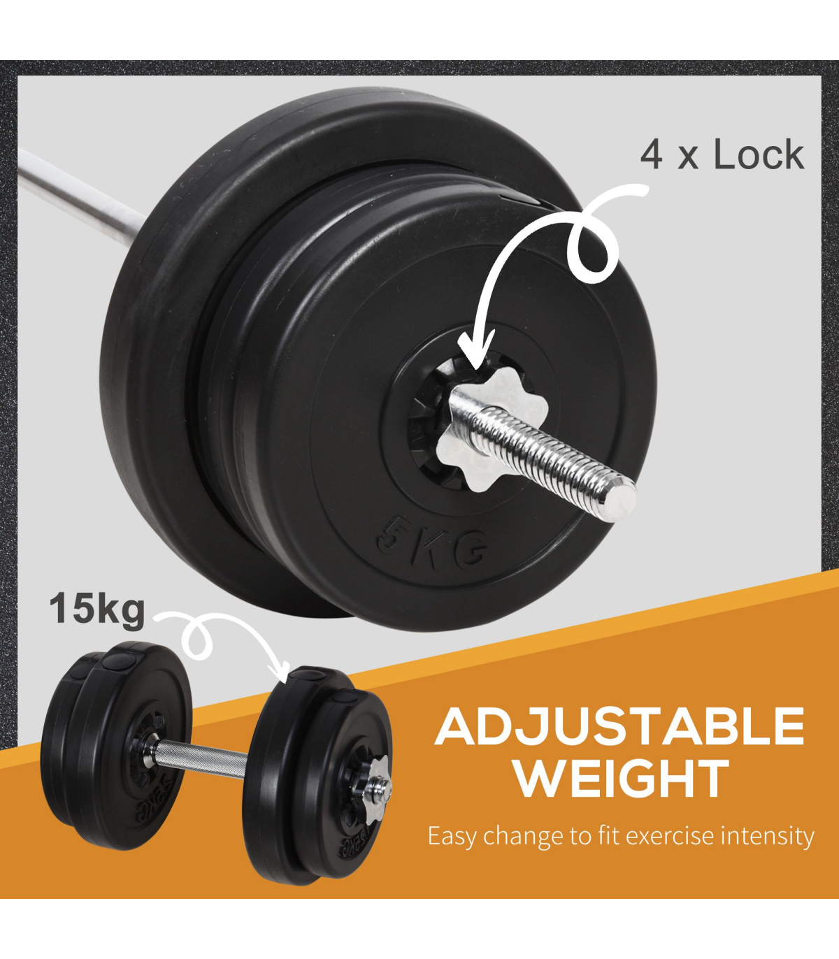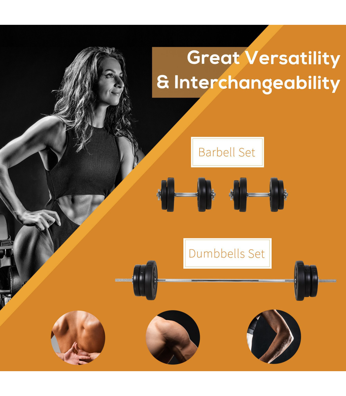 The HOMCOM 65kg dumbbell and barbell set is versatile for body building. Quickly switch between dumbbell and barbell exercises to enhance muscle strength, endurance, or cardiovascular health. Built with steel and plastic, the body pump bar and weights offer excellent resistance to compression and abrasion. Assembly takes just seconds.