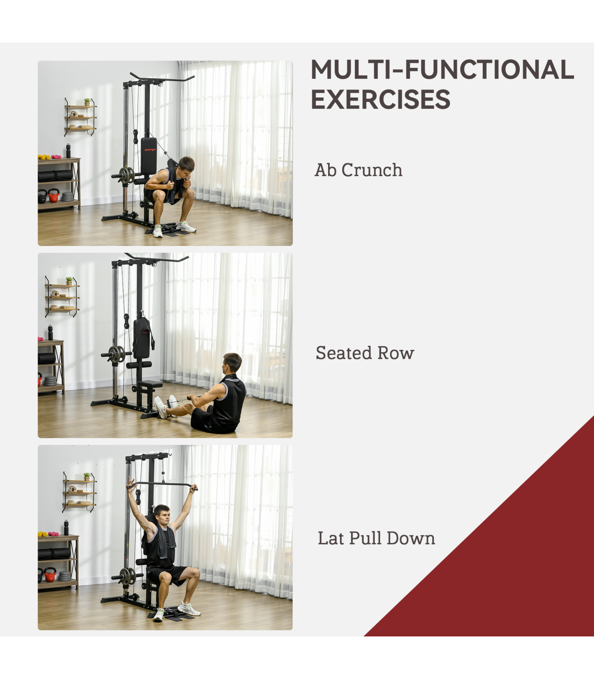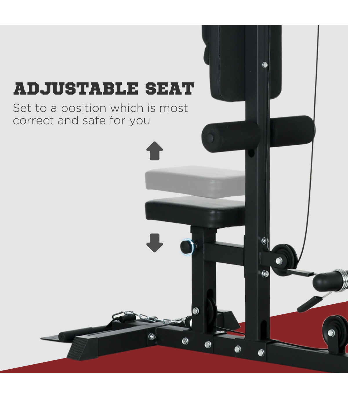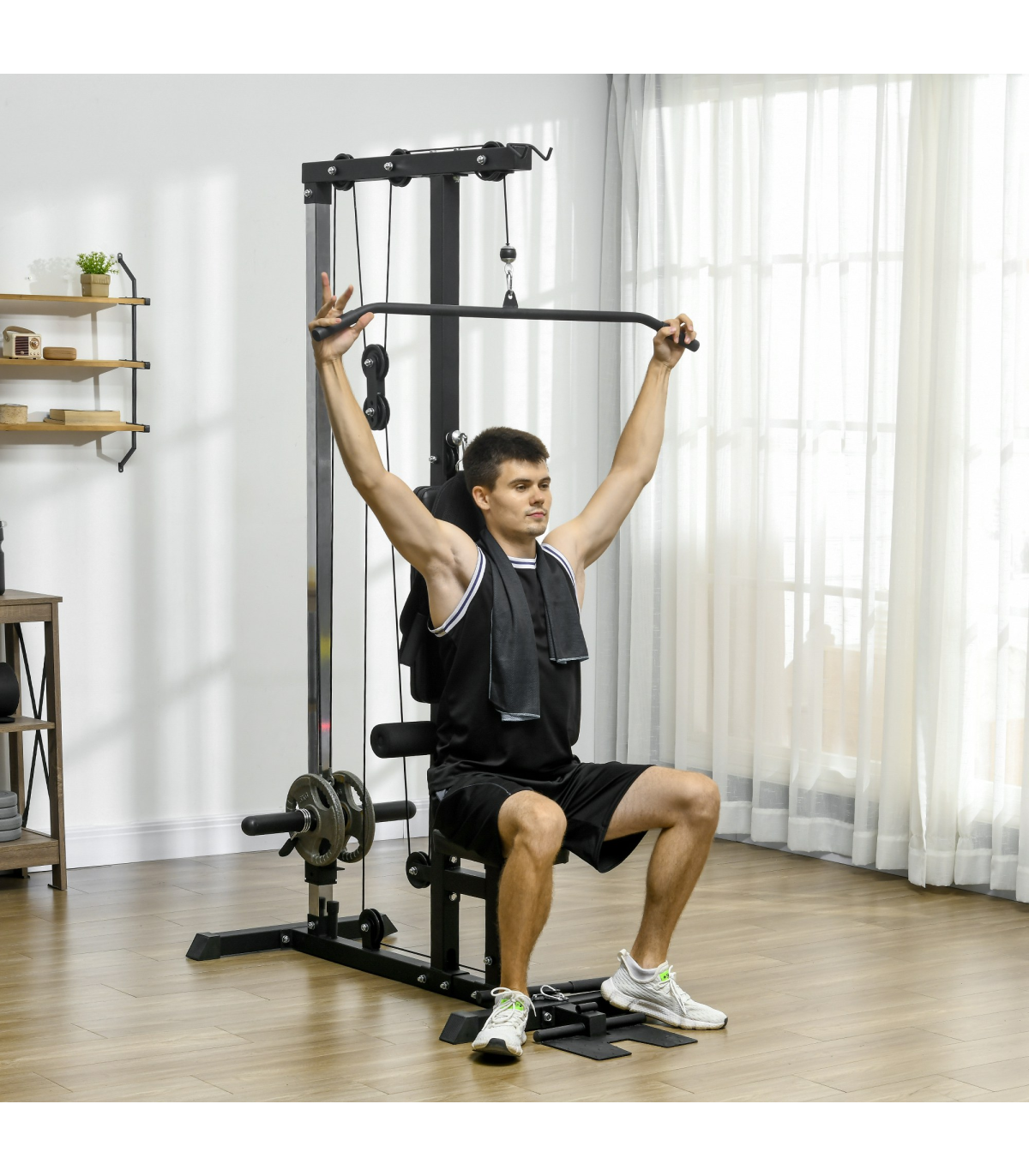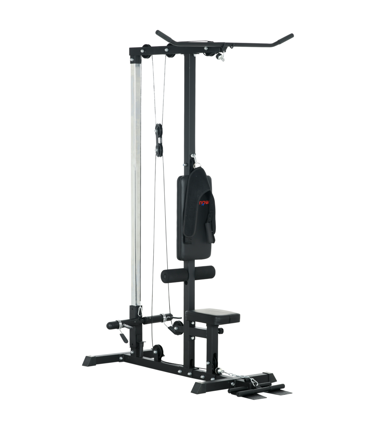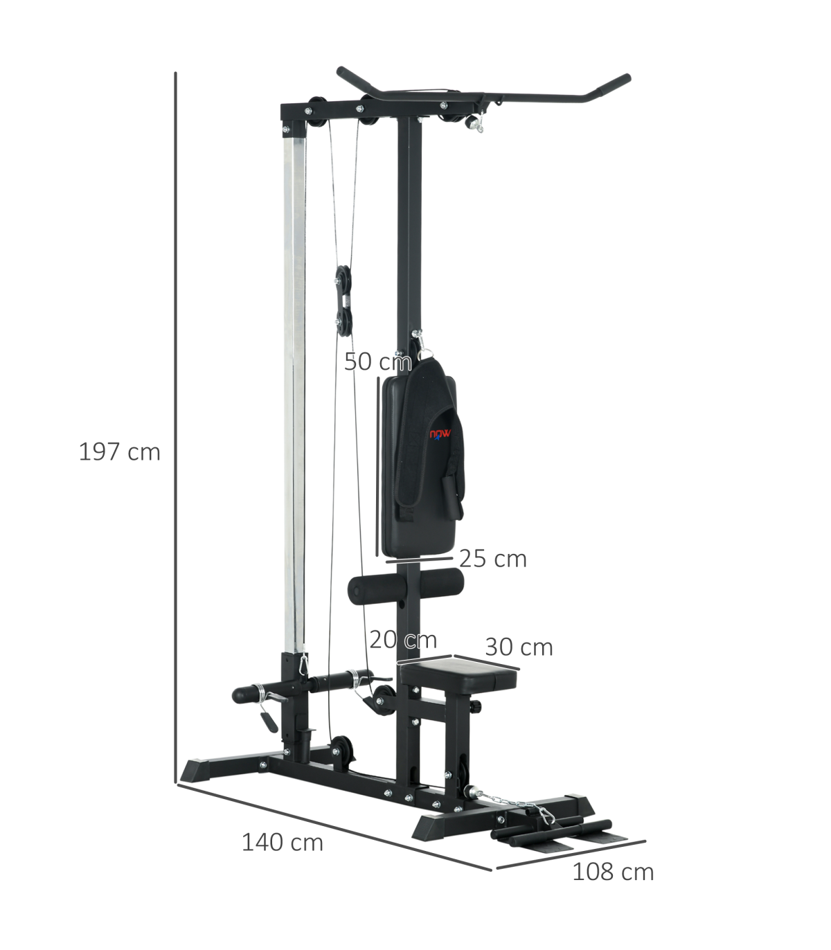 ● Lat pull down and low row pulley station ● Comes with adaptors, compatible with both 2.5cm and 5cm opening weight plates (not included) ● Non-slip 90° flip-up wide pedal ● Padded seat adjustable to four different heights ● Strong painted steel frame ● Assembly required● Colour: Black ● Materials: Steel, PU ● Overall Dimensions: 140L x 108W x 197Hcm ● Pull-down Bar Size: 2.5Dia. x 108Lcm ● Low-row Bar Size: 2.5Dia. x 38Lcm ● Seat Size: 30L x 20W x 42-51Hcm ● Back Size: 50L x 25Wcm ● Foot Pedal Size: 30L x 20Wcm ● Max Counterweight: 25kg for a side, 50kg in total ● Weight Capacity: 110kg ● Item Label: A91-293V00BK