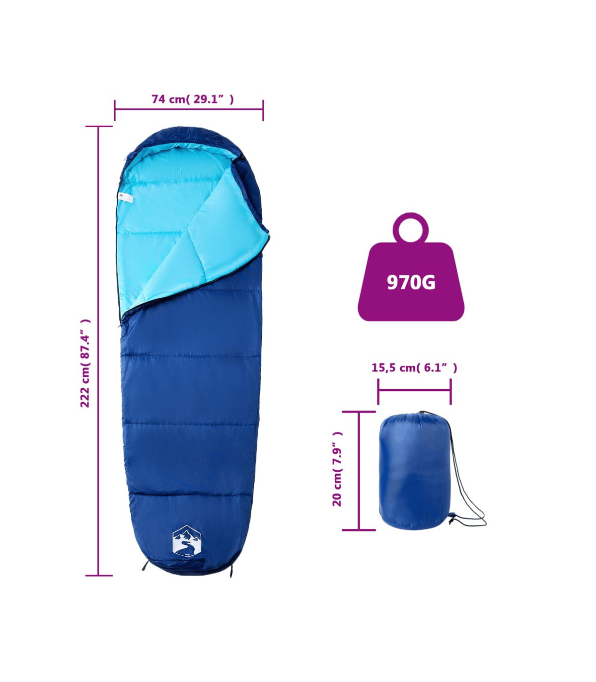 • Sleeping bag size: 222 x 74 cm (L x W)