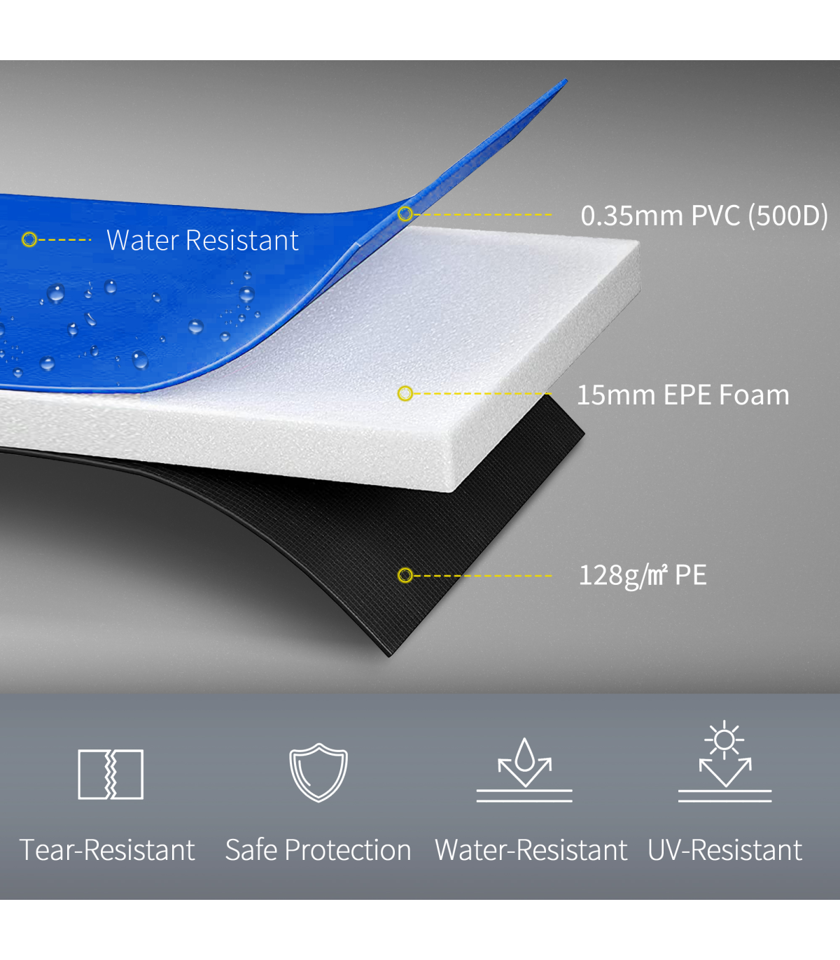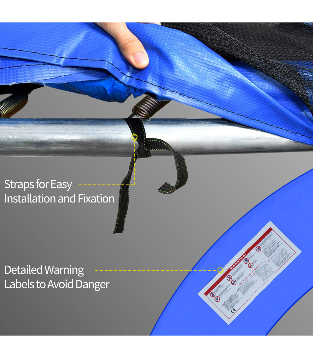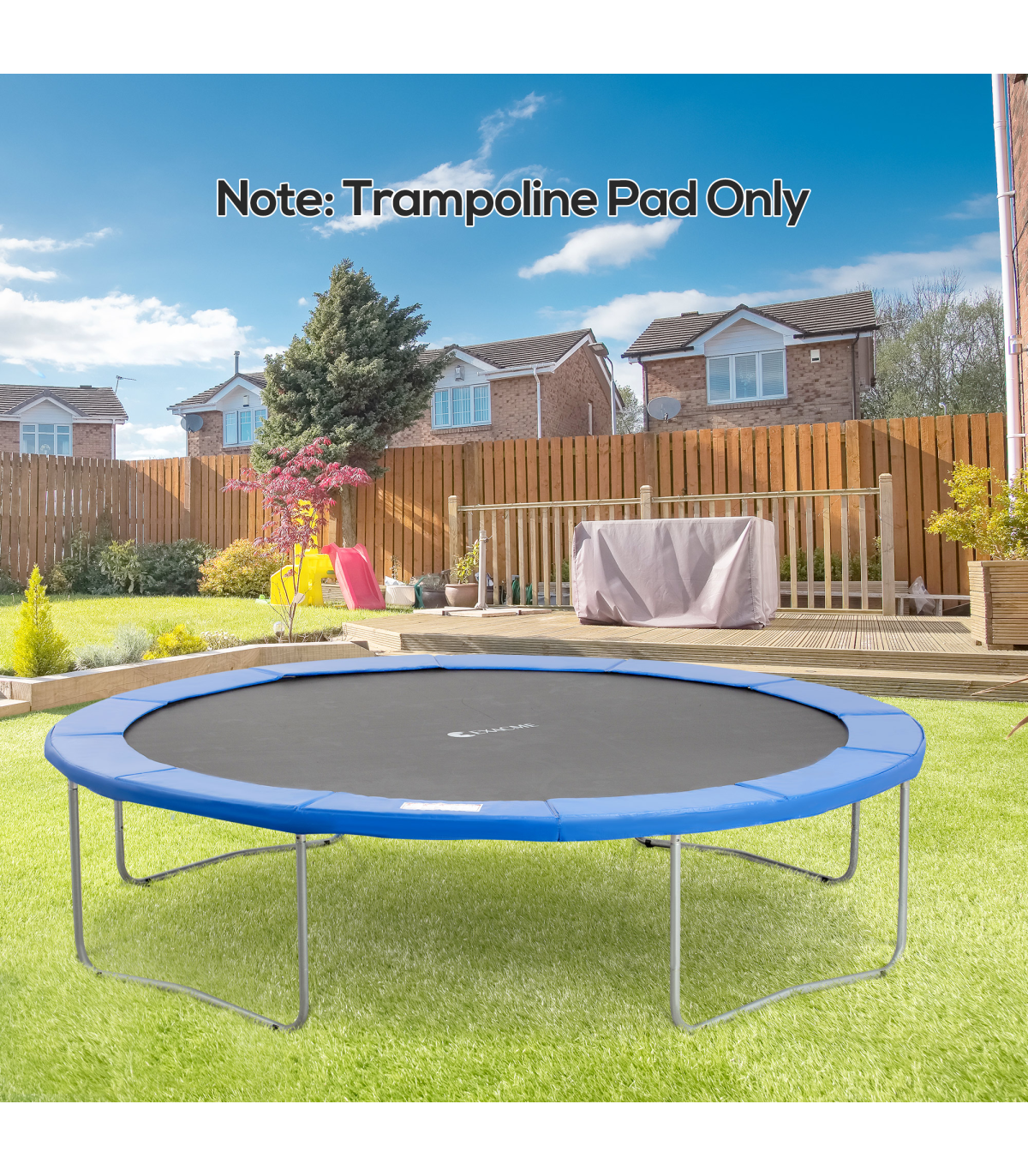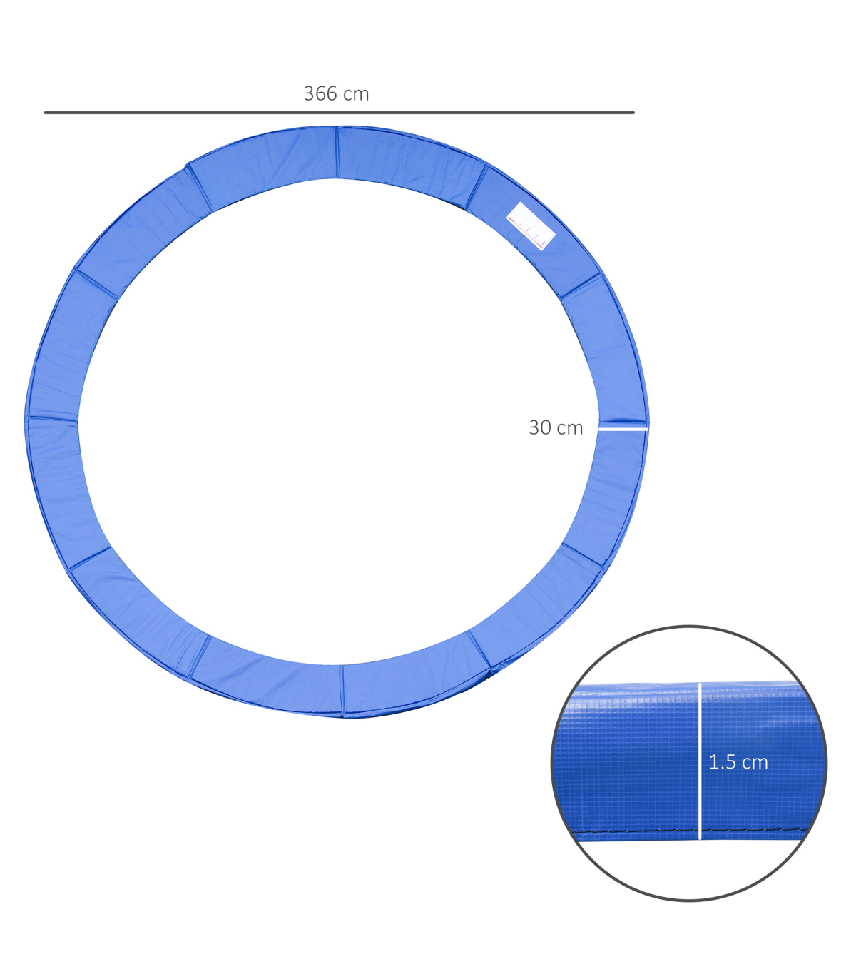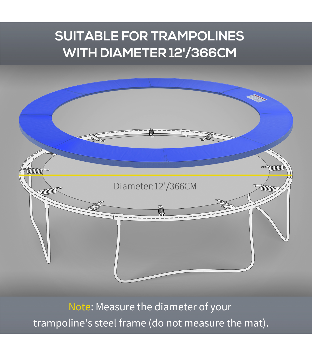12ft Trampoline Pad Surround Pad Thick Foam Replacement - Spare Blue" Description: - PAD MEASURE: 366cm trampoline safety pad is designed to protect users from being scratched or trapped by the spring hooks and space between springs. - SELECTED MATERIAL: Safety cover made of 500D PVC on the top and 128g/㎡ PE on the bottom, deep side skirt overlaps full trampoline frame. - EASY TO INSTALL: Easy to install with this round replacement secure spring cover on your trampoline frame, which is more convenient and quick. - PROFESSIONAL PROTECTION: This safety pad is high density, EPE closed-cell foam inside for shock absorbent platform, water and mildew resistant. It can protect all metal springs on rainy or wet days. - DIMENSIONS: Overall Size: 366cm. Pad width: 30cm. Trampoline is EXCLUDED. NOTE: Trampoline diameter should not exceed 366cm.