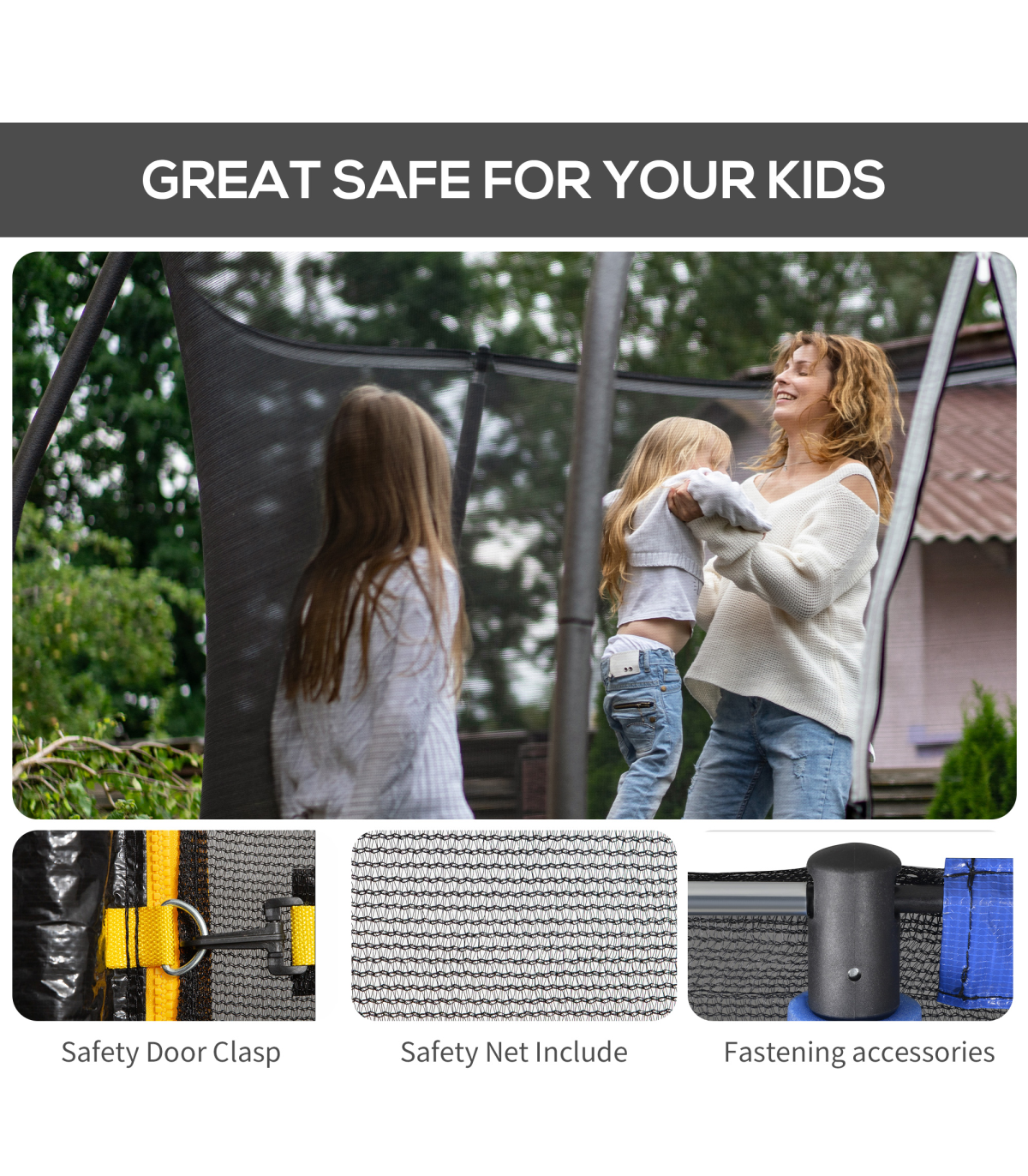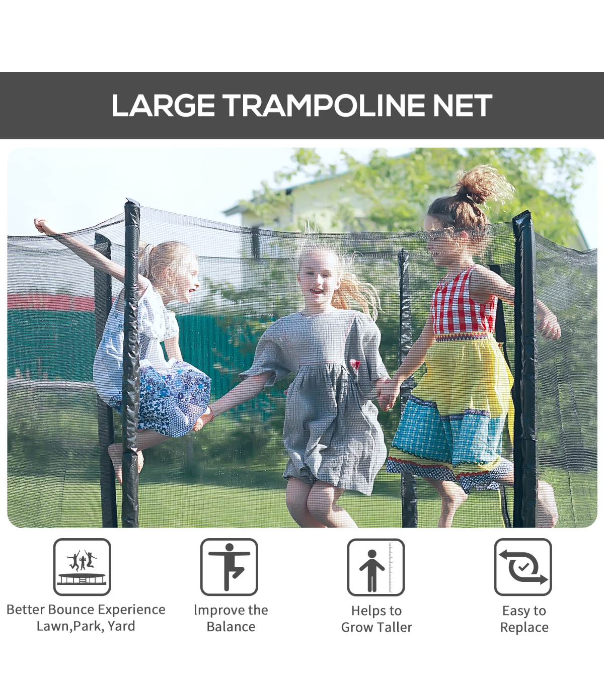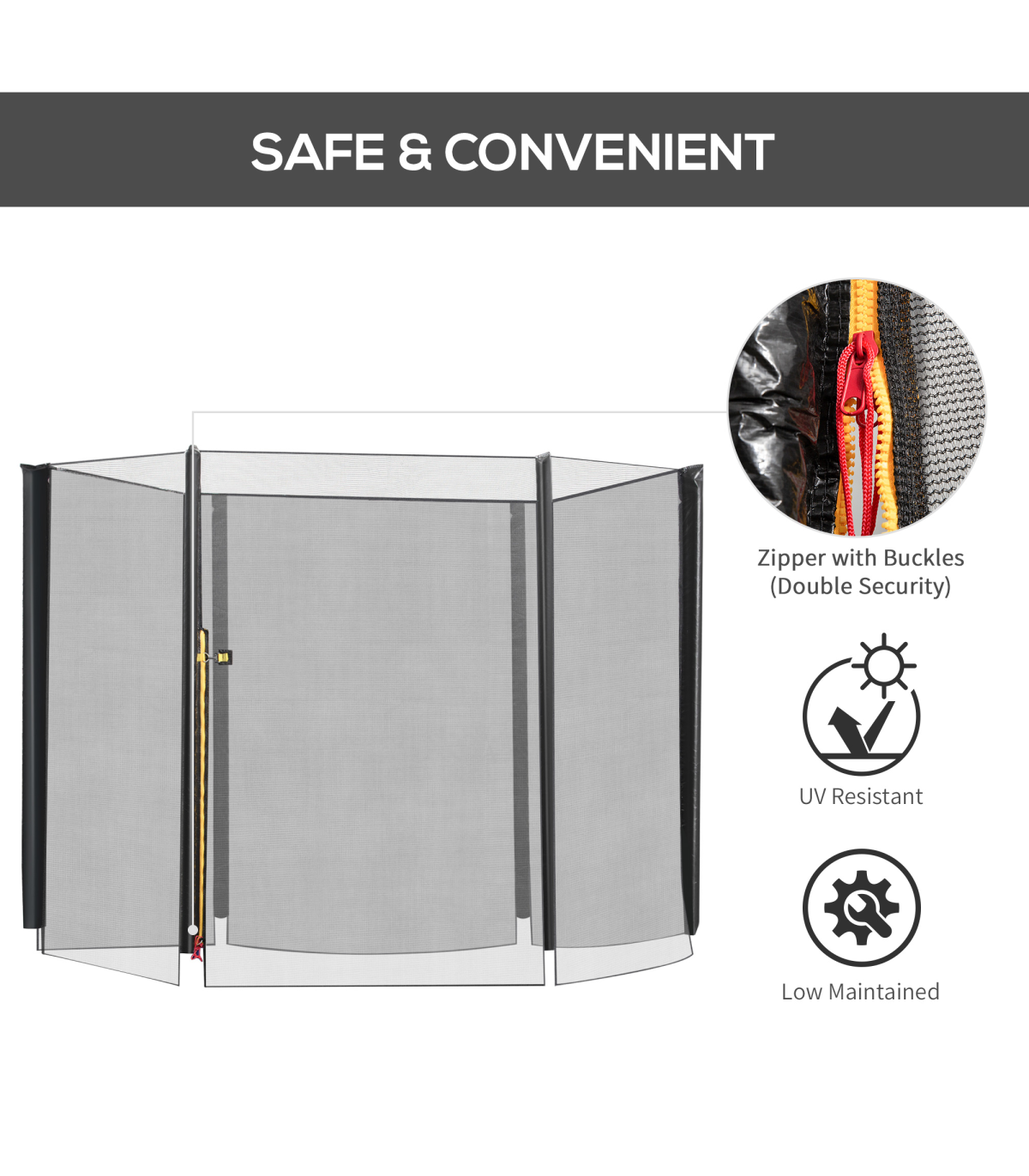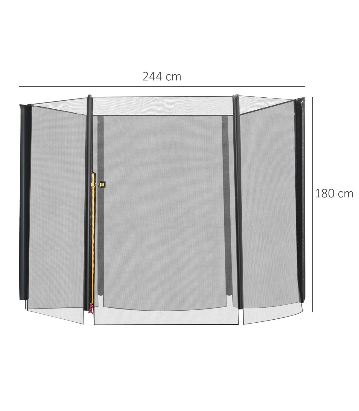 8' Trampoline Bounce Safety Fence Round Trampoline Enclosure Net HOMCOM Description: - 8FT TRAMPOLINE REPLACEMENT NET: 8FT Trampoline Net Enclosure only, trampoline not included, to create a safe and fun jumping experience without limiting visibility. - GREAT SAFETY: Ensures maximum safety by connecting the net between the pad and jumping mat. Features dual closure entry with zipper and buckles. - PREMIUM MATERIAL: Made with high density PE mesh for increased solidity and durability. Fine weave to prevent fingers from getting trapped. - EASY TO INSTALL: Comes with flexible and adjustable straps with quick-lock buckle for 6 × 45mm straight poles or 3 arches. - EASY ACCESS: Equipped with a zippered door for convenient entry. Suitable for trampoline 244cm with 6 poles.