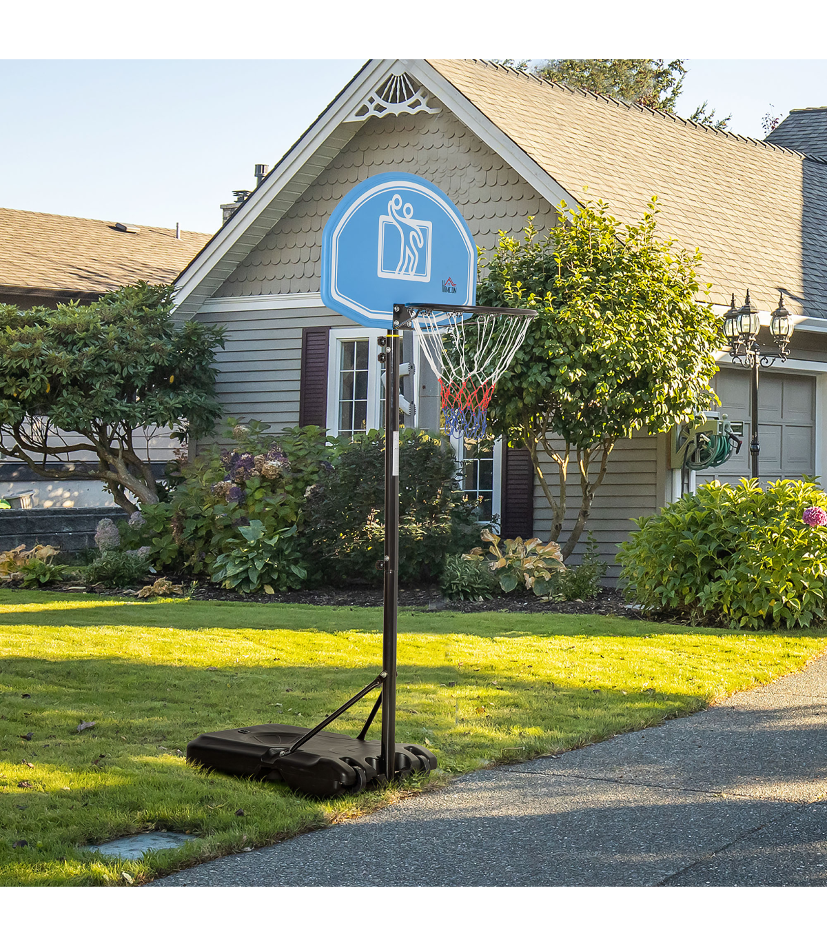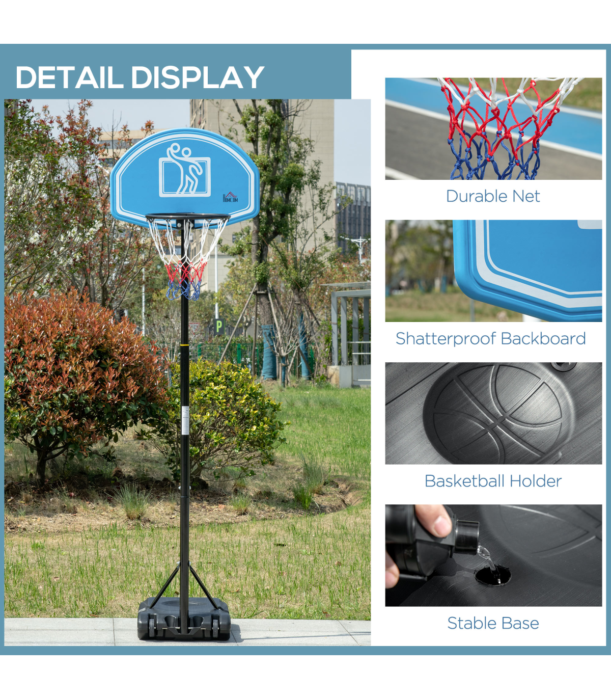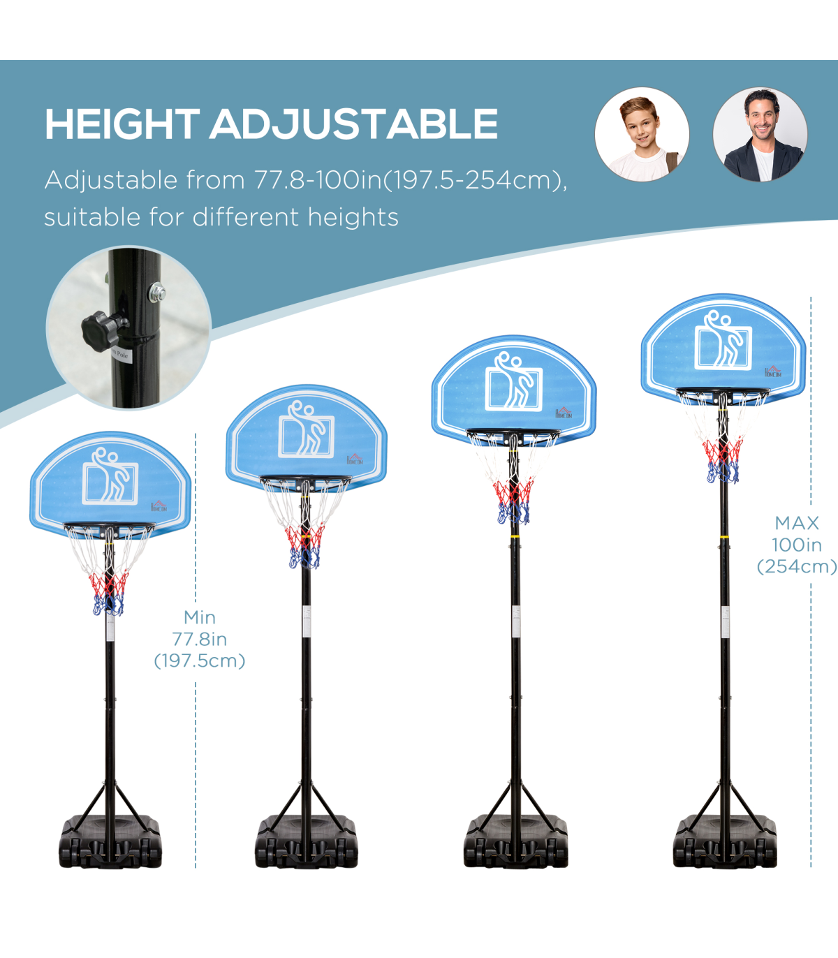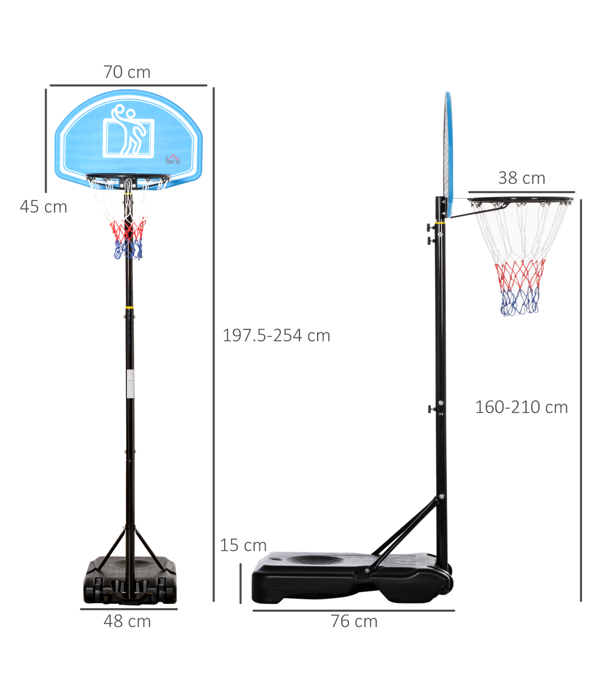 ? Backboard: 45H x 2D x 70Wcm. Overall height: 195-245cm. Basketball hoop: 160-210Hcm. Base: 15H x 76L x 48Wcm