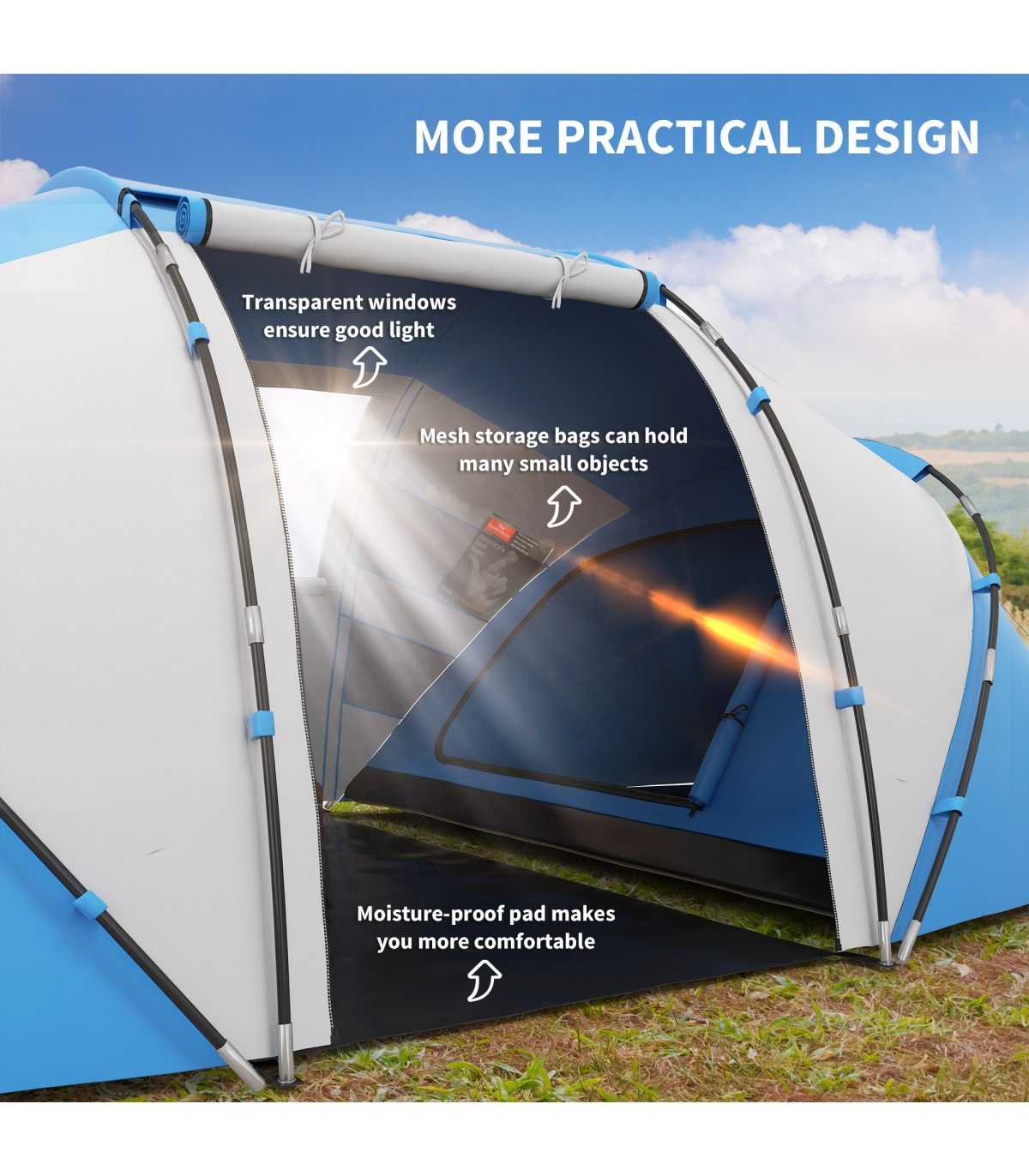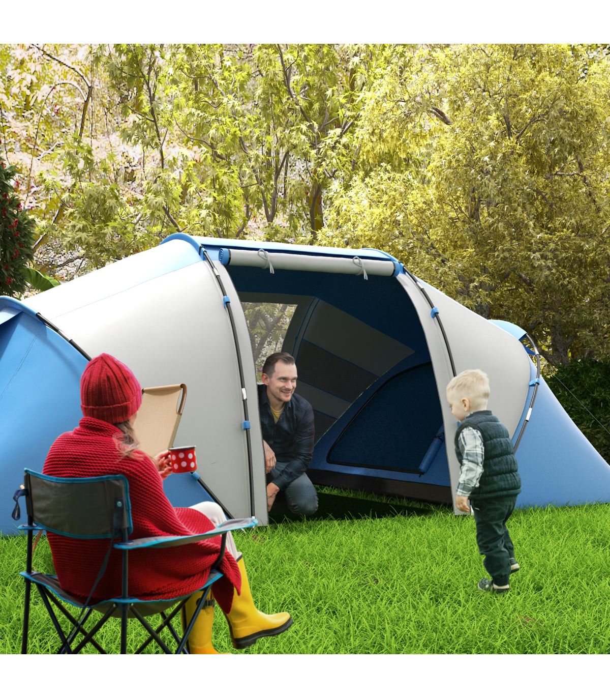 4-6 PERSON TUNNEL TENT: Features 2 bedrooms and a living area, suitable for 4-6 people. Perfect for families and friends camping together