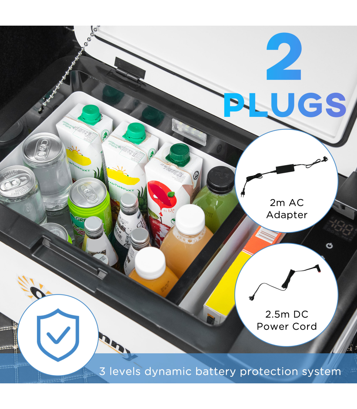 - SMART BATTERY PROTECTION & DUAL-USE: Comes with 110/240V AC and 12/24V DC adapters, allowing independent or car use. The portable 12v fridge freezer for car has a shut-off feature when the measured DC voltage goes below the cut-off value to prevent battery depletion.