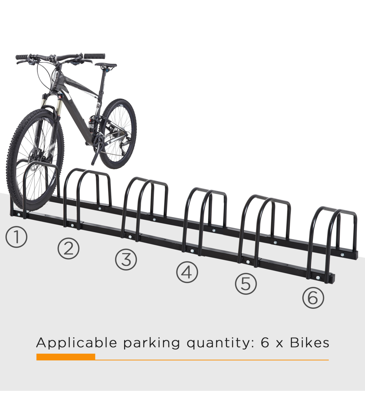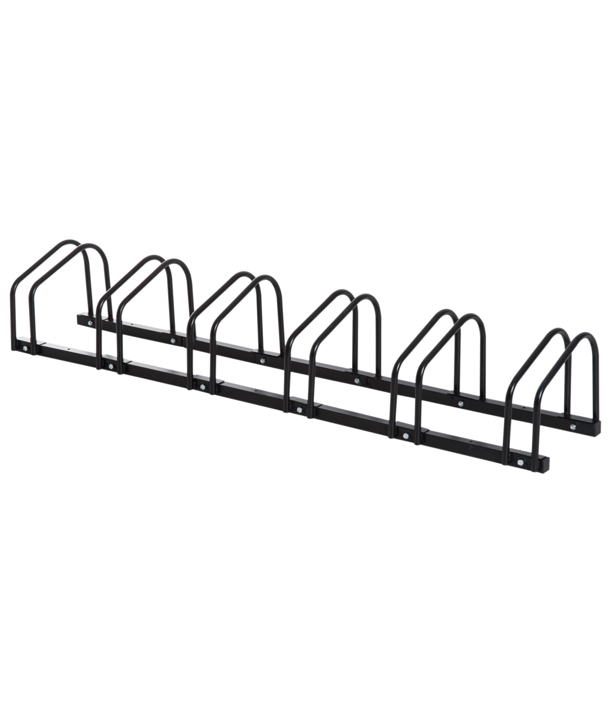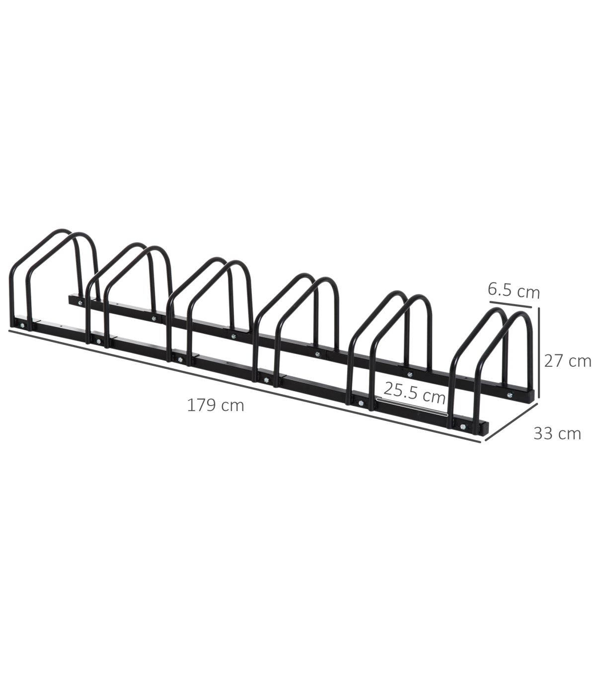 - "6 Bike Parking Rack Locking Storage Stand Holder Floor Wall Mount Black HOMCOM" - Description: - HOLDS SIX BIKES: Keeps them secure – perfect for garages, sheds, workplaces etc. - Can be floor or wall mounted. - DETACHABLE: Can be used as a single bike stand, suitable for smaller spaces. - SOLID STEEL: Galvanised surface is strong and durable, suitable for outdoors. - DIMENSIONS: 27H x 179L x 33Wcm. - Individual stand width: 6.5cm. - Space between racks: 25.5cm. - SIMPLE ASSEMBLY REQUIRED.
