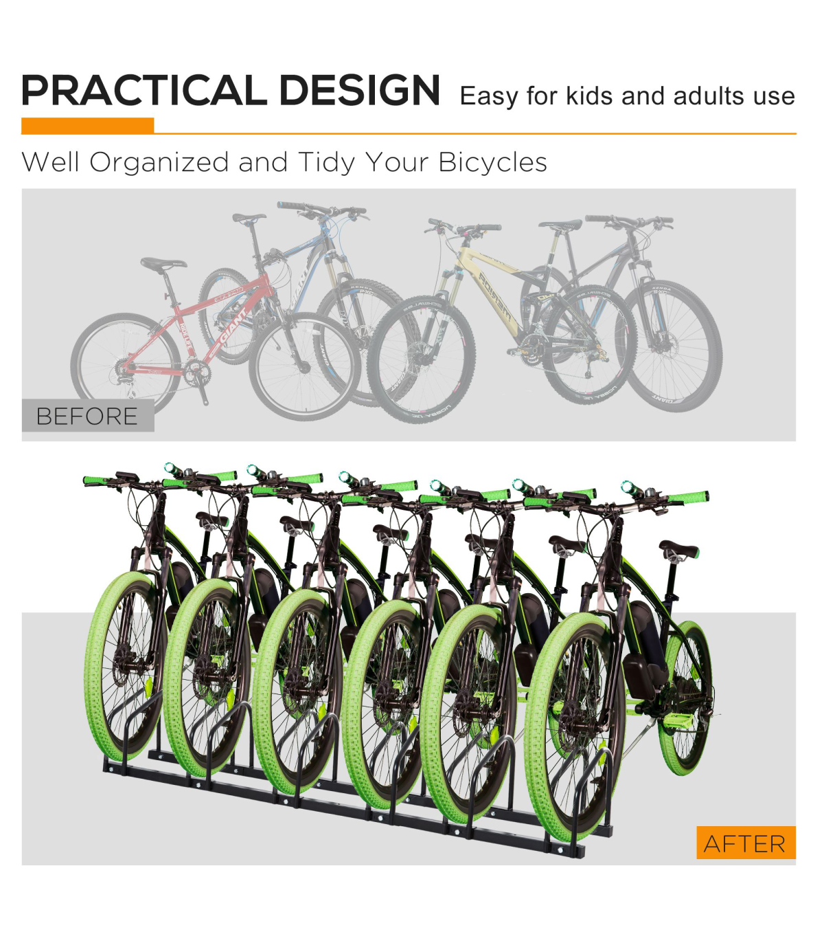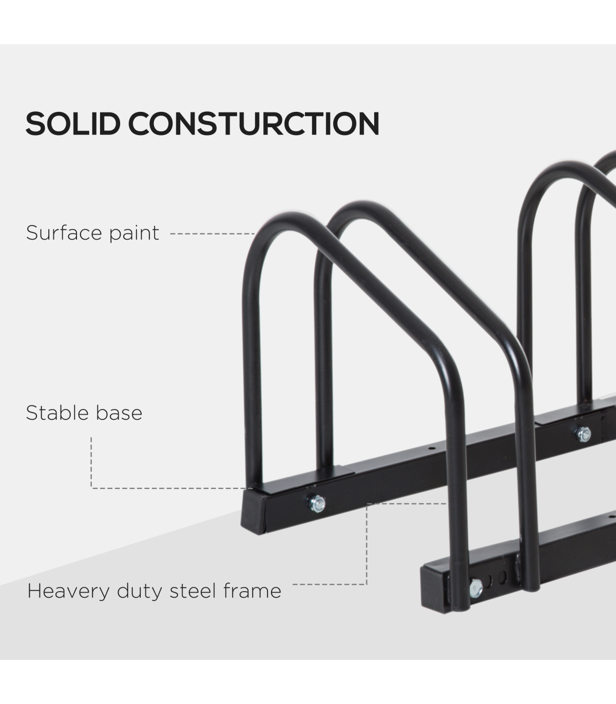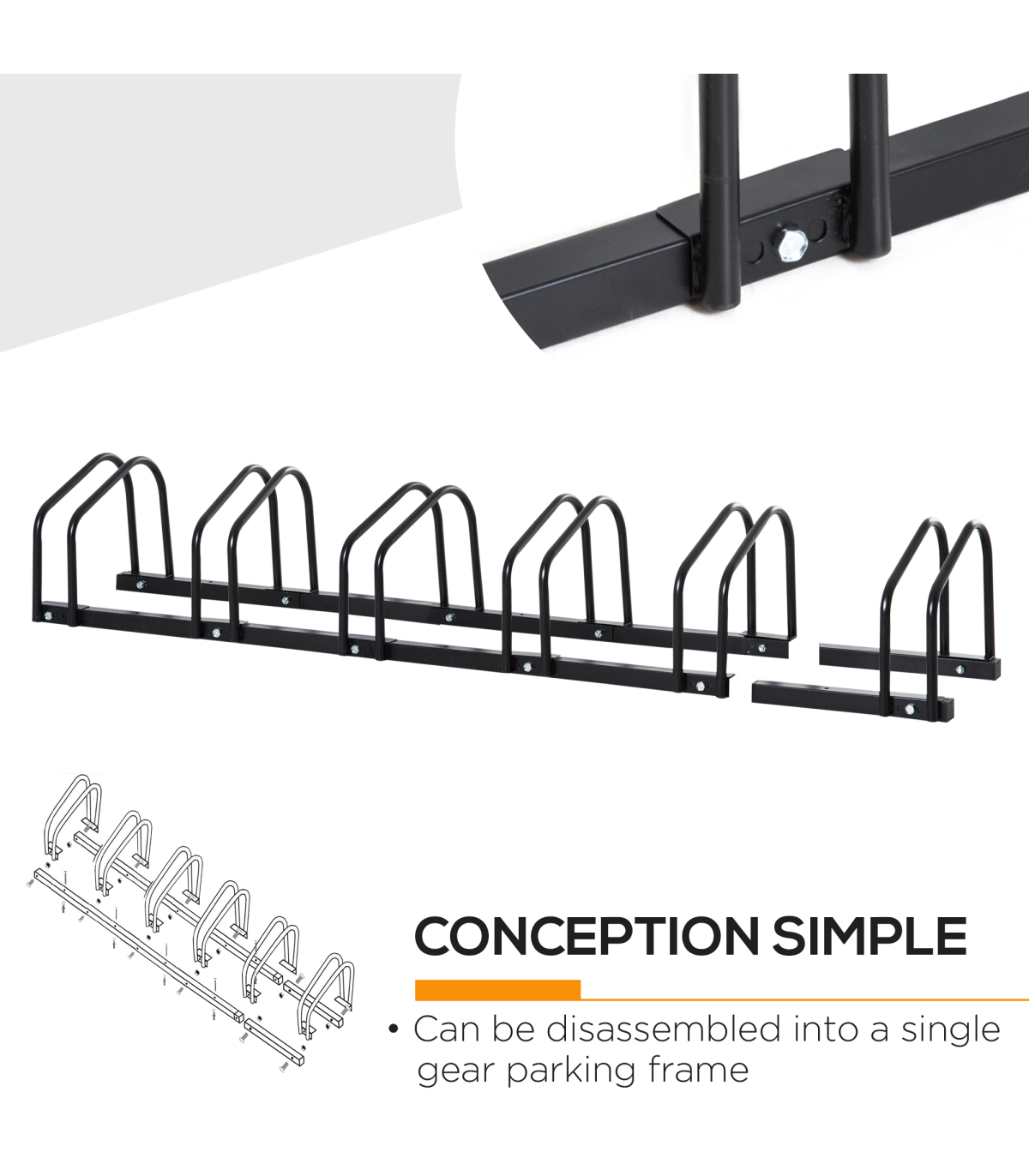 - "6 Bike Parking Rack Locking Storage Stand Holder Floor Wall Mount Black HOMCOM" - Description: - HOLDS SIX BIKES: Keeps them secure – perfect for garages, sheds, workplaces etc. - Can be floor or wall mounted. - DETACHABLE: Can be used as a single bike stand, suitable for smaller spaces. - SOLID STEEL: Galvanised surface is strong and durable, suitable for outdoors. - DIMENSIONS: 27H x 179L x 33Wcm. - Individual stand width: 6.5cm. - Space between racks: 25.5cm. - SIMPLE ASSEMBLY REQUIRED.