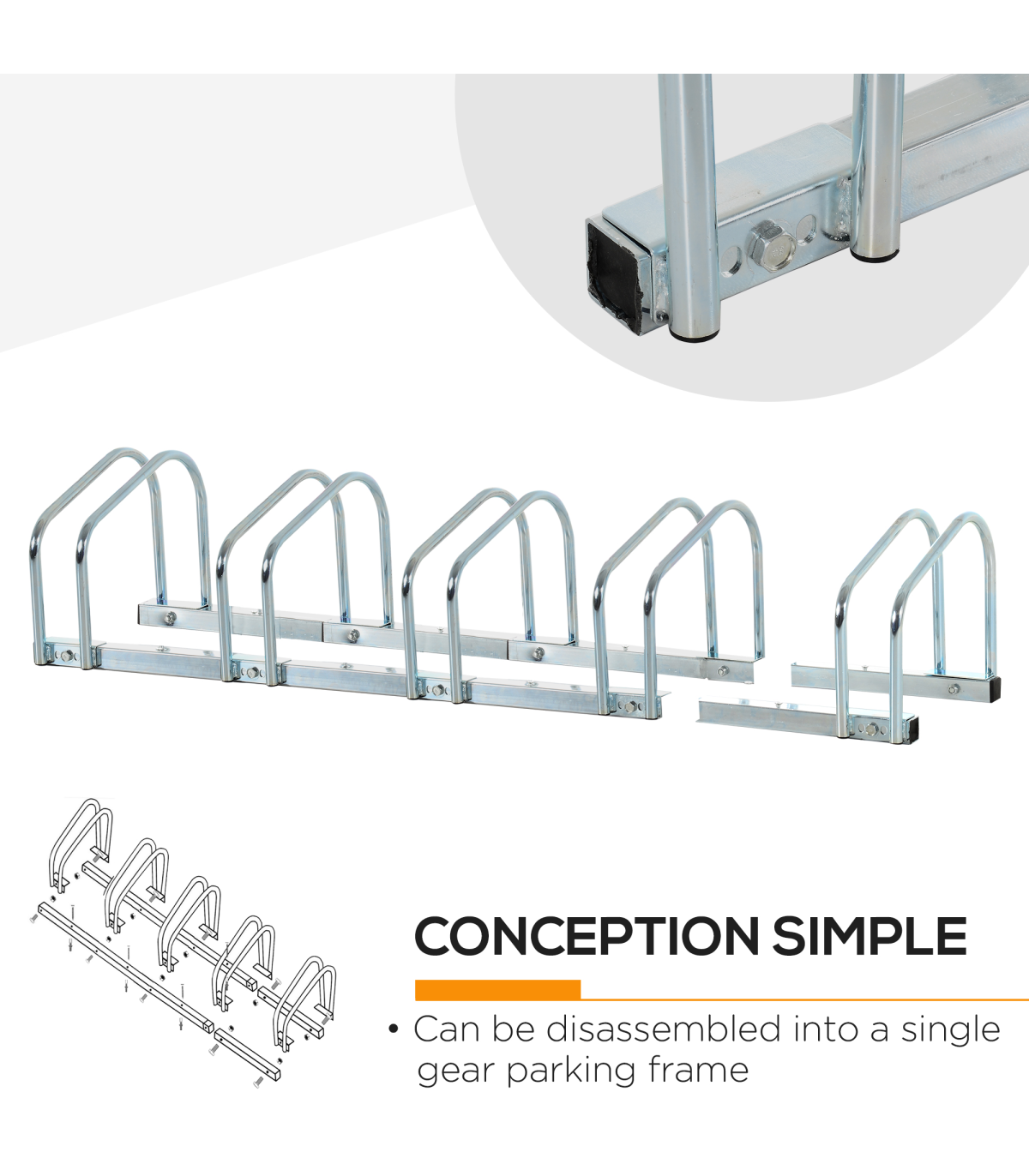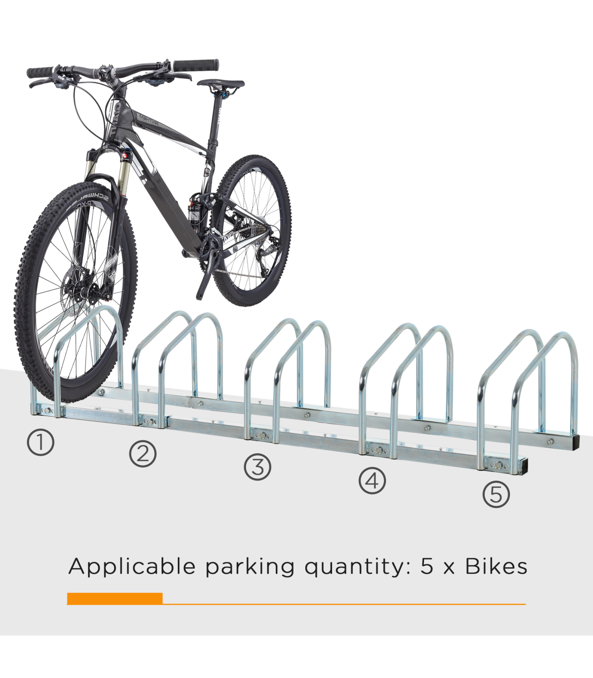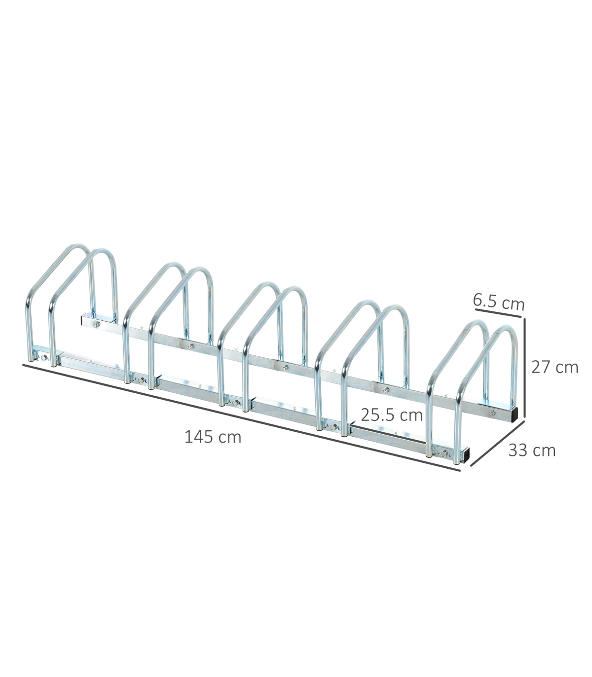 - "5 Bike Parking Rack Locking Storage Stand Holder Floor Wall Mount HOMCOM" - Description: - HOLDS FIVE BIKES: Keeps them secure - perfect for garages, sheds, workplaces etc. - Can be floor or wall mounted. - DETACHABLE: Can be used as a singular bike stand, suitable for smaller spaces. - SOLID STEEL: Galvanised surface is strong and durable, suitable for outdoors. - DIMENSIONS: 27H x 145L x 33W. - Individual stand width: 6.5cm. - Space between racks: 25.5cm. - SIMPLE ASSEMBLY REQUIRED.