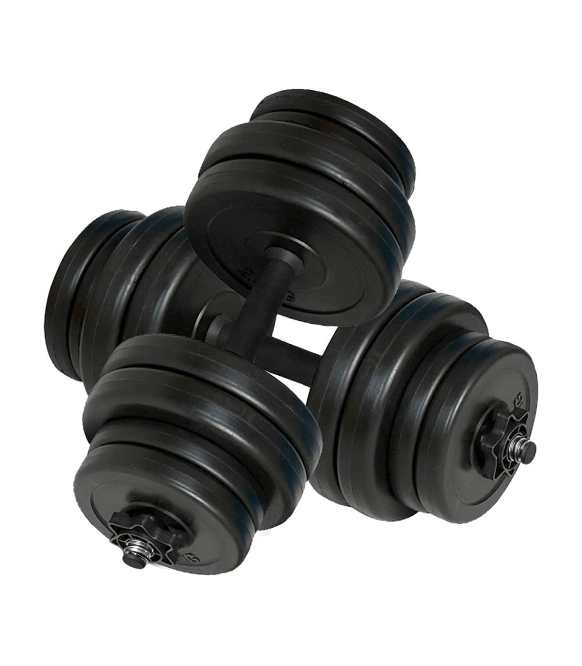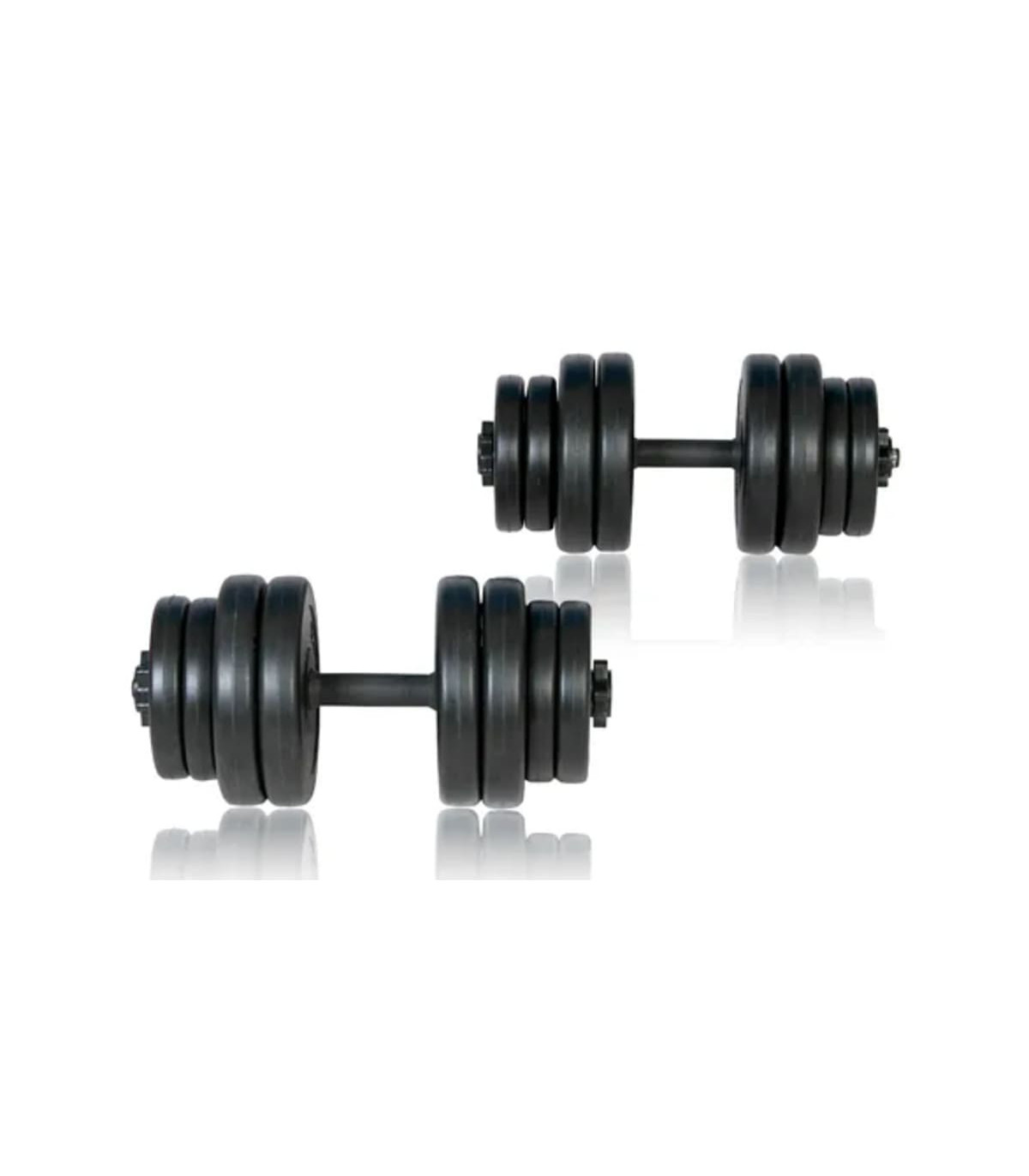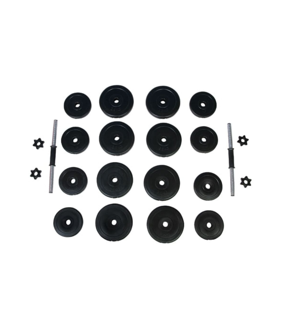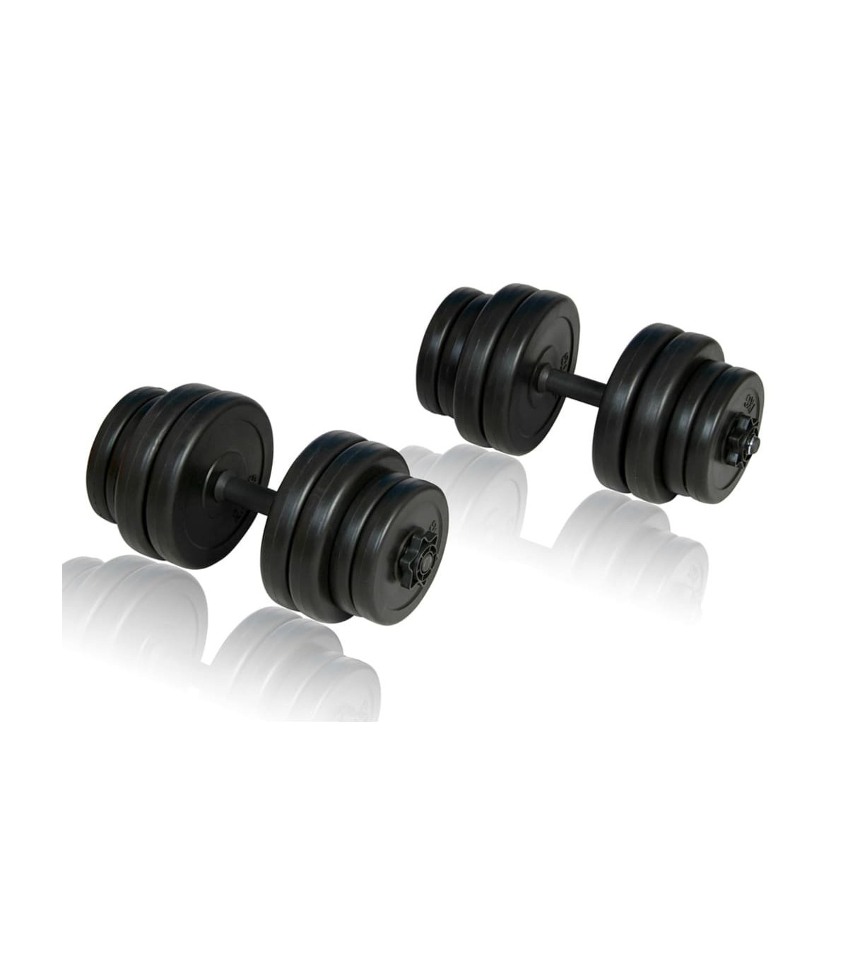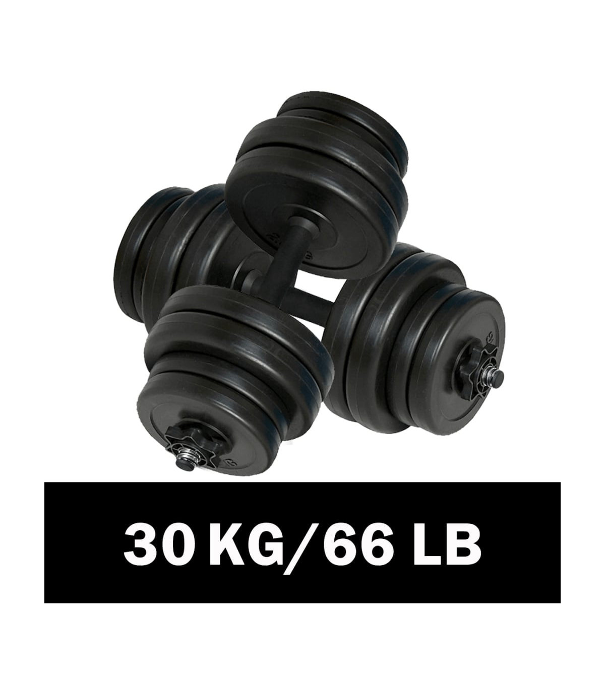 This ergonomic dumbbell set has a total weight of 30 kg(2 x 15 kg). The dumbbells have anti-slip plastic handles so you will be able to work-out without having to worry that the dumbbells will slip from your hands and fall. The screw-caps have star bolts to make sure that the weight plates are always mounted firmly and secure on the bar. The bar of the dumbbell is made of strong metal. The grip surface is approx. 14.5 cm. The weight plates are covered with robust, floor-friendly plastic, which allows you not to experience any annoying clanging sounds of the weights.