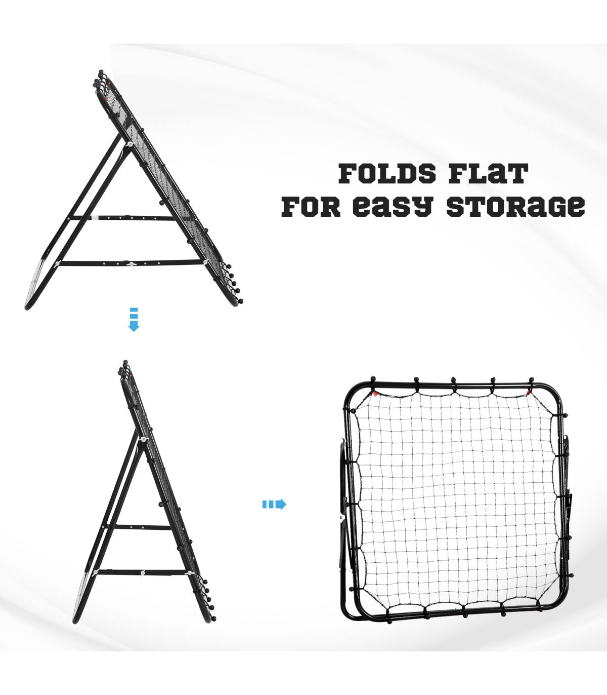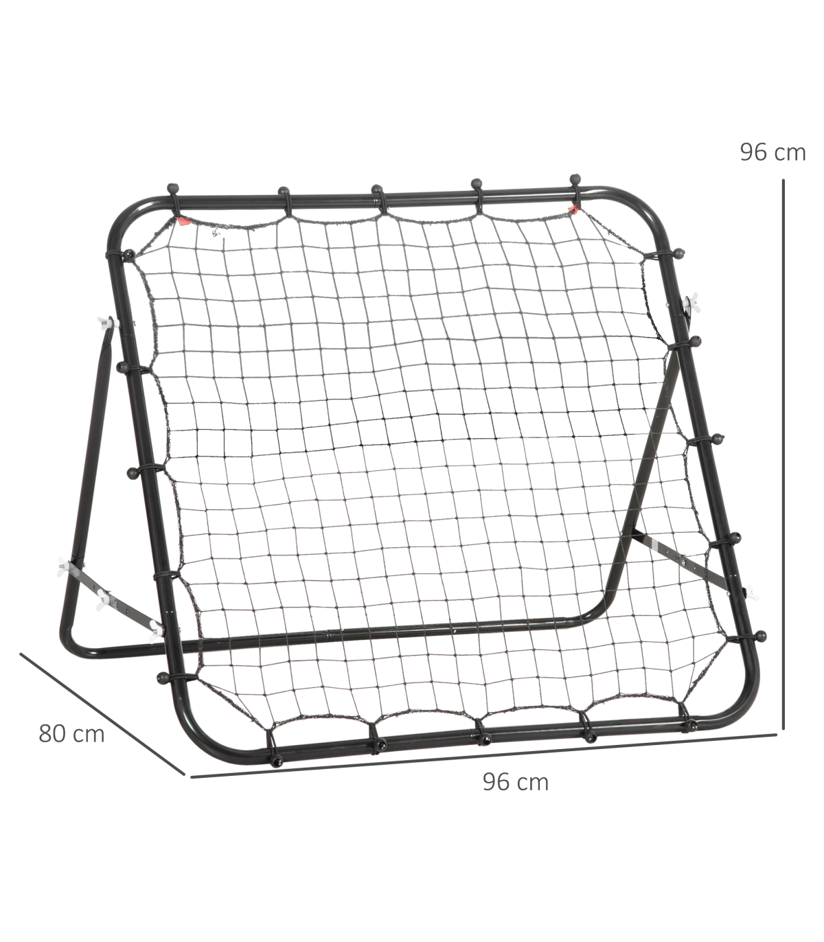 • Great for private practise or even with friends • Hits back ball which is great for improving skills and confidence, as well as building strength • Steel frame for stability and strength for years of use with adjustable angle back • Weather resistant net attached to frame via 20 elastic cords to support against high impact hits • Lightweight and easy to move and store away • Ground stakes included to secure to ground • Assembly required• Item Name: Rebounder Net • Brand Name: HOMCOM • Material Used: PE mesh, metal tube • Colour: Black • Product Dimension: 96W x 80D x 96Hcm • Net Size: 84L x 84Wcm • Net Weight: 2.8kg • Flat Pack: YES • Custom Label: A62-012BK