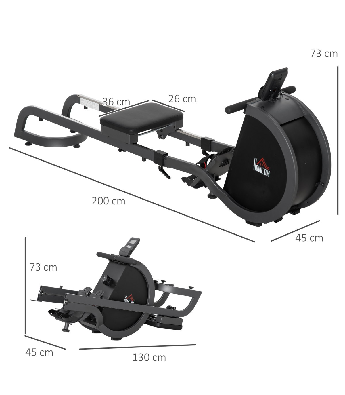 FULL WORKOUT: Rowing is an exercise that targets your back, legs, core and arms. Great for improving cardio, building strength and burning calories.16-LEVEL MAGNETIC RESISTANCE: For beginners and experts alike. Choose a resistance setting you're most comfortable with. DIGITAL MONITOR: Displays time, speed and calories burnt, allowing you to track your progress.METAL FRAME: Double aluminium siderail for extra stability, keeping you secure when in use.FOLDABLE: Easy to store when not in use, saving space.DIMENSIONS: 200L x 45W x 73H cm. Folded: 130L x 45W x 73H cm. MAXIMUM LOAD 130KG.