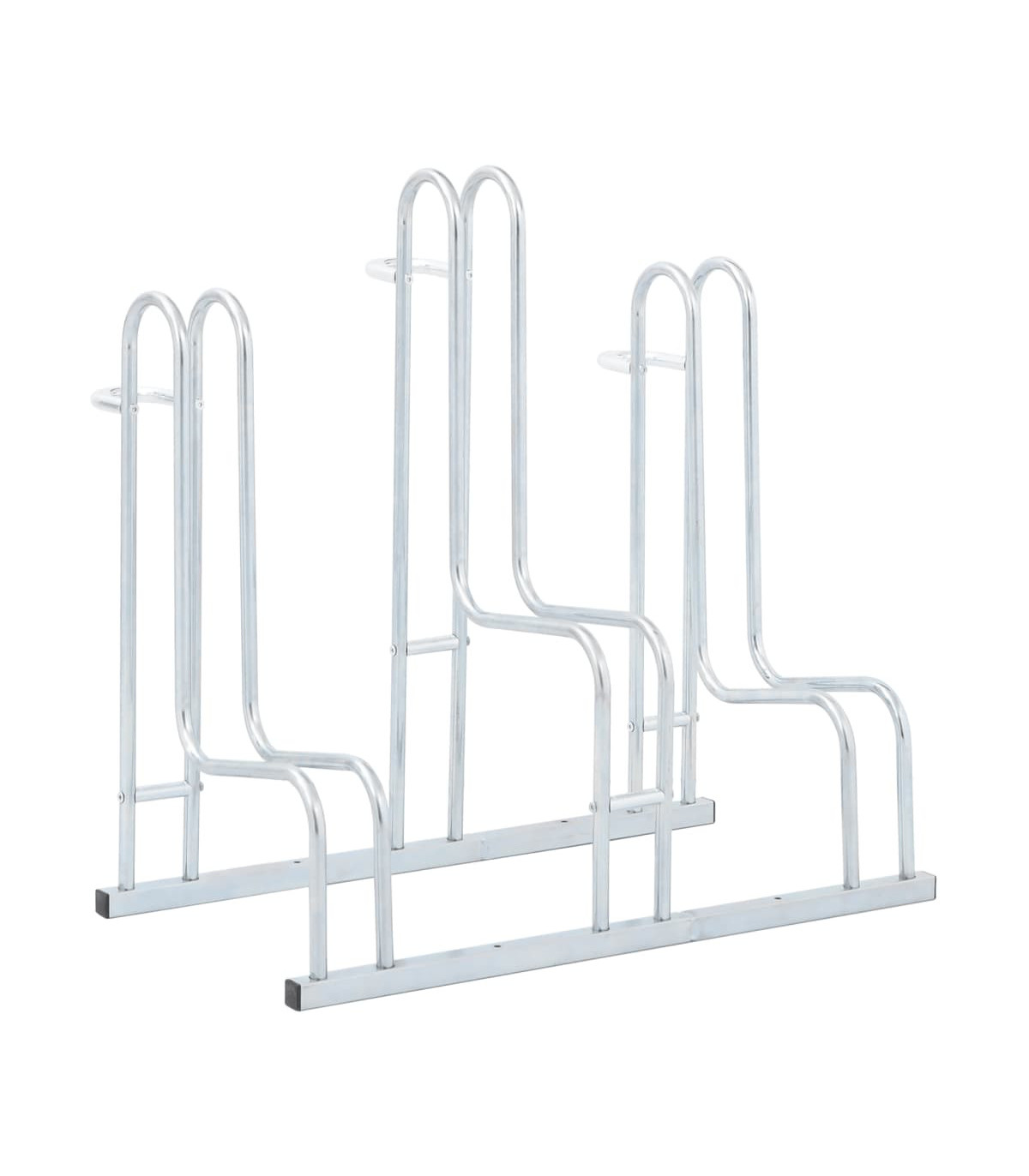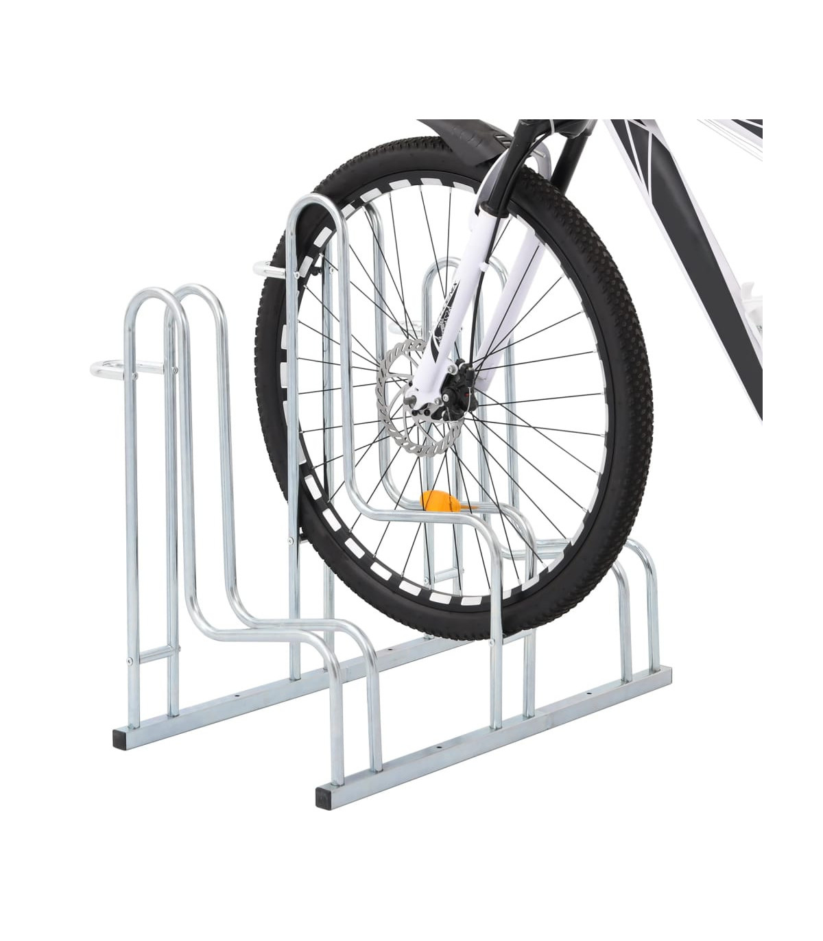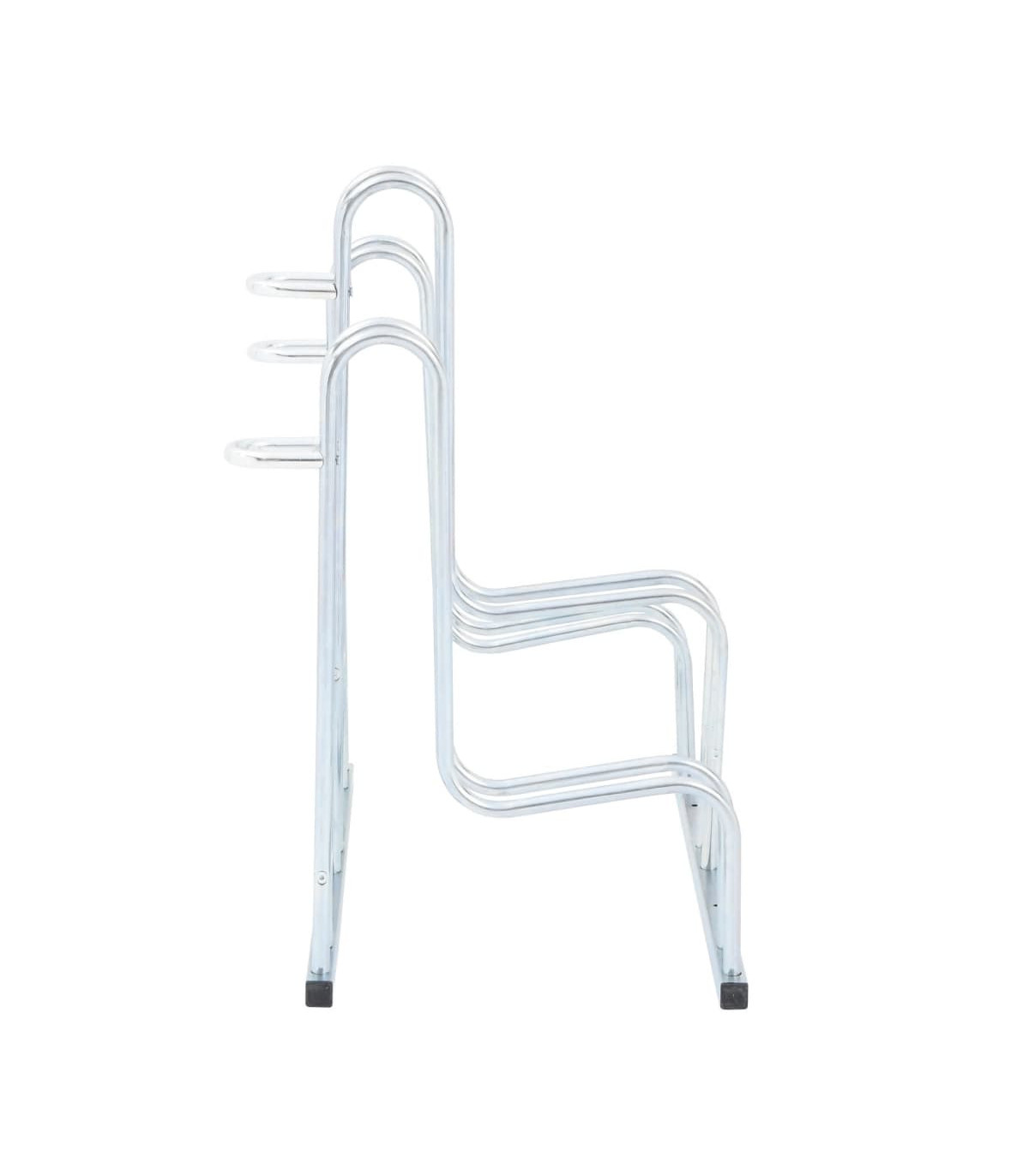 Utilise this bicycle stand to safely and efficiently park your bikes, saving valuable space.Sturdy and long-lasting: This bicycle stand is made of galvanised steel, making it sturdy, corrosion-resistant, long-lasting, and lightweight for easy movement.Space-saving: This bicycle stand has a high-low wheel design and accommodates three bikes without handlebar tangling, optimising space for efficient parking.Stable structure: You can fasten the bicycle stand securely using the provided screws to prevent your bike from tipping or falling, ensuring it remains stable. The stand’s high brackets offer optimal protection for your bike’s rims, making it ideal for various standard mountain bikes, e-bikes, and more.Wide applications: The bicycle stand is perfect for accommodating multiple bikes with tyre widths of up to 55 mm and is suitable for indoor and outdoor use in various settings, including garages, warehouses, schools, shops, and more.
