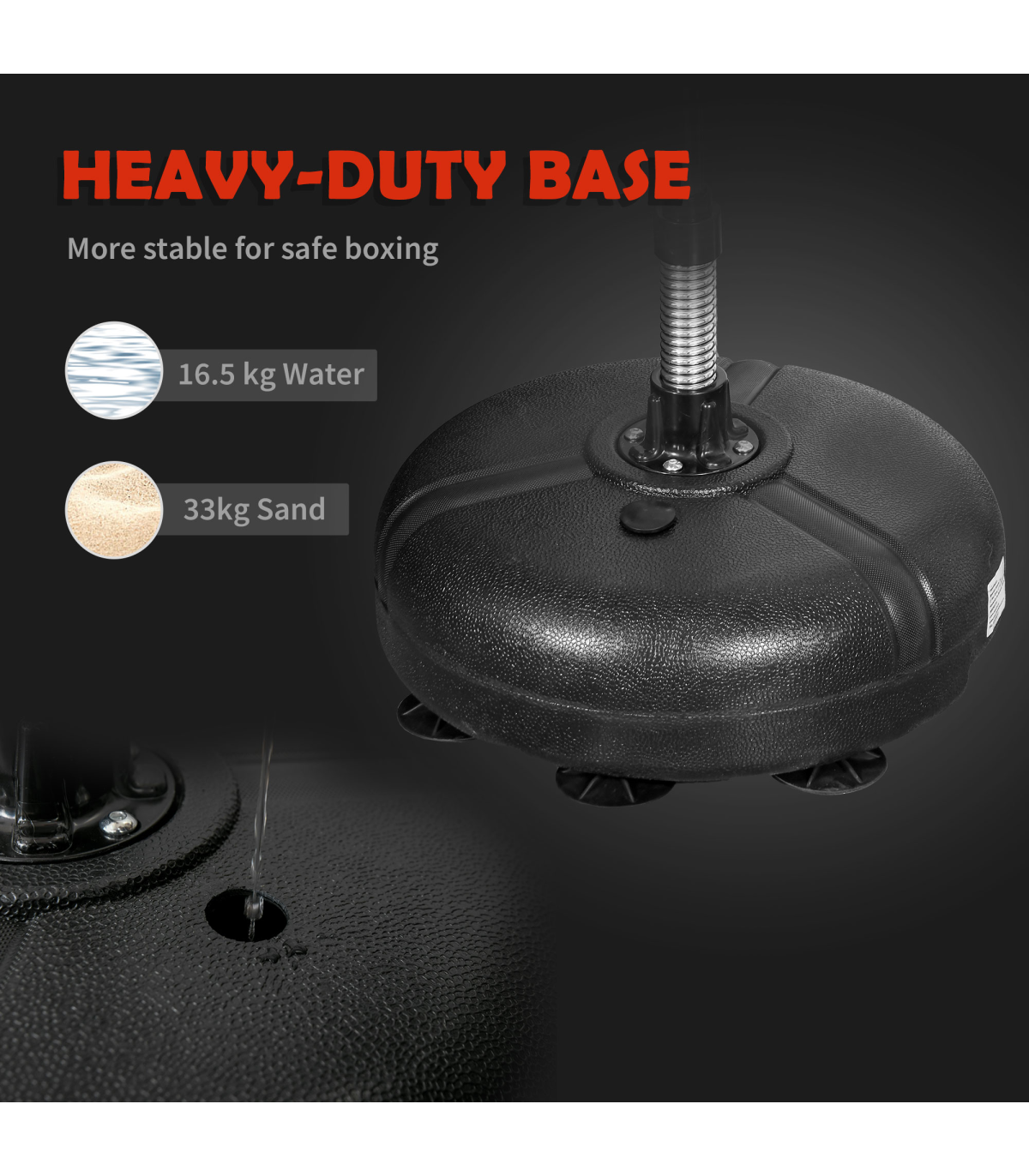 - Stable Base: The base can be filled with 16.5kg of water or 33kg of sand, providing excellent stability during use, complemented with suction cups to enhance grip.