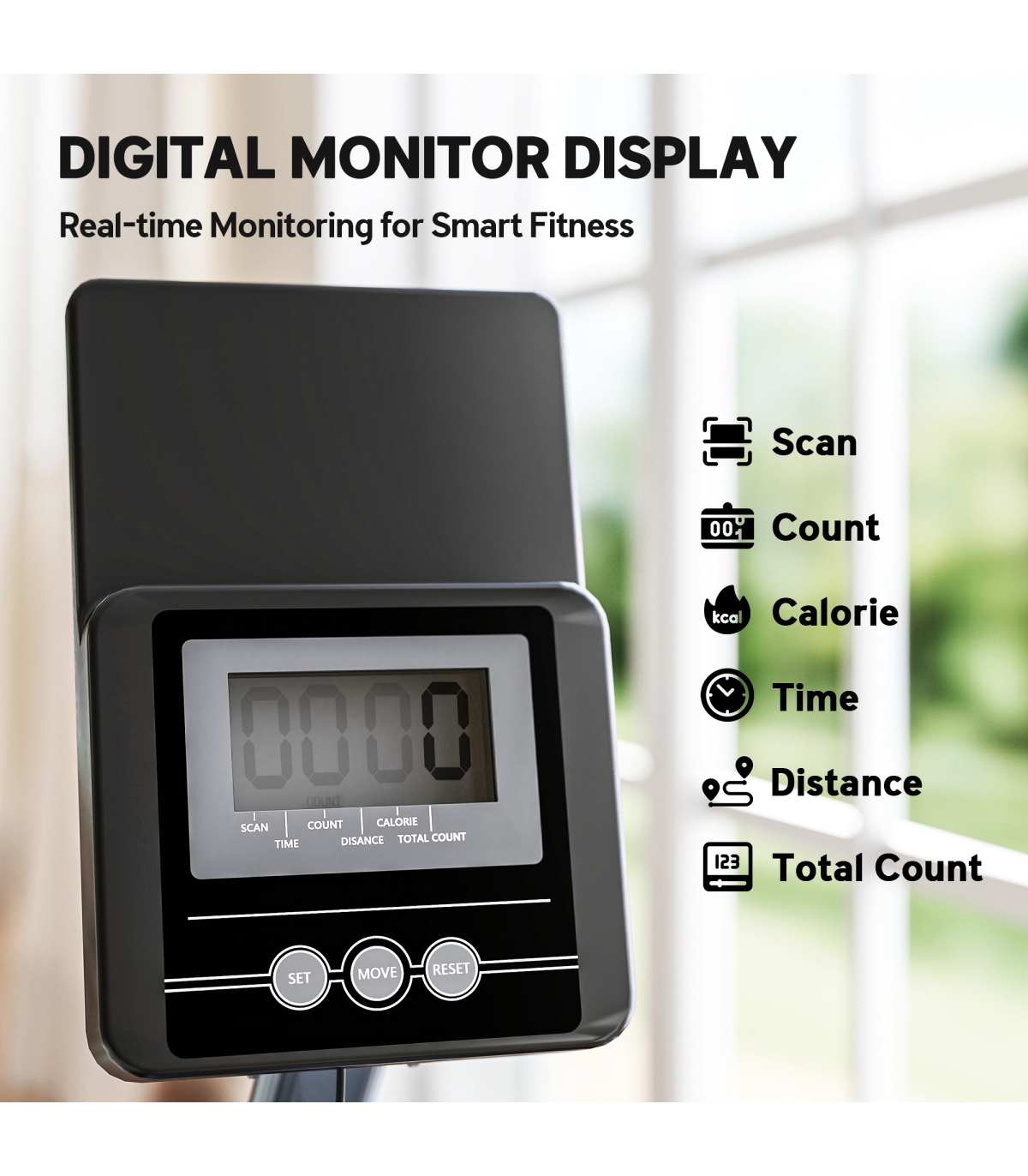 ● LCD screen displays reps, calories, distance, speed and time