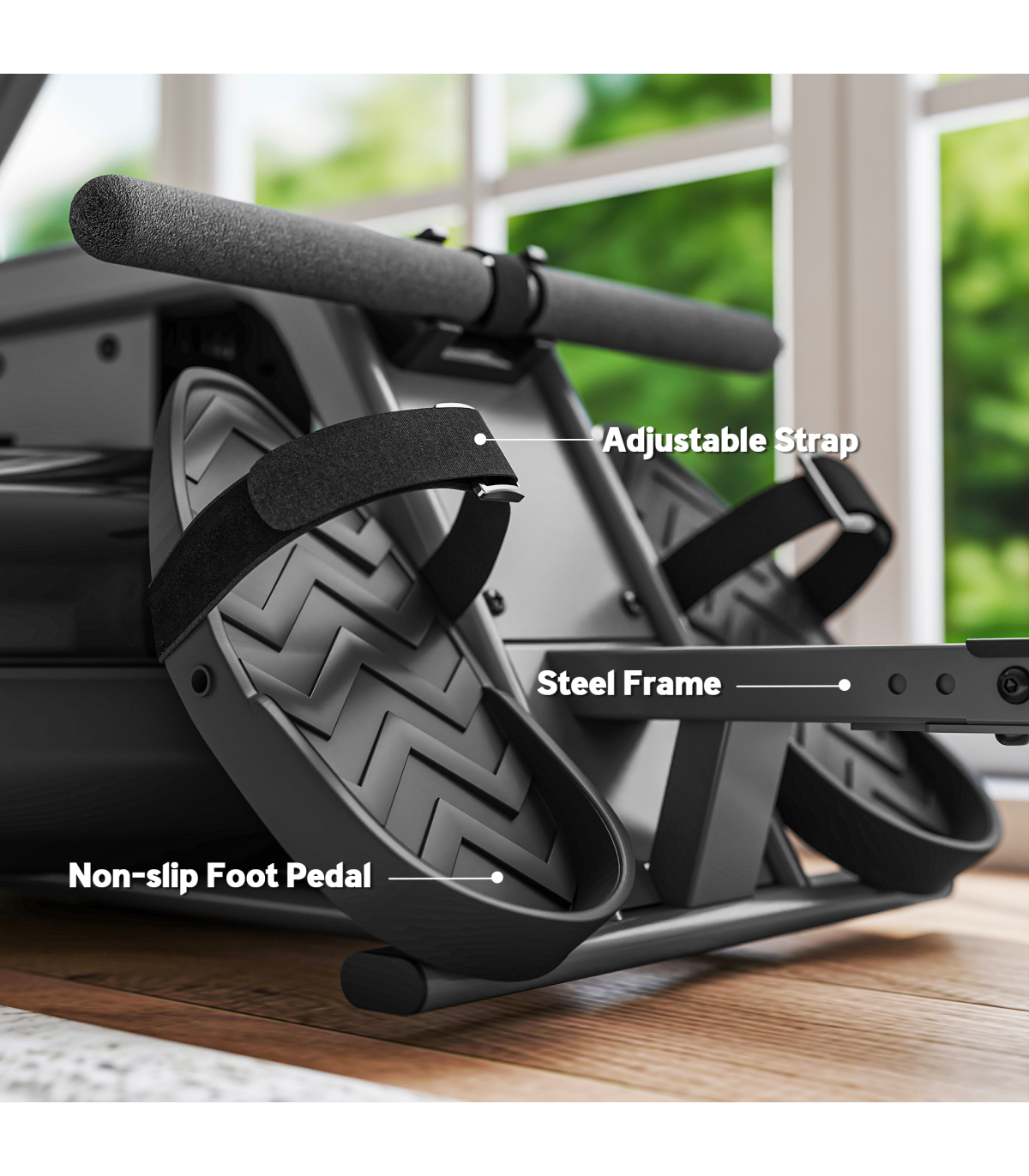 ● Non-slip, textured pedals with adjustable straps enhance safety