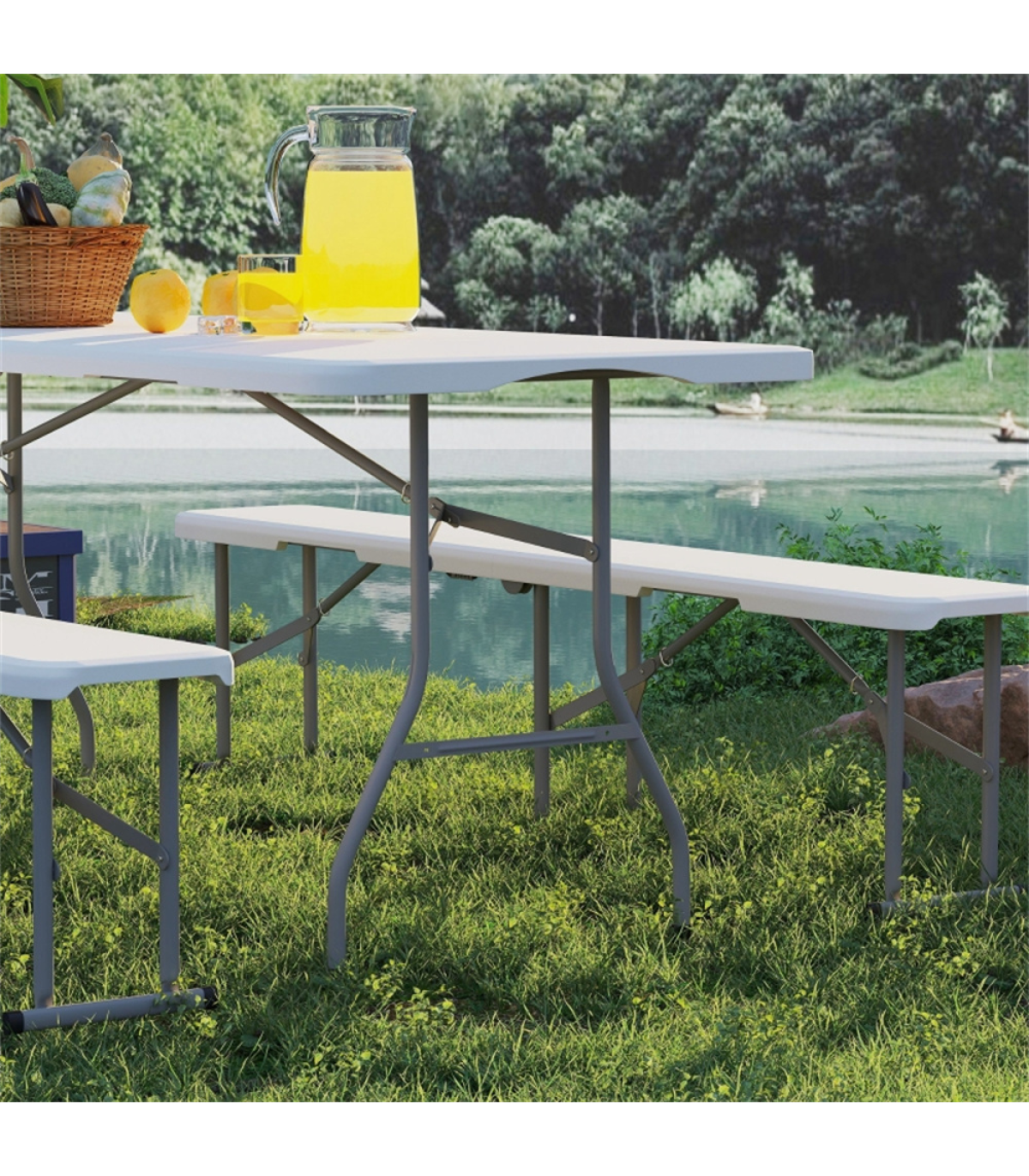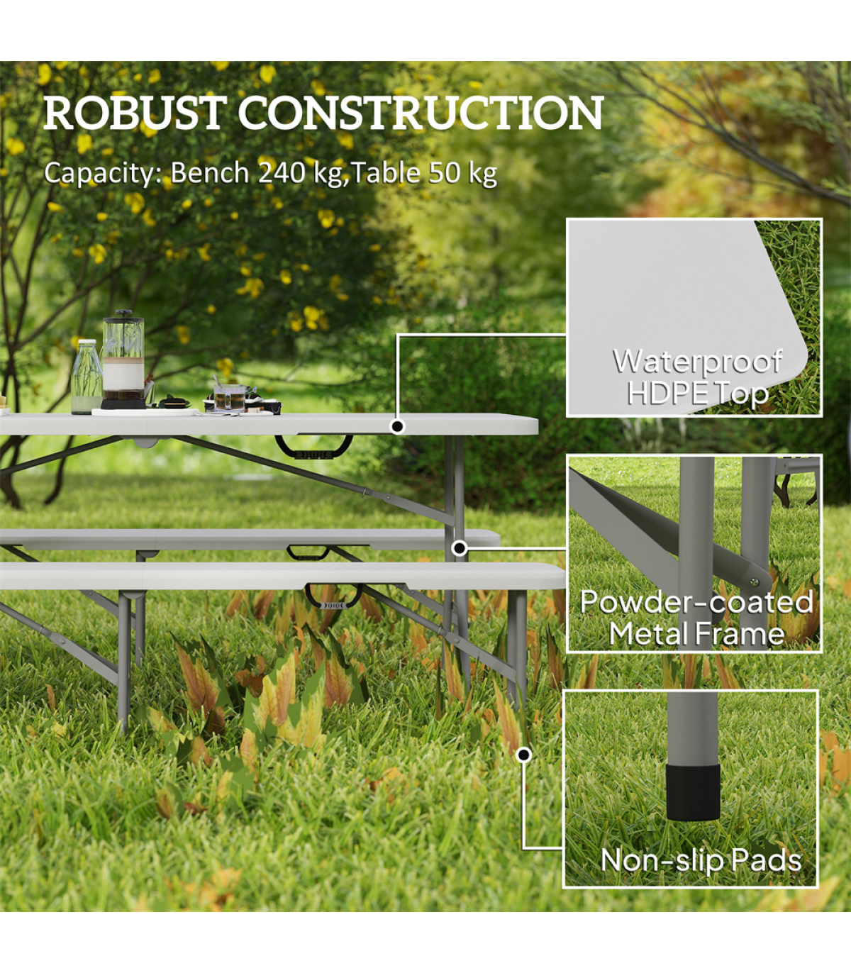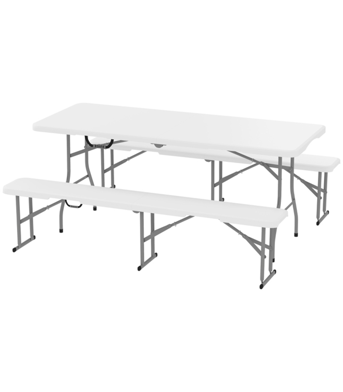 - - Three-piece set includes table and two benches