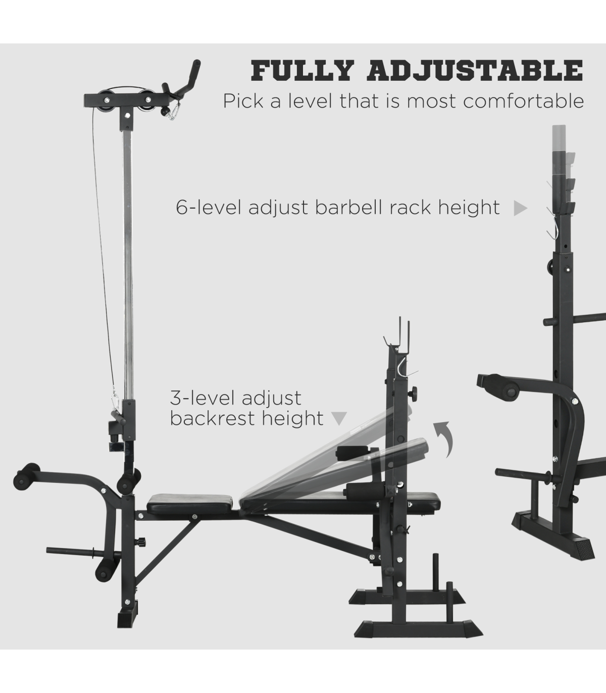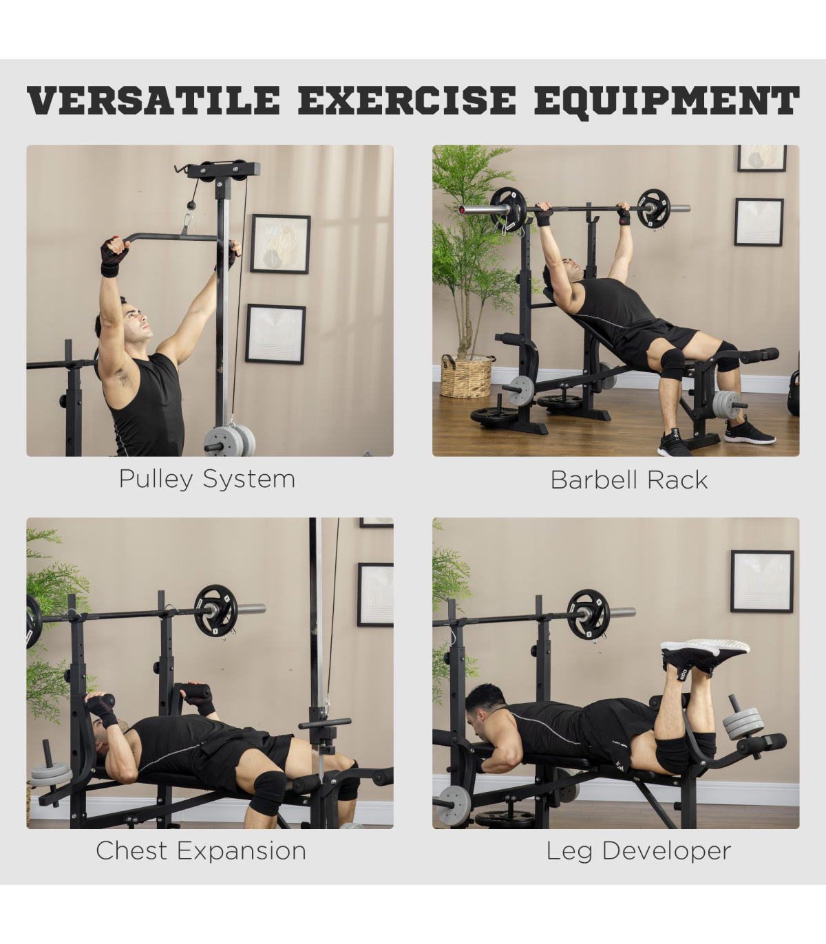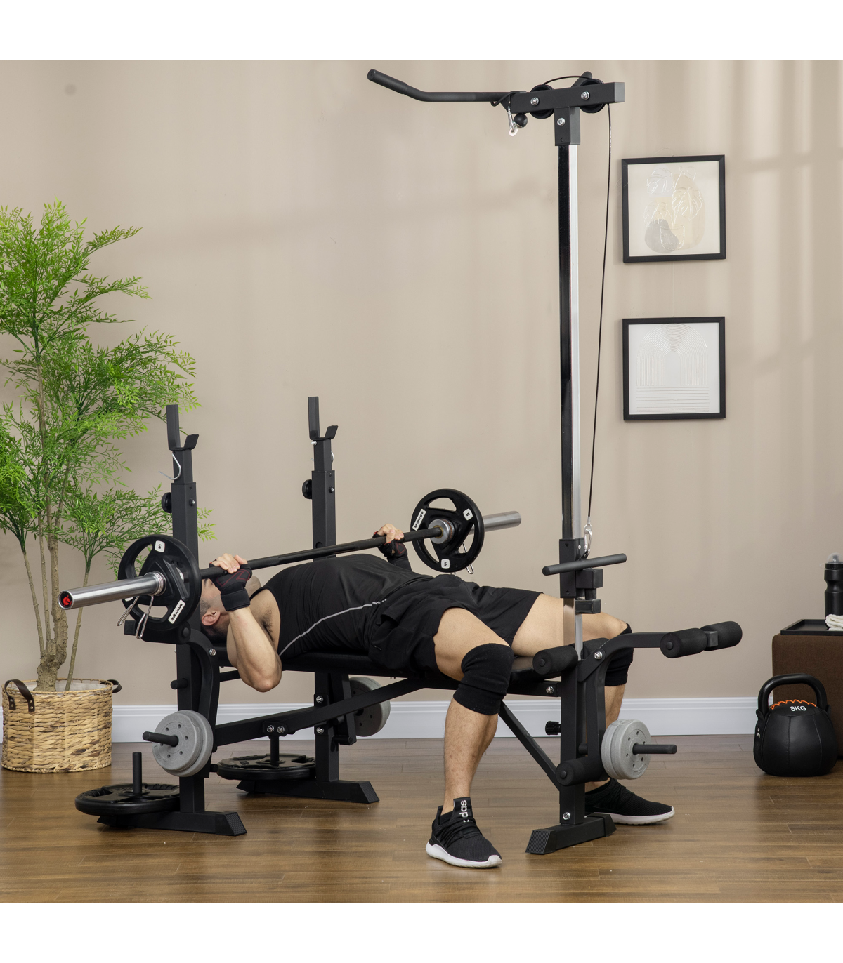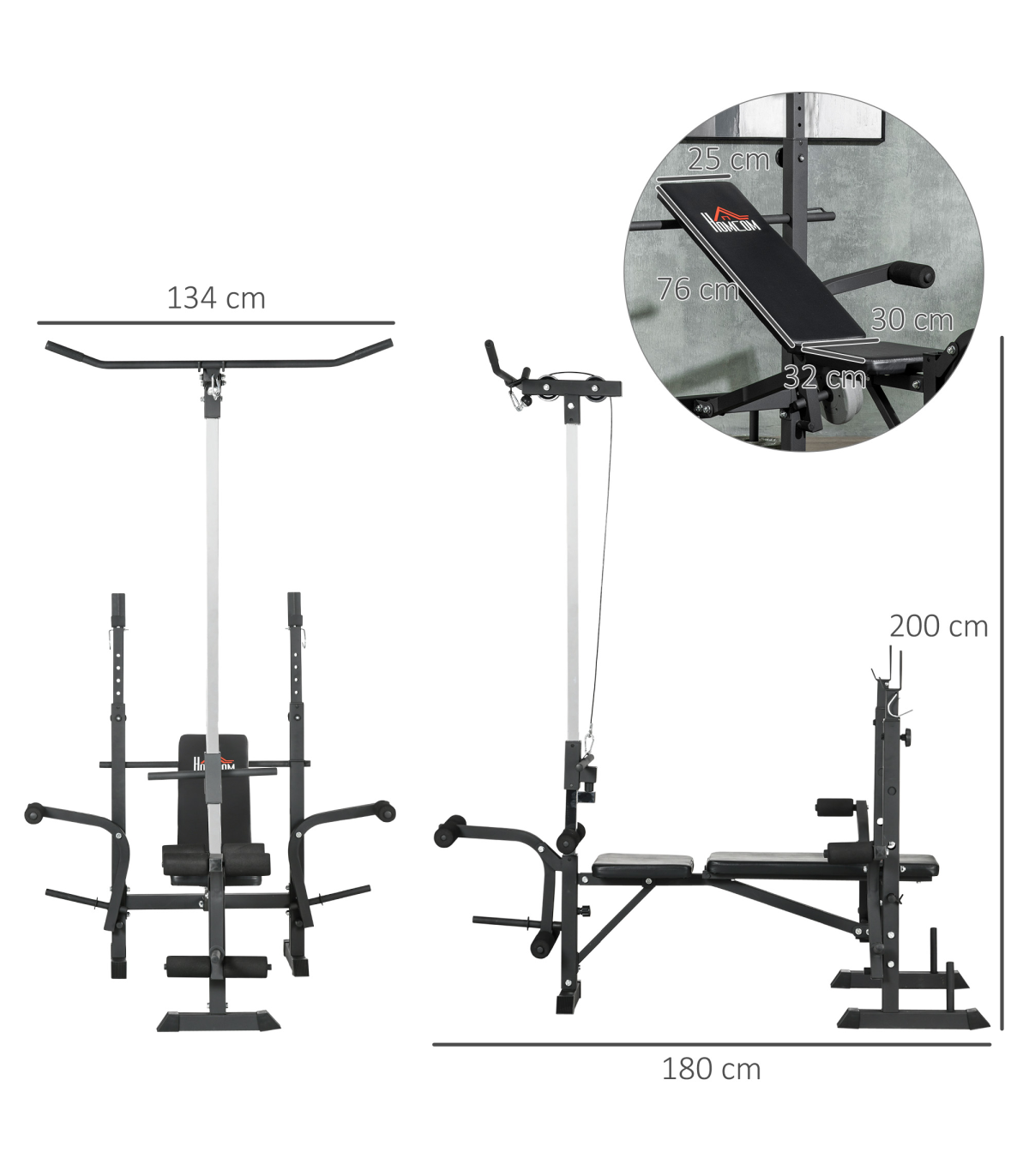 ● Weight capacity: 150 kg (bench), 100 kg (barbell rack), 25 kg (single chest fly/pulley system)