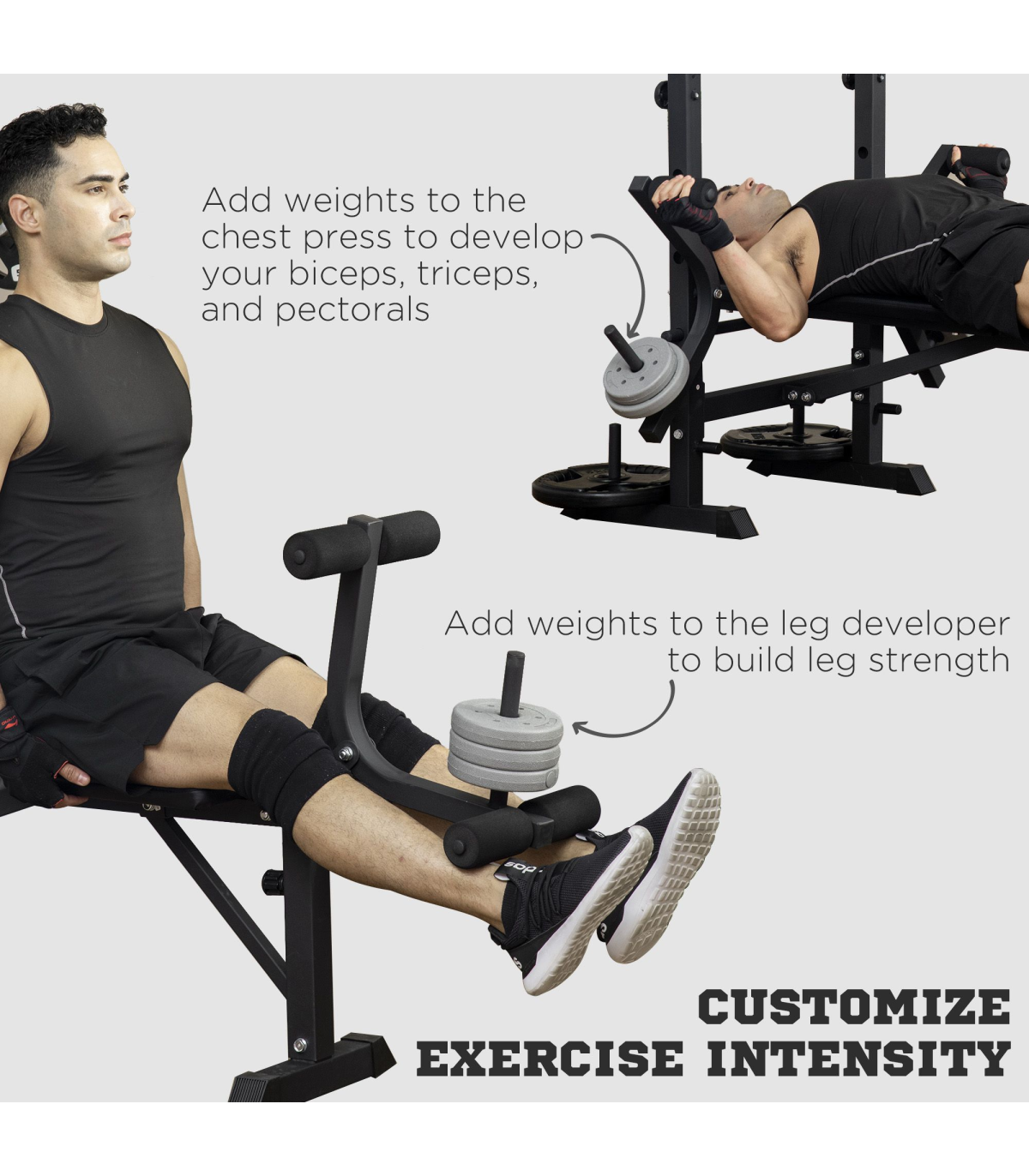 ● Bench adjusts to three positions for flat or incline use