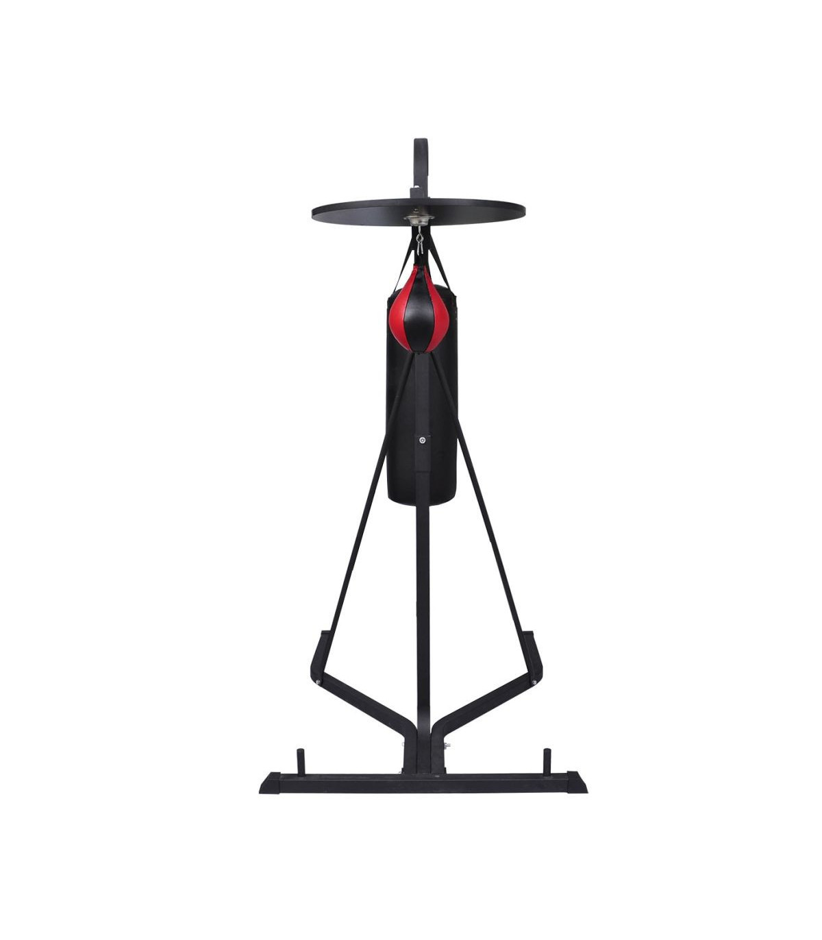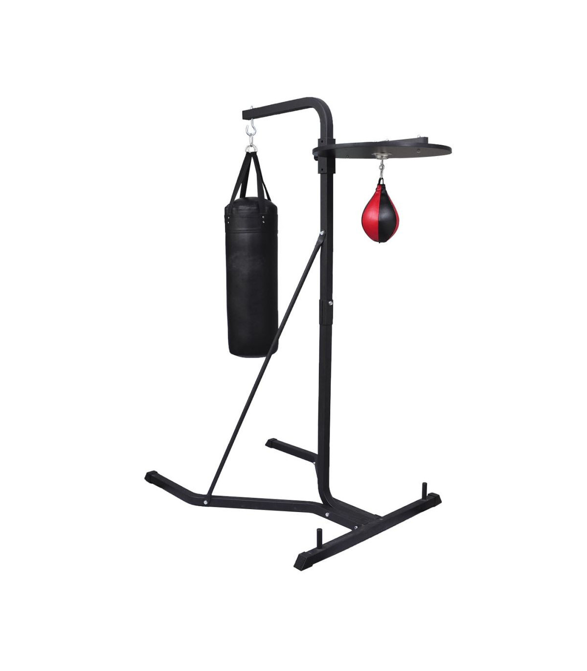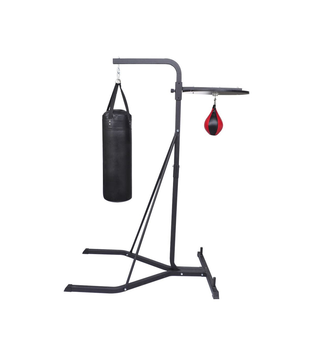 This boxing stand can help improve punching, speed and co-ordination, allowing users to practice and develop punching and kicking techniques. This boxing stand comes complete with the combination of the steel frame, the punching bag, the speedball and its platform. They are suitable for both home and gym use. This stand is made of robust steel, which will guarantee a safe workout. At the end of the feet there are the black bumper end caps which can put weights on to keep the bench more stable, even on an uneven or slippery surface. Hightlights: Punching Bag: 29 x 81 cm (Φ x H), with the weight of 20 kg.Inflatable Speedball: 16 x 28 (Φ x H), with the weight of 0.3 kg.Speedball Platform: Φ 60 cm, with 4 adjustable level from 177.5 cm to 162 cmPainted Steel Frame: with the net weight about 42 kg and the thickness of 1.5 mmDelivery includes 1 x boxing stand frame, 1 x punching bag, 1 x speedball and 1 x speedball platform, including all the mounting accessories.