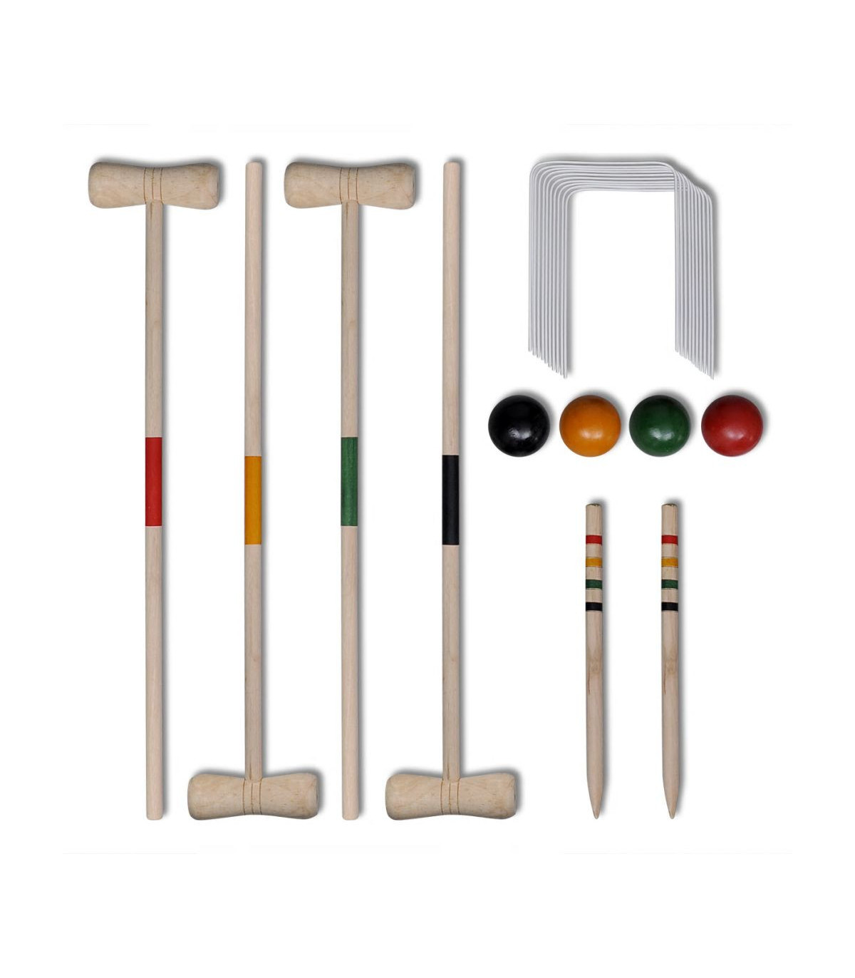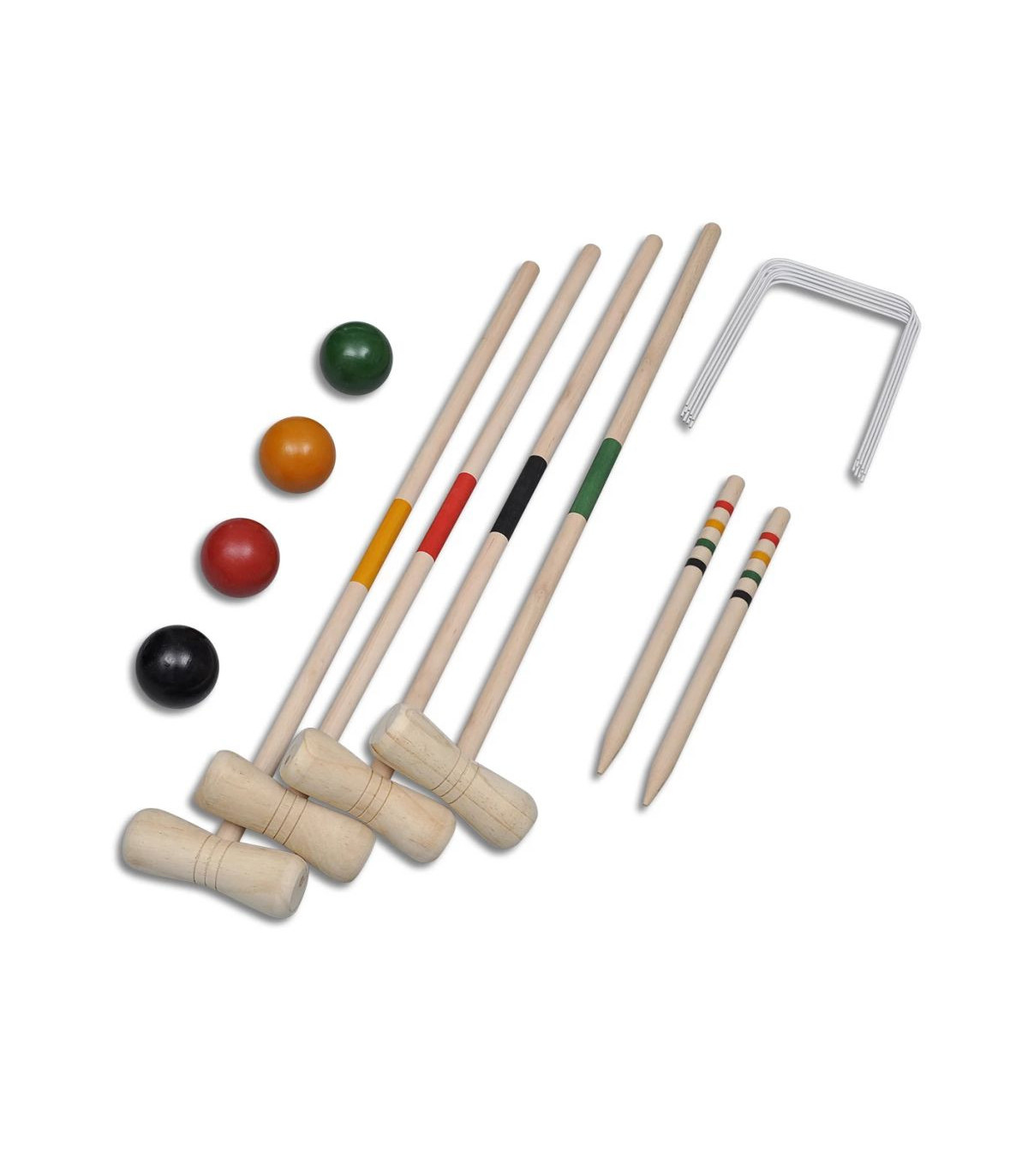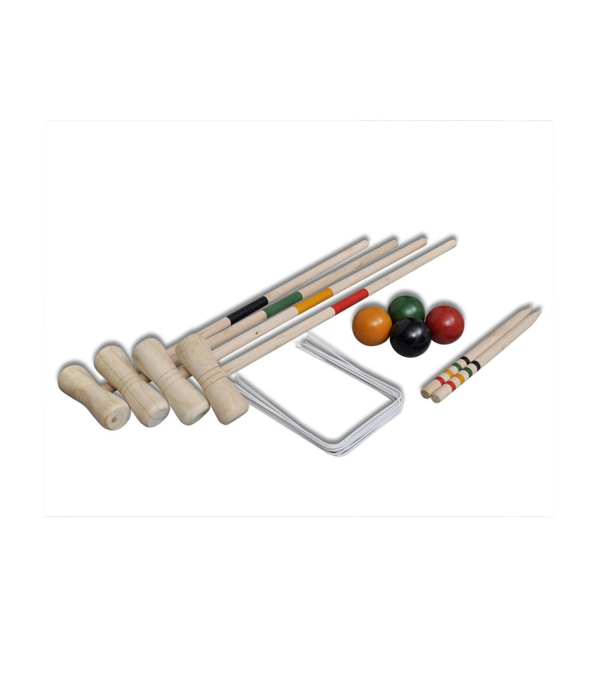 This traditional wooden croquet set, suitable for 4 players, is perfect for playing in the garden or at the beach. Made of solid pine wood, the croquet set is sturdy and strong for years of fun. This outdoor game requires concentration and strategy, yet it is fun and engaging for players of all ages (aged 3+). Players or teams compete by using a mallet to knock a ball through several wickets arranged on the playing field, scoring points for each wicket. Bring this croquet set along and enjoy a wonderful game with your family or friends! Delivery includes 4 wooden striped mallets, 4 coloured balls, 2 wooden striped pegs and 10 hoops.